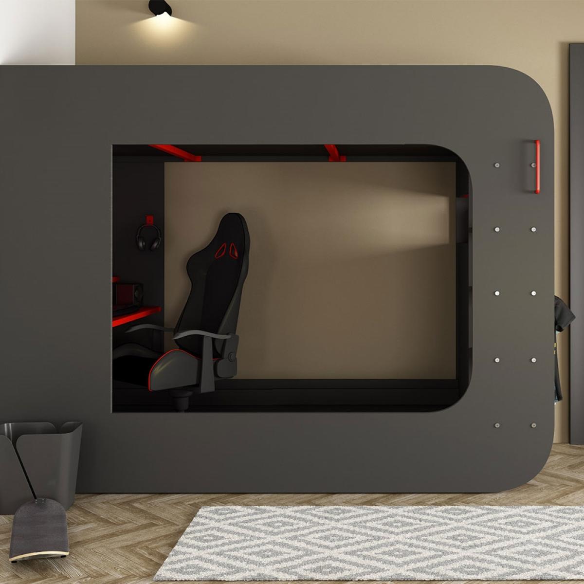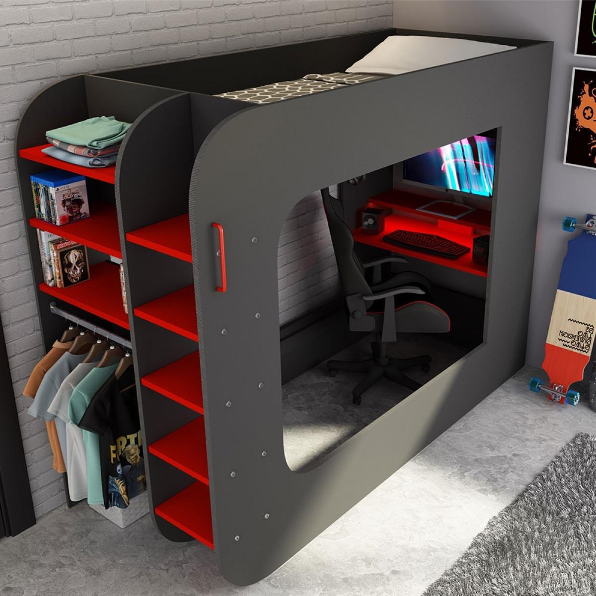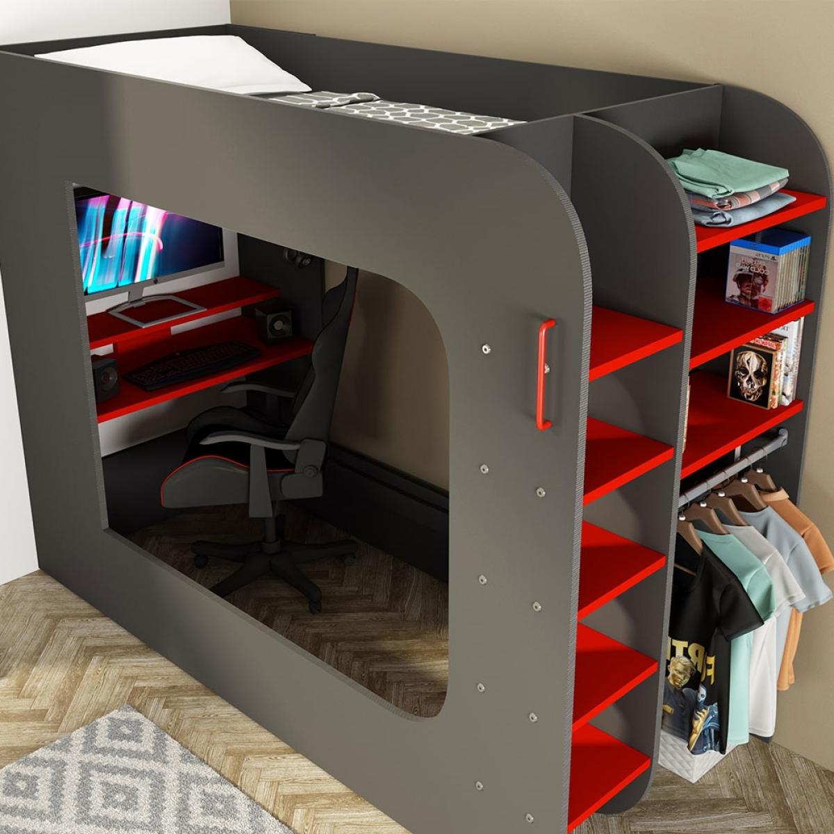 Calling all gamers - hit start on the day with the Trasman Pod Solo 1 Gaming Bed. The number one feature - the height adjustable gaming desk! Including a raised shelf and featuring LED lighting, set the scene when gameplay intensifies, kids can change the colour to fit the mood! With a headphone hook to the side of the desk and an optional wireless charger, your pro-gamer will have everything they need to score big and unlock all achievements. When they need to pause and re-think gaming strategy, they can head up to bed and recharge their batteries. Featuring plenty of storage space at the end of the gaming bed, including a hanging rail and three shelves - tees, discs, books and memorabilia can be kept neat and tidy making it a practical addition to their bedroom. With everything they need in one space, the Trasman Solo Gaming Bed is every teens dream!.