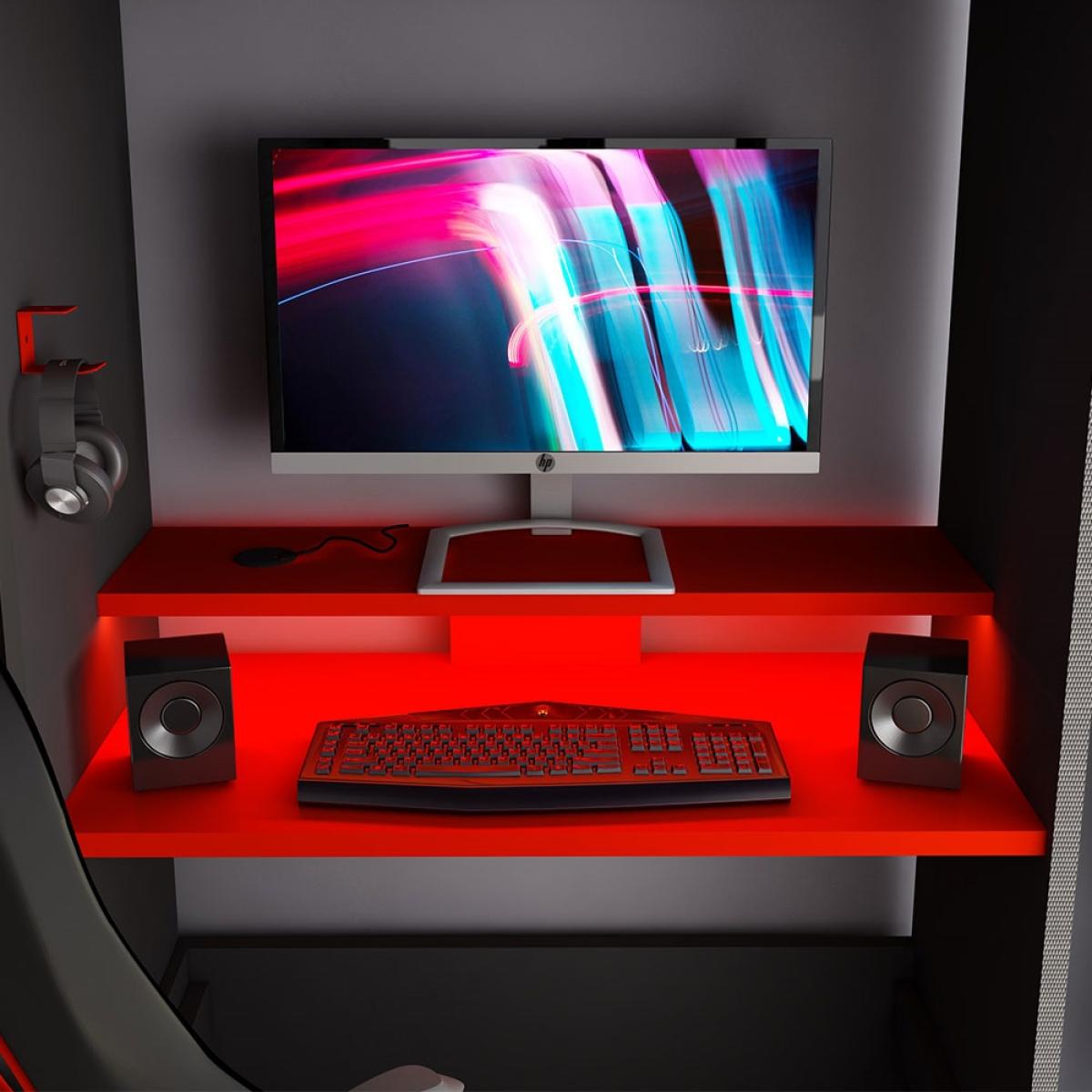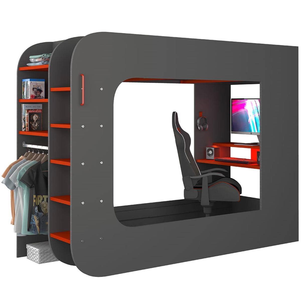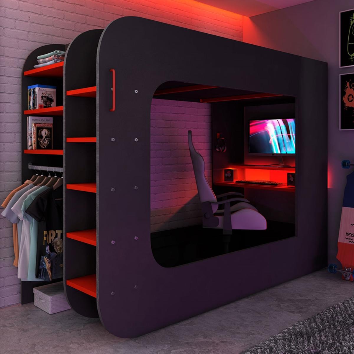 Calling all gamers - hit start on the day with the Trasman Pod Solo 1 Gaming Bed. The number one feature - the height adjustable gaming desk! Including a raised shelf and featuring LED lighting, set the scene when gameplay intensifies, kids can change the colour to fit the mood! With a headphone hook to the side of the desk and an optional wireless charger, your pro-gamer will have everything they need to score big and unlock all achievements. When they need to pause and re-think gaming strategy, they can head up to bed and recharge their batteries. Featuring plenty of storage space at the end of the gaming bed, including a hanging rail and three shelves - tees, discs, books and memorabilia can be kept neat and tidy making it a practical addition to their bedroom. With everything they need in one space, the Trasman Solo Gaming Bed is every teens dream!.