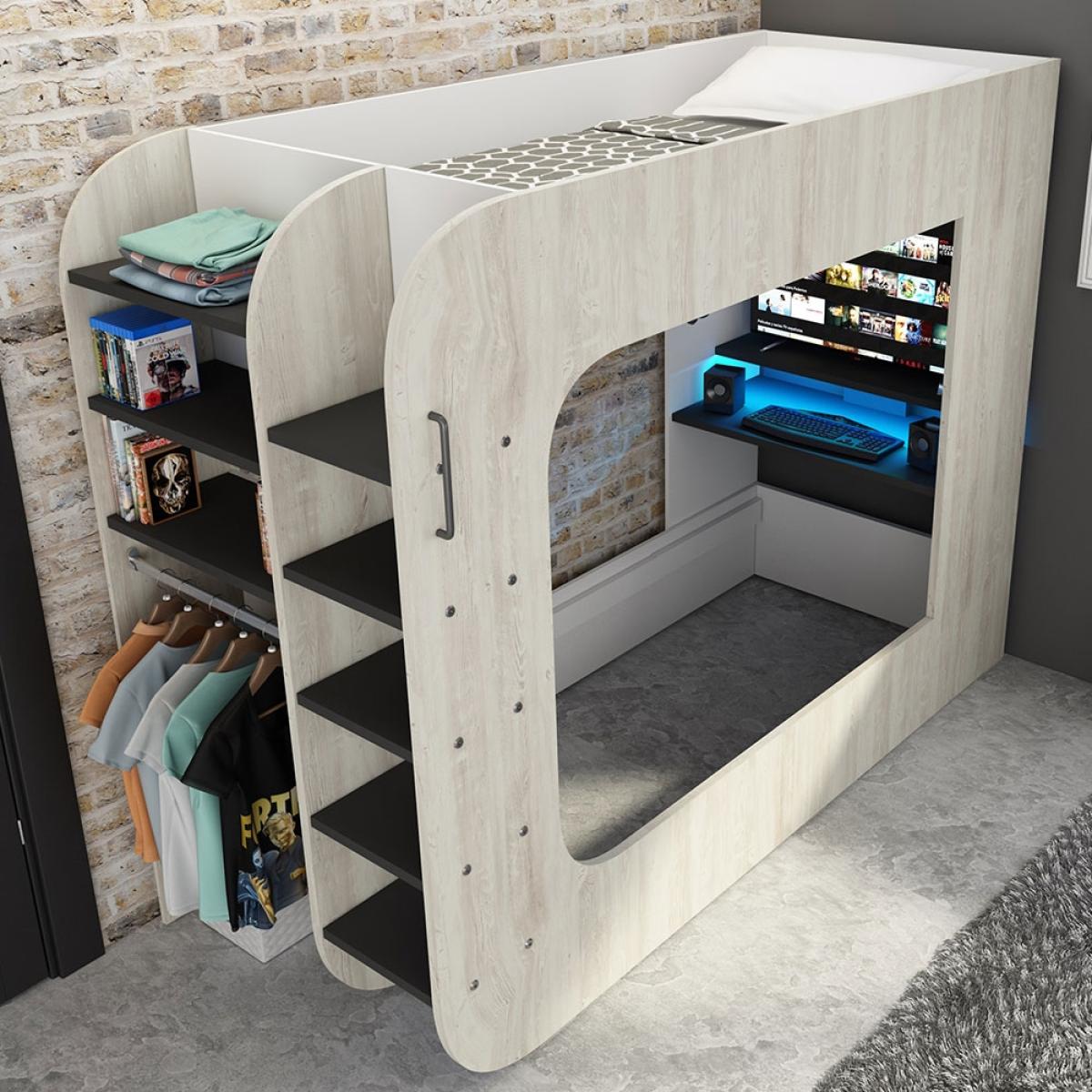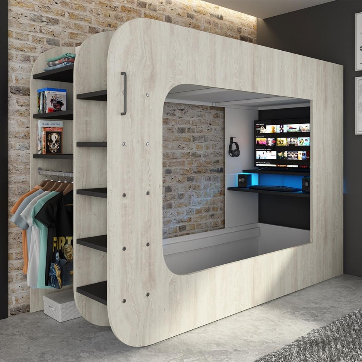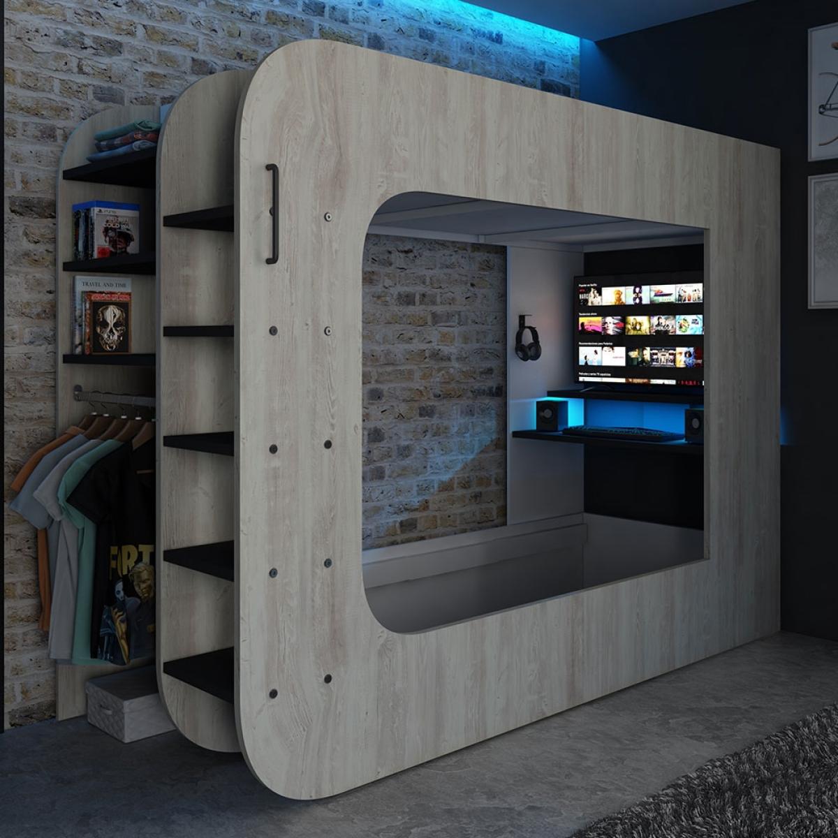 Your teen's jaw will drop when you surprise them with the Trasman Pod Solo 3 Gaming Bed! Packed with modern features, they can work, rest and play, all in one space. Built into the single loft bed - the height adjustable gaming desk can fit a 32 inch screen! With a shelf below - keyboards, speakers, consoles and accessories all have a home and their headsets can live on the metal hook to the side. Their discs, DVDs and figurines can be organised on the shelves at the end of the bed, along with their tees and trainers just below. Creating a fully immersive experience, the colour changing LED lights assist their gameplay and get them in the zone! And finally, add the optional wireless charger to complete their setup! With a bed this awesome, we guarantee parent of the year award will be coming your way!.
