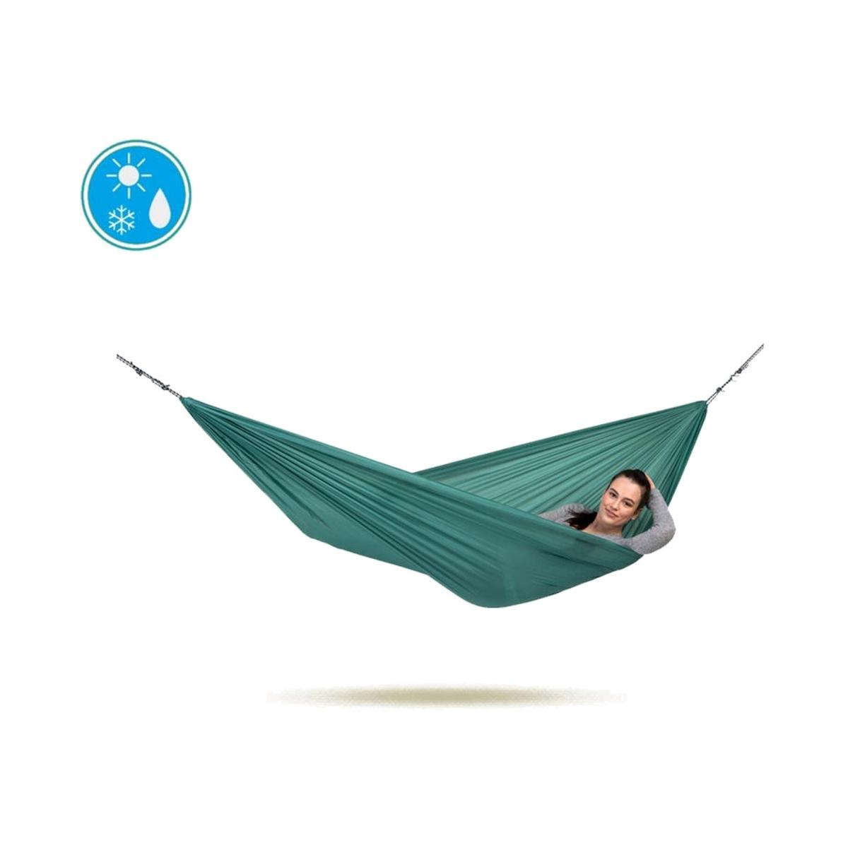The Travel Hammock Set comes complete with an integrated rope and hooks and is strong enough to hold a weight of up to 120 kg. A great value all-in-one travel hammock just wind the ropes around trees and secure with a hook. Quick, simple and good quality.