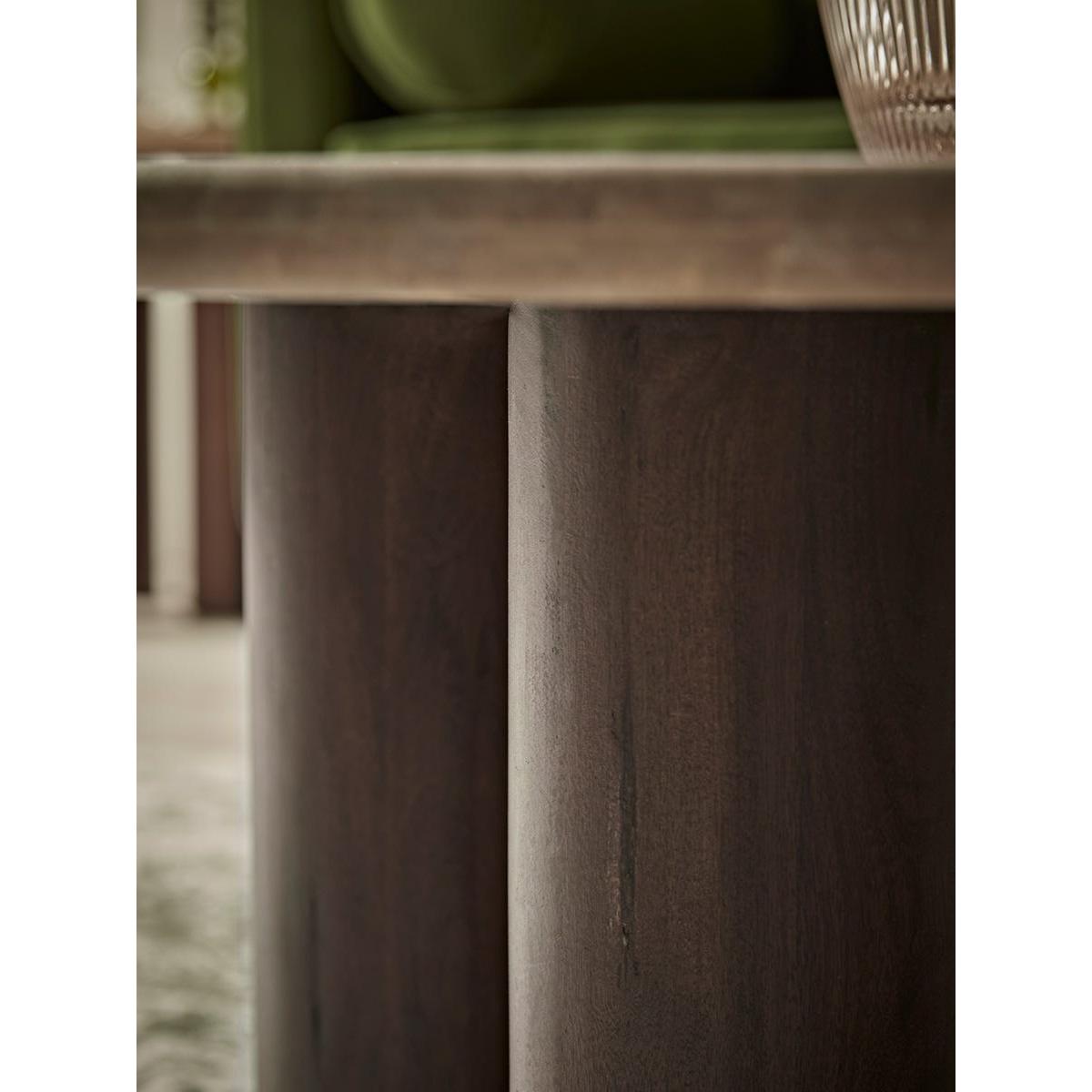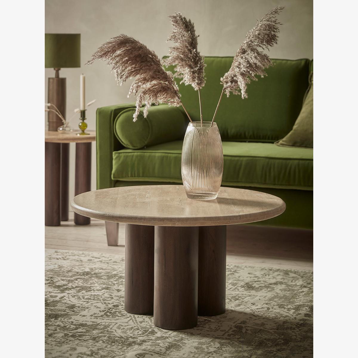 Carved from a dark toned mango wood, three large pipe style legs create the base of this coffee table for a show stopping look in the centre of your living space. Finished with a round travertine table top, this contrasts with the dark legs beautifully adding a unique, modern twist to your home.