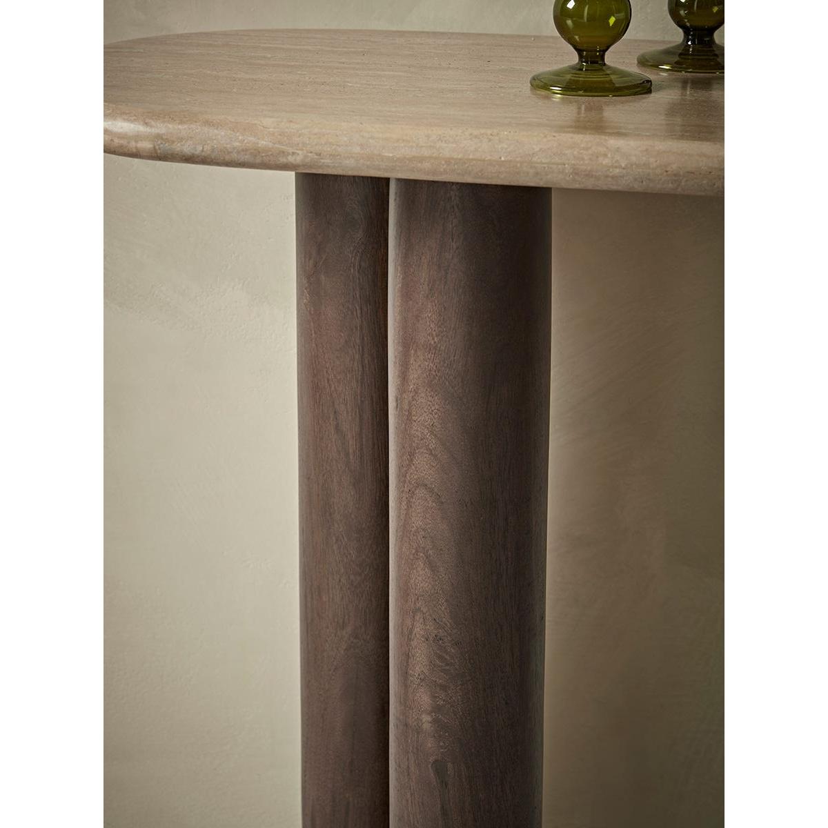 With a narrow shape ideal for your hallway or a small space in your home, this console table adds a wonderful eye-catching detail to your home. With legs carved from a dark toned mango wood in large pipe shapes, these hold an oblong travertine tabletop in a lighter, contrasting tone for a unique and modern twist.