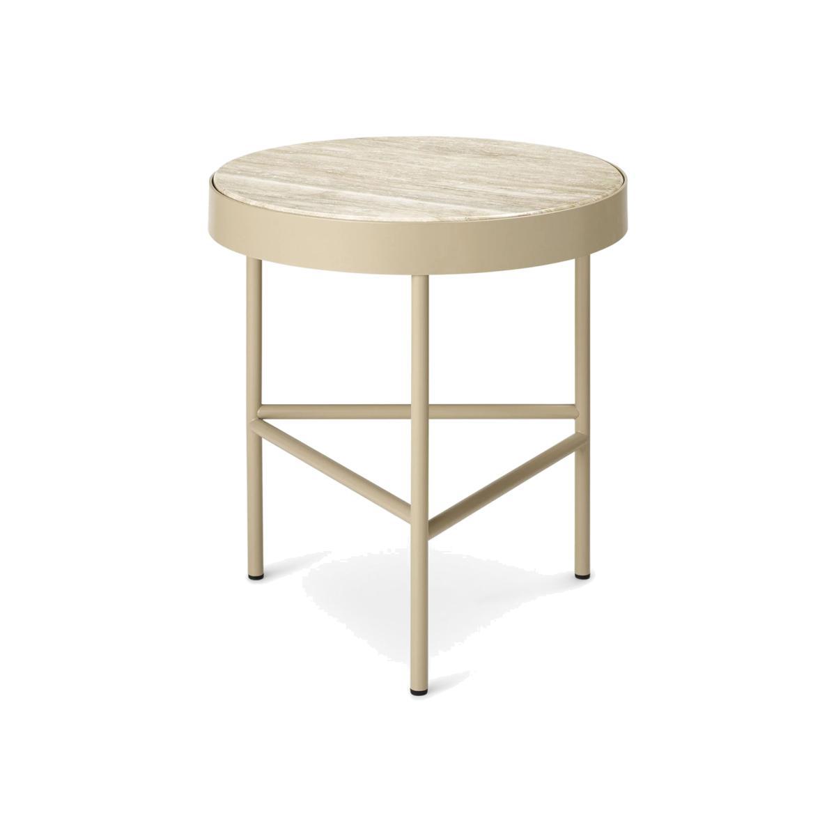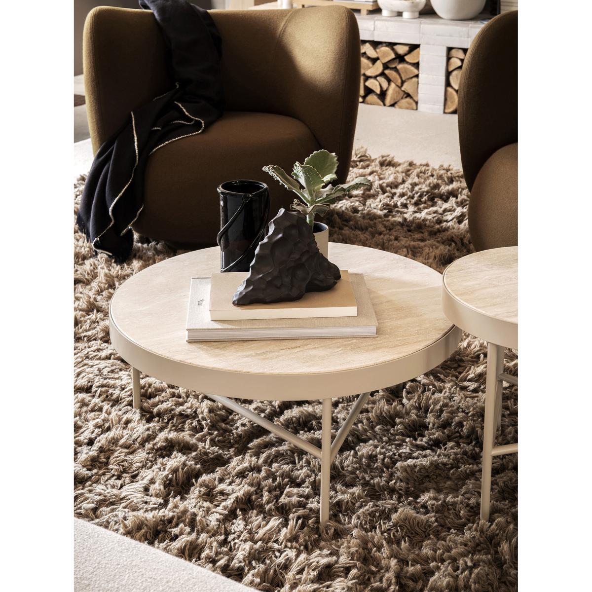 This coffee table mixes styles and materials, playing around with fashion and conventions. The varnished steel tripod base is geometric and graphic. The modernity of the industrial-style base contrasts superbly with the natural beauty of the Travertine stone top. The vibrantly textured stone has delicate veins running through it. Raw but sensual, mineral without being cold, this sedimentary rock reveals its multiple identities, its nuances and asperities with singularity. The tray is framed in metal. This coffee table will go equally as well in very modern and more traditional interiors.