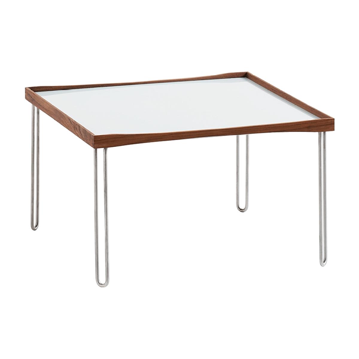 Finn Juhl, the master of Danish Modern, originally designed the iconic walnut and white Tray Table in 1965.The elegant table features an elegant, slim, stainless steel frame topped with a walnut and white high-gloss laminate table top. Fitting seamlessly into any space and perfect for use in a group setting, the Tray Table would enhance any room as a side table for a lamp, a vase of flowers or a pile of books. The first Danish furniture designer to achieve international recognition, Finn Juhl is seen by many as the master of Danish Modern. A self-taught designer, he originally studied to become an architect but worked with the mindset of a sculptor when creating his designs. Rather than thinking in terms of practicality, Finn Juhl broke free from the constraints of conventional working methods to create truly innovative designs.