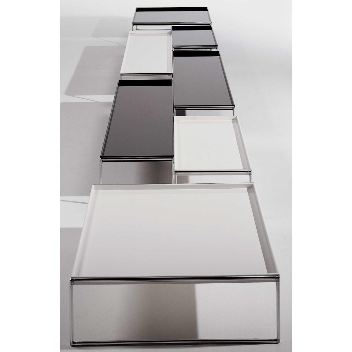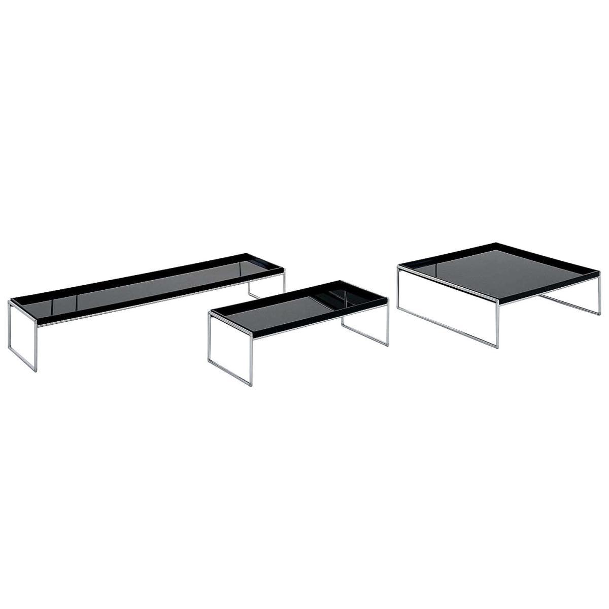 Novelties Milan 2003, Trays is a collection of tables and shelves. The trays realized in a very sophisticated methacrylate, bright black or white, suggest lacquered japanese. The chromed steel structure is worked with lightness. A very pure and elegant design signed Piero Lissoni. Coffee tables are proposed in 3 different dimensions.