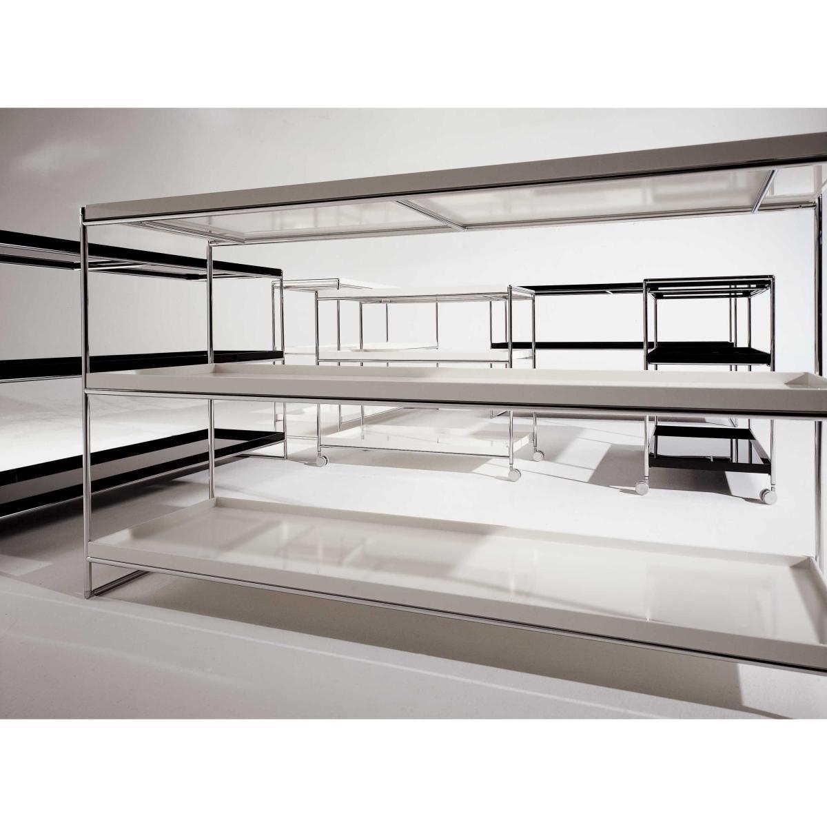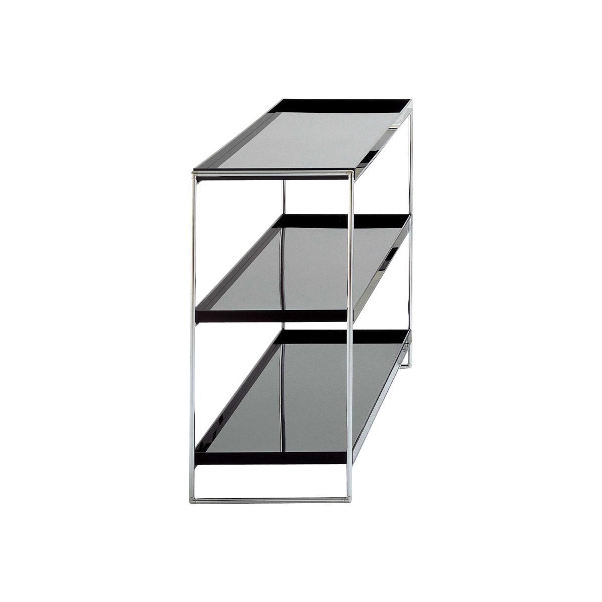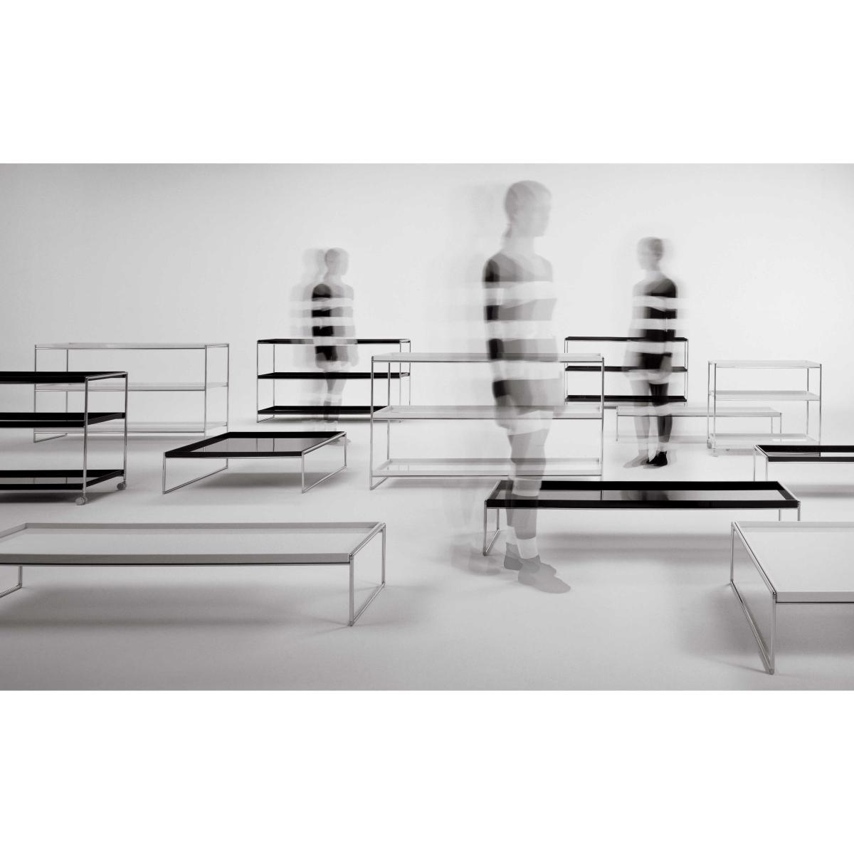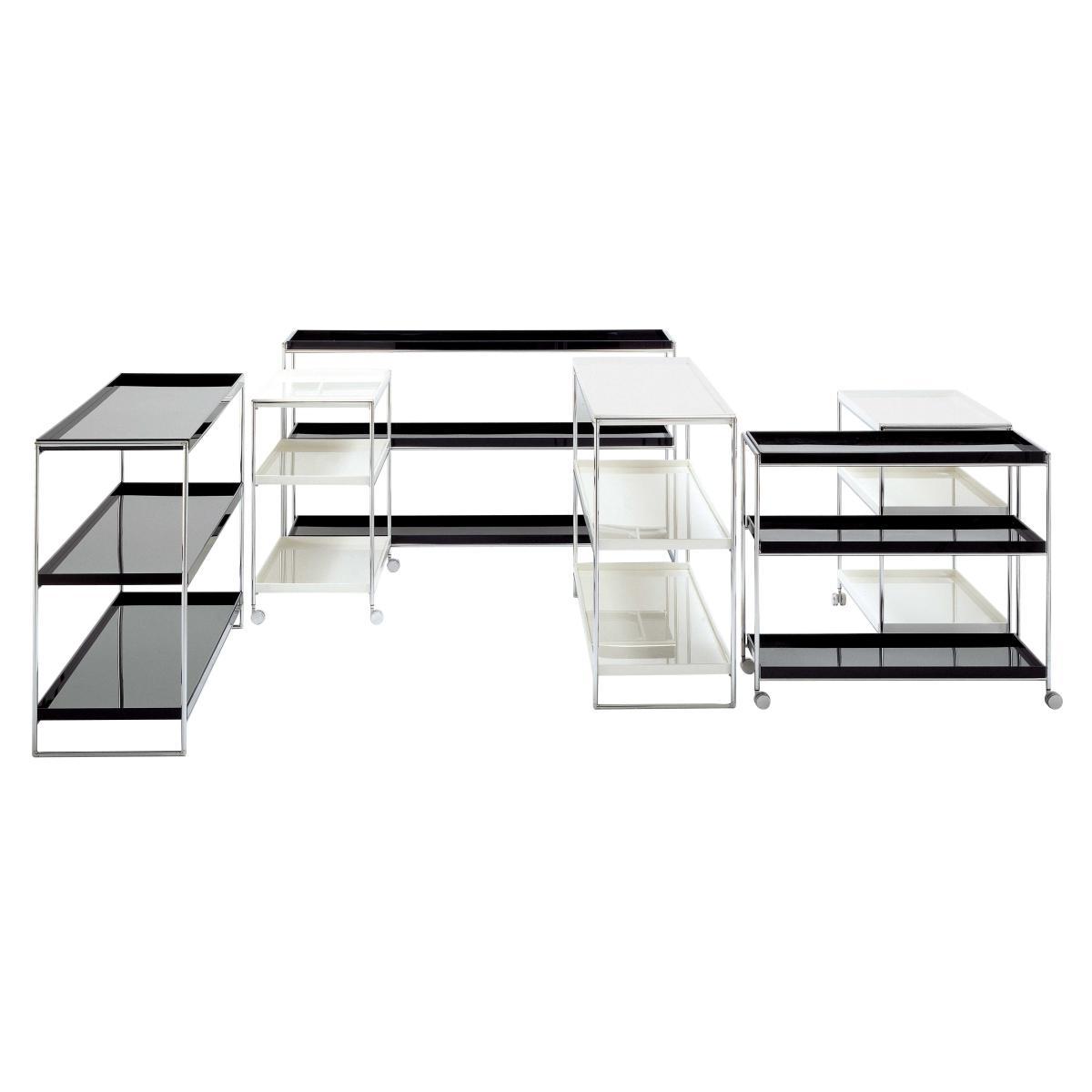 Novelties Milan 2003, Trays is a collection of tables and shelves realized in a very sophisticated méthacrylate, brilliant black or white, which bring to mind lacquered Japanese trays. The shelves are fixed to a polished aluminium structure. The design of this bookshop at 3 levels gives the impression of lightness and elegance, even though the articles are stable and robust.