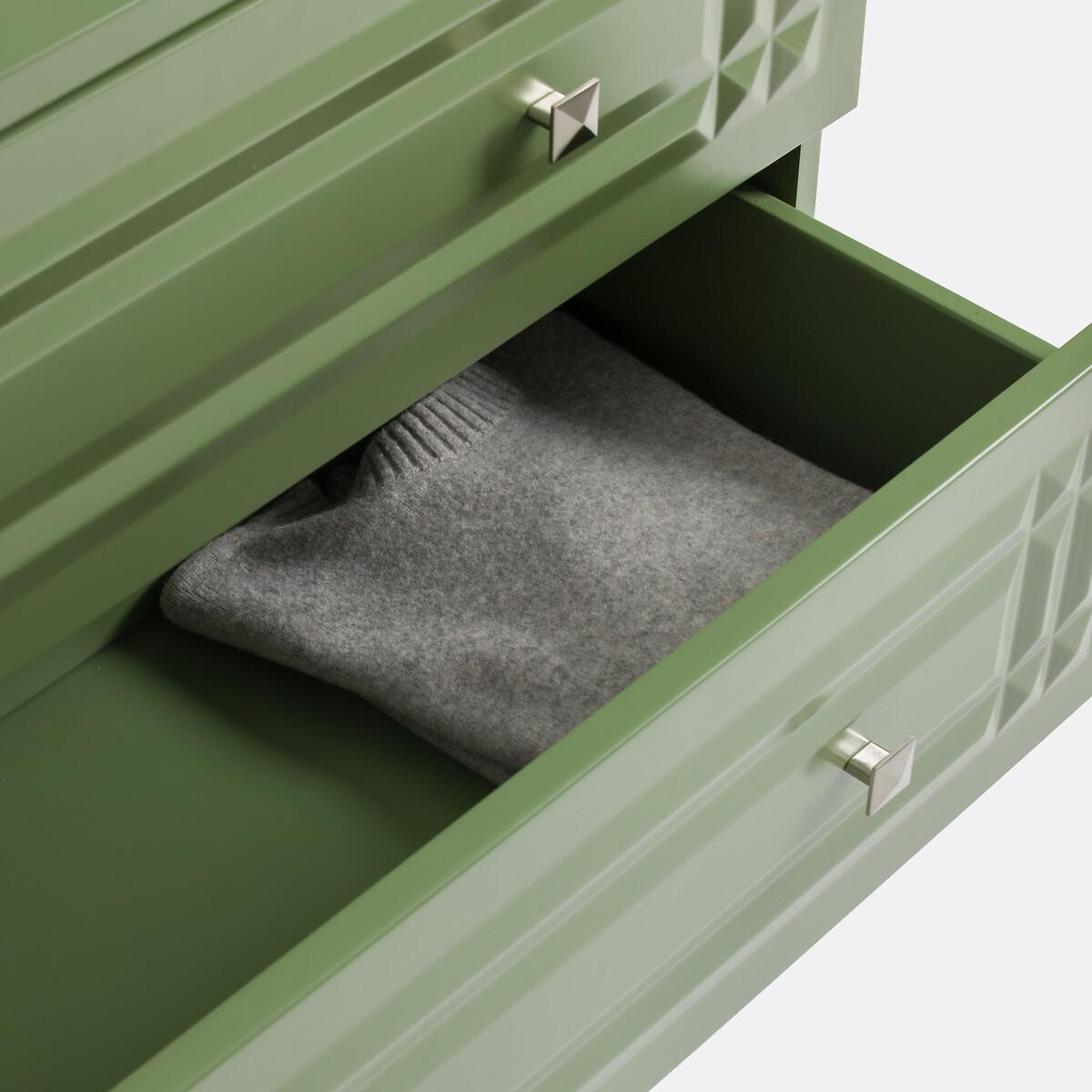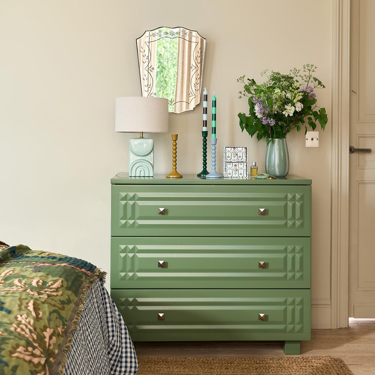 I love this chest because of its playful yet practical design, making it a great statement piece in a variety of interiors. Its soft green hue works especially well in colourful boho spaces, coastal-inspired schemes, or modern schemes where a pop of colour is welcome. It pairs nicely with both vintage and contemporary furnishings, adding a touch of charm without overwhelming the room. For styling tips, consider layering with textured baskets or decorative trays on top, and use the drawers for organising essentials in bedrooms or living spaces. Its understated character makes it versatile, while the detailing adds just enough visual interest to keep it fresh and engaging.