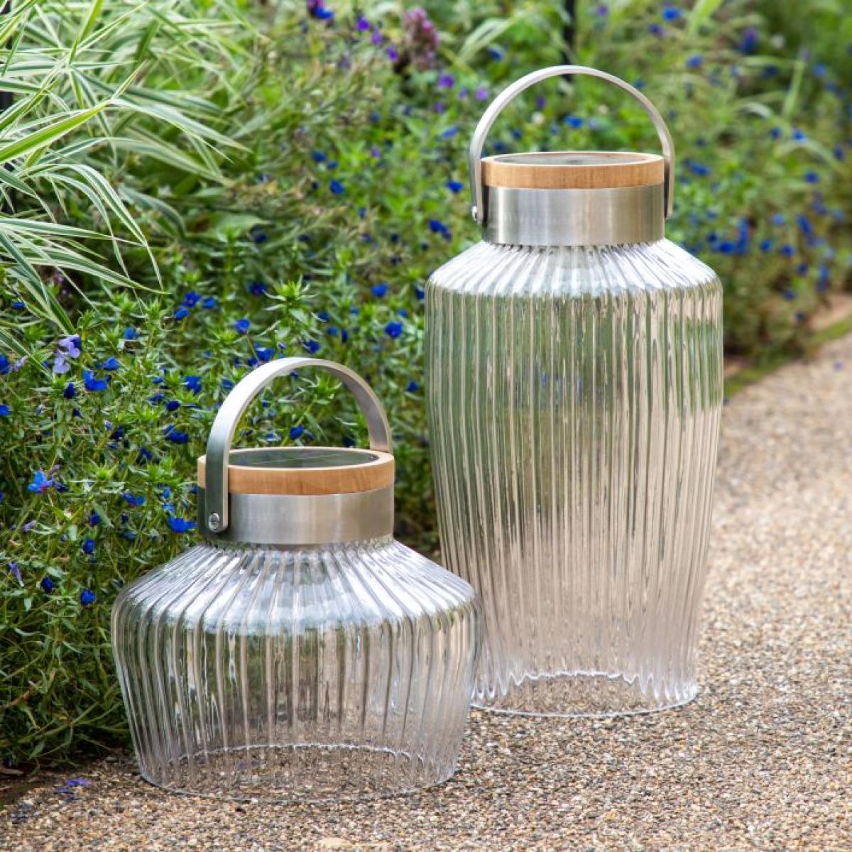 Give a little glow and ambience to your outside space this summer. Thanks to the aluminium handle, this lamp is easy to position wherever you need it. The ridged glass lamp is powered by a solar panels embedded in the teak wood top. With 3 light intensity settings, the lamp can run for up to 5 hours on the brightest setting, up to 8 hours on the middle setting, and up to 12 hours on the lowest setting, after charging by direct sunlight. It can also be charged by USB (charger not included), which gives up to 32 hours of light on the brightest setting, and up to 60 hours on the lowest. Coordinating larger lamp available.