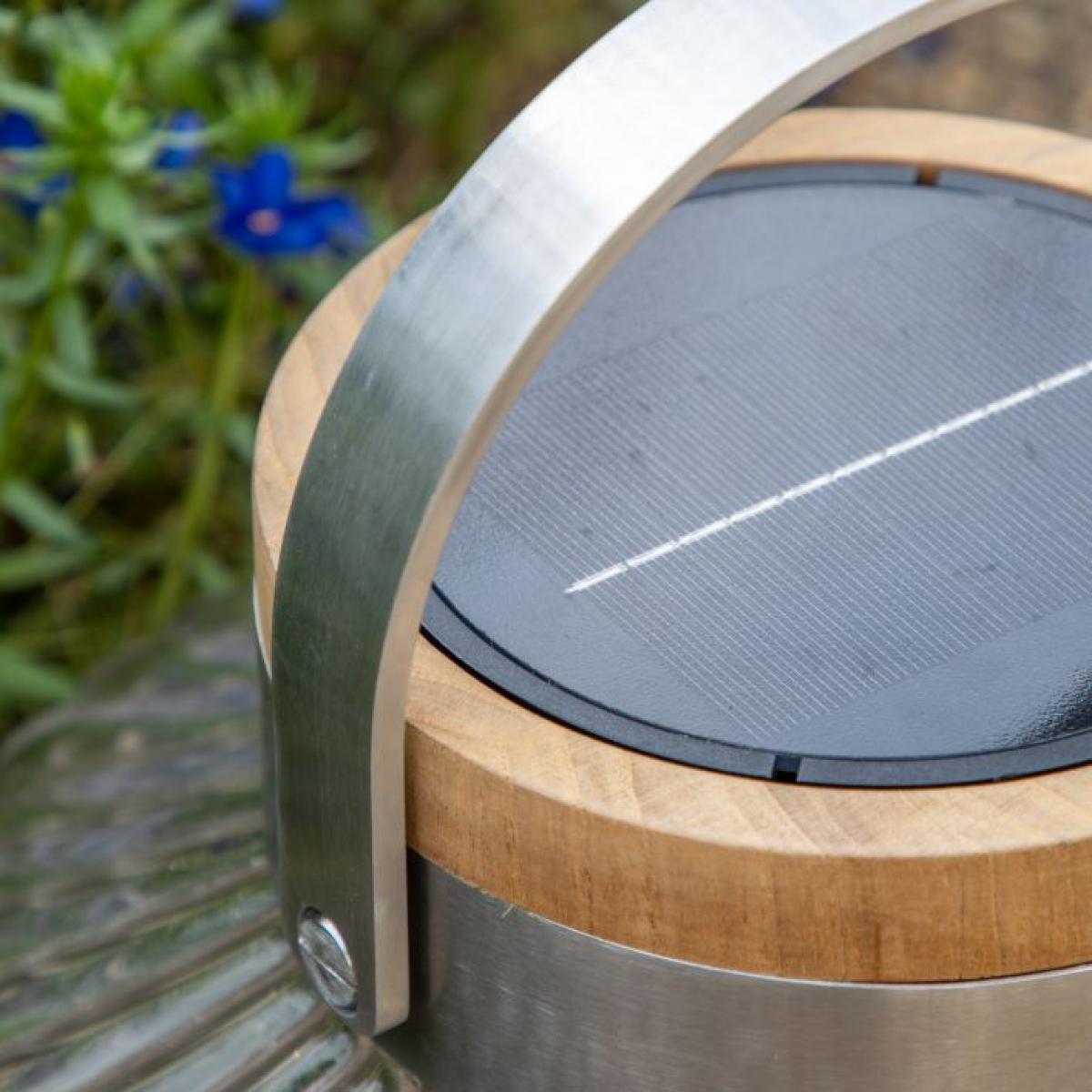 Give a little glow and ambience to your outside space this summer. Thanks to the aluminium handle, this lamp is easy to position wherever you need it. The ridged glass lamp is powered by a solar panels embedded in the teak wood top. With 3 light intensity settings, the lamp can run for up to 5 hours on the brightest setting, up to 8 hours on the middle setting, and up to 12 hours on the lowest setting, after charging by direct sunlight. It can also be charged by USB (charger not included), which gives up to 32 hours of light on the brightest setting, and up to 60 hours on the lowest. Coordinating smaller lamp available.