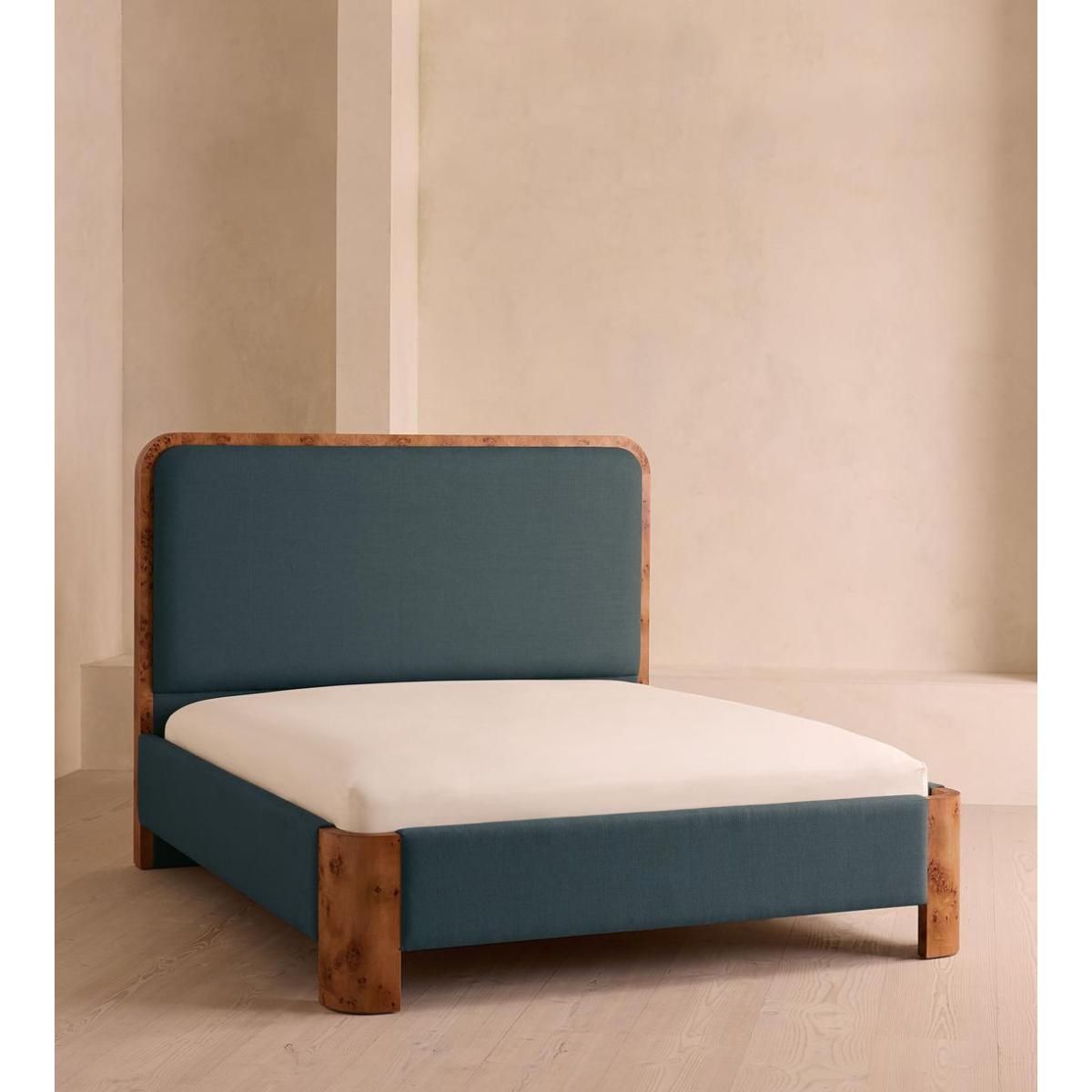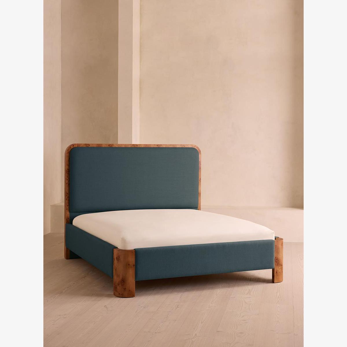 As seen in Soho House Nashville, the Tremont bed features a sculptural Mappa burl frame in a warm mid-tone finish and linen upholstery, turning the headboard into a defining design element. Burl detail to the back means this particular style can float within a space and work as a room divider.