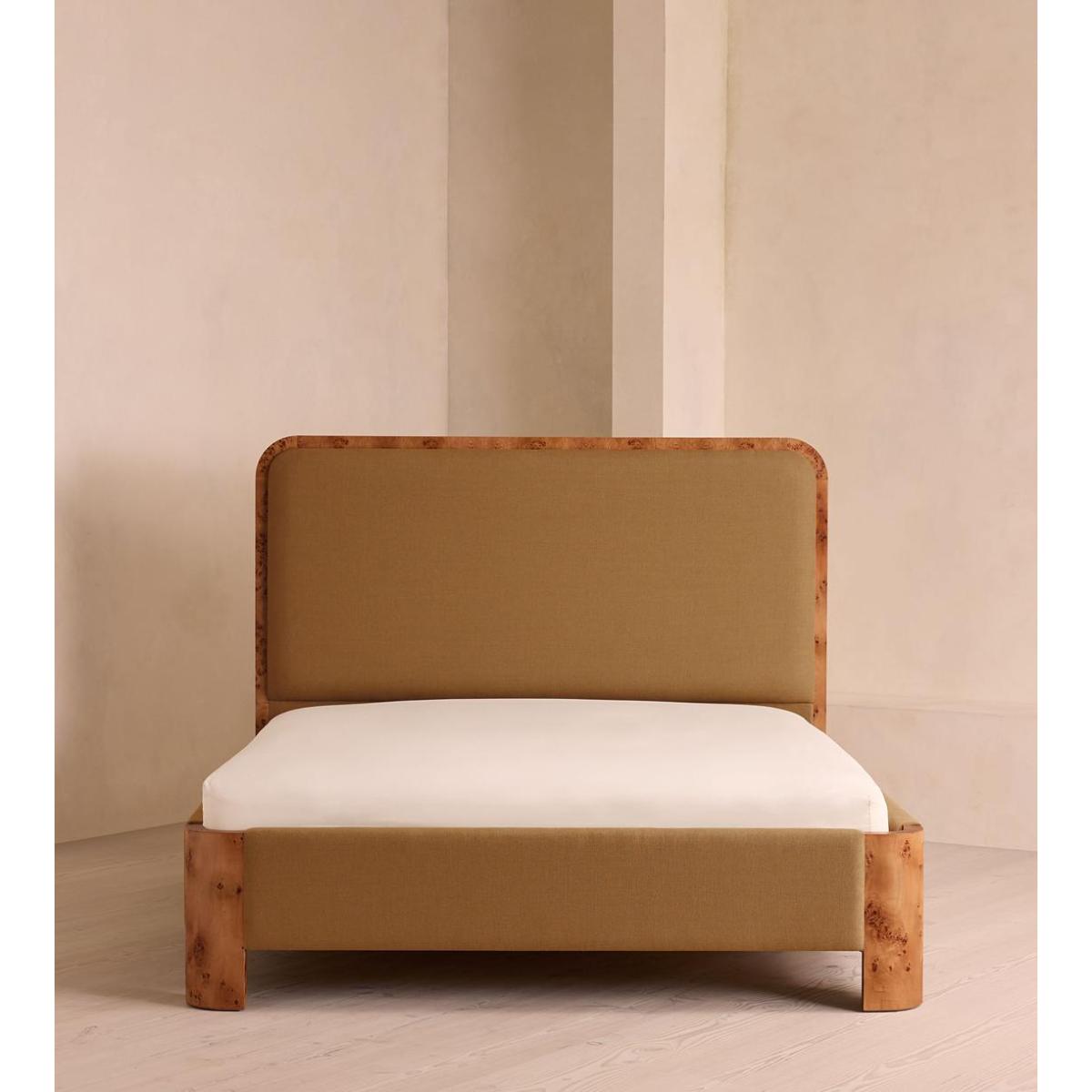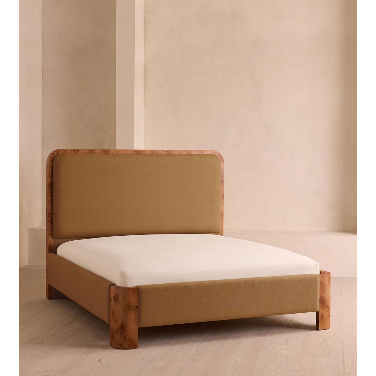 As seen in Soho House Nashville, the Tremont bed features a sculptural Mappa burl frame in a warm mid-tone finish and linen upholstery, turning the headboard into a defining design element. Burl detail to the back means this particular style can float within a space and work as a room divider.
