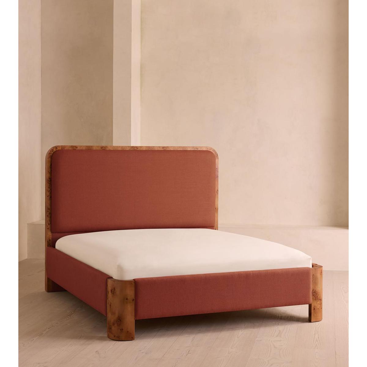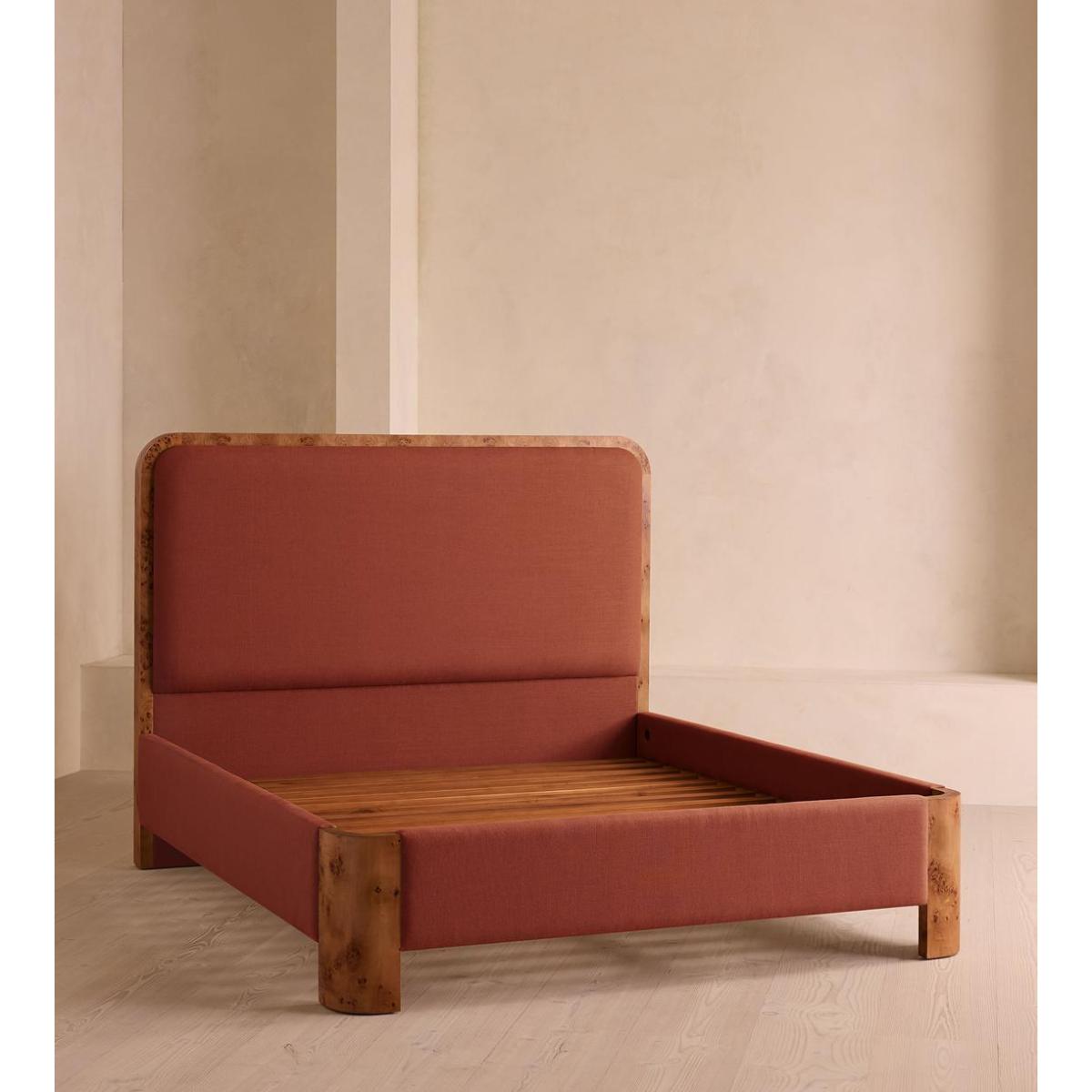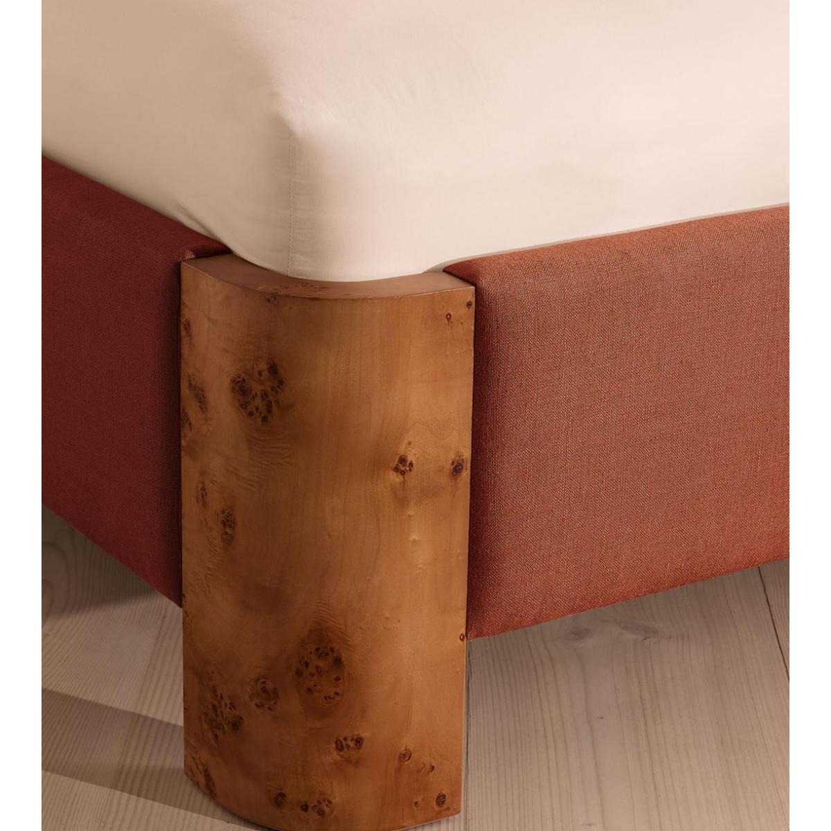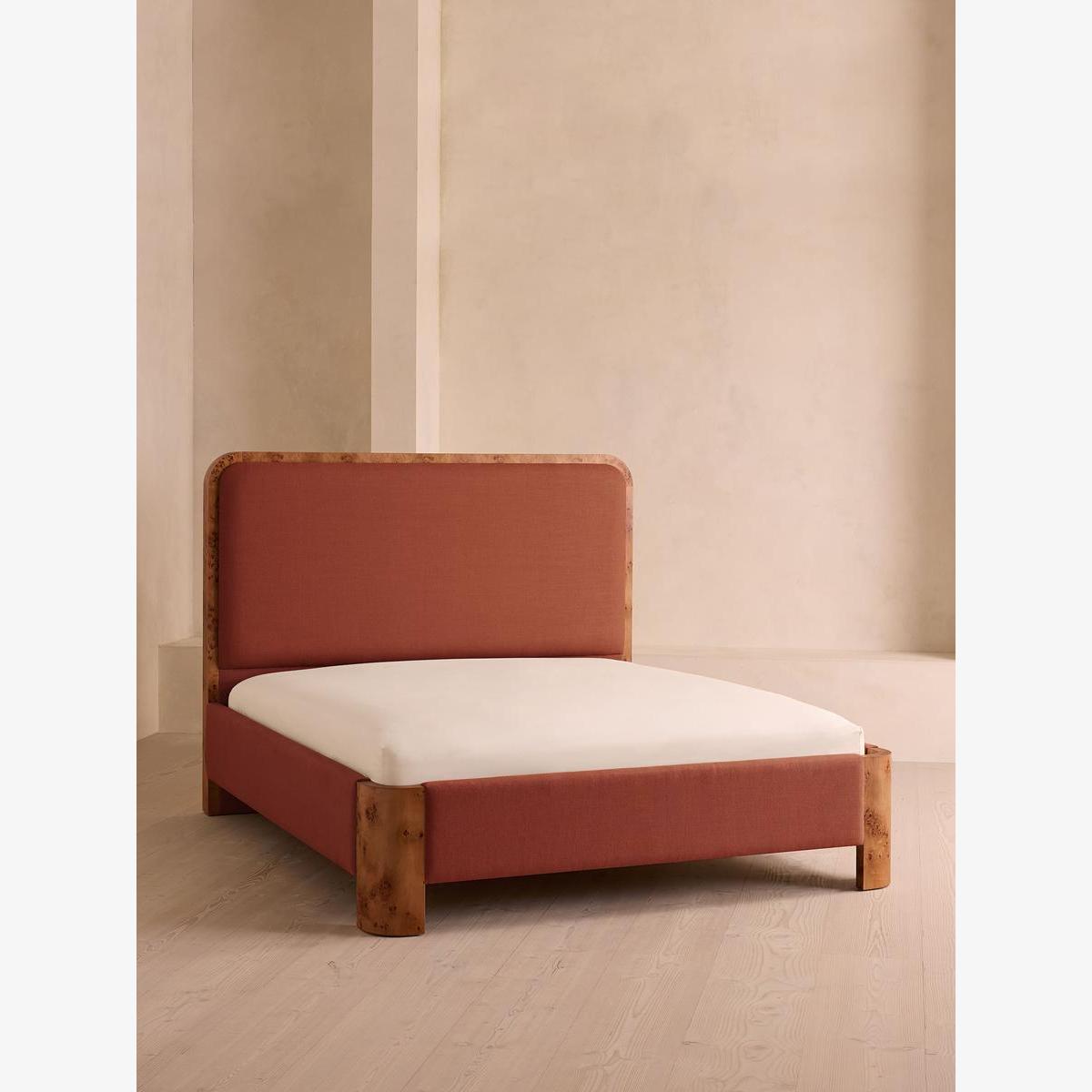 As seen in Soho House Nashville, the Tremont bed features a sculptural Mappa burl frame in a warm mid-tone finish and linen upholstery, turning the headboard into a defining design element. Burl detail to the back means this particular style can float within a space and work as a room divider.