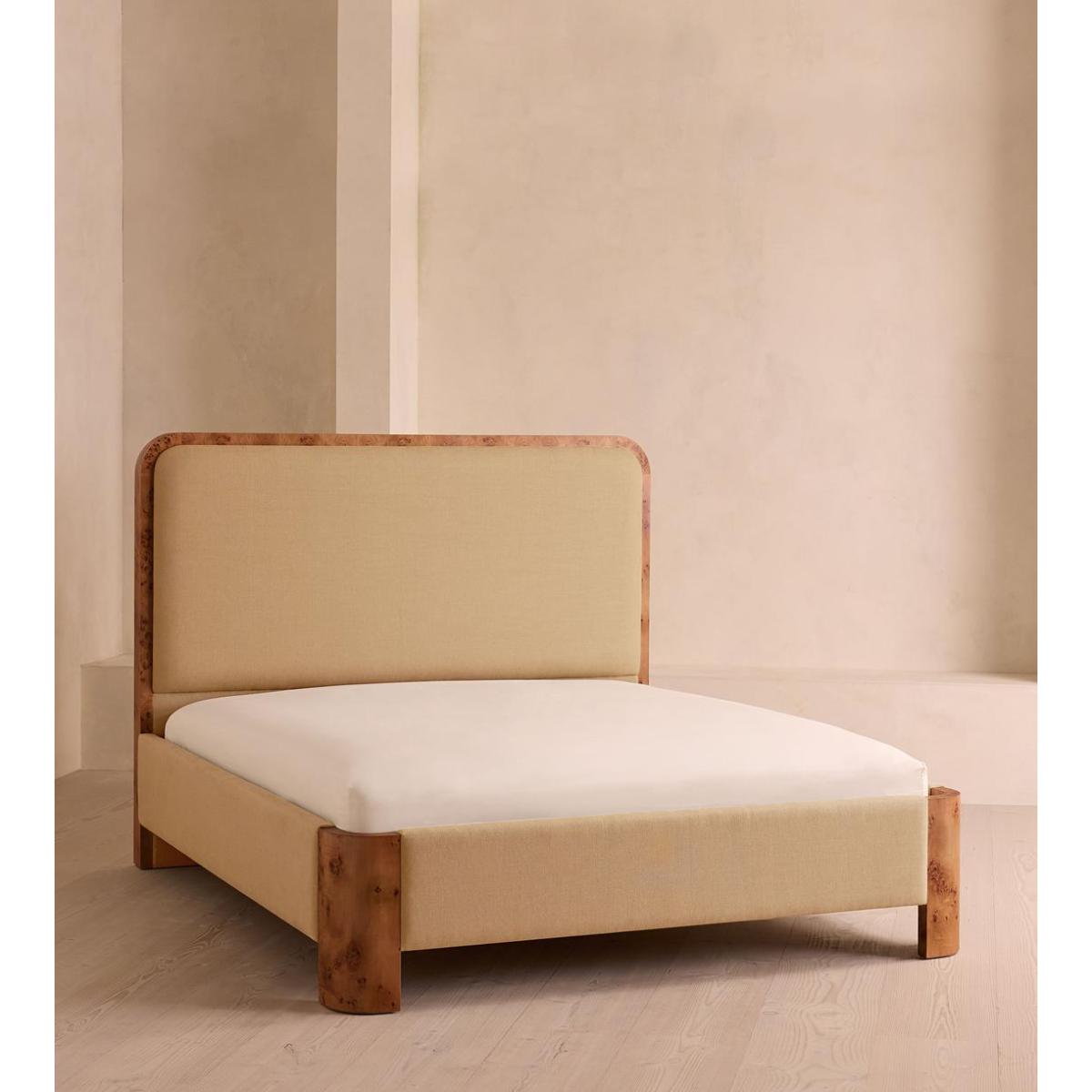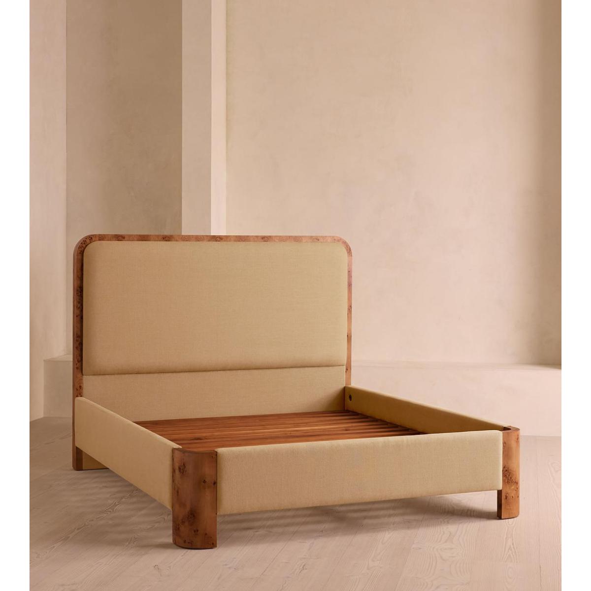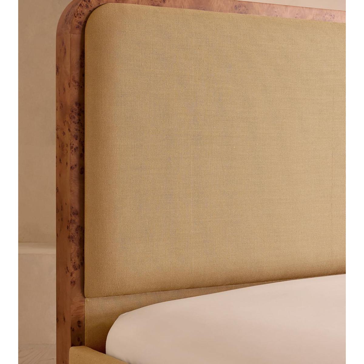 As seen in Soho House Nashville, the Tremont bed features a sculptural Mappa burl frame in a warm mid-tone finish and linen upholstery, turning the headboard into a defining design element. Burl detail to the back means this particular style can float within a space and work as a room divider.