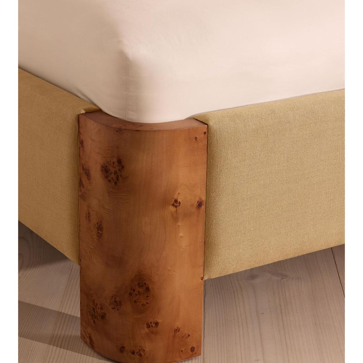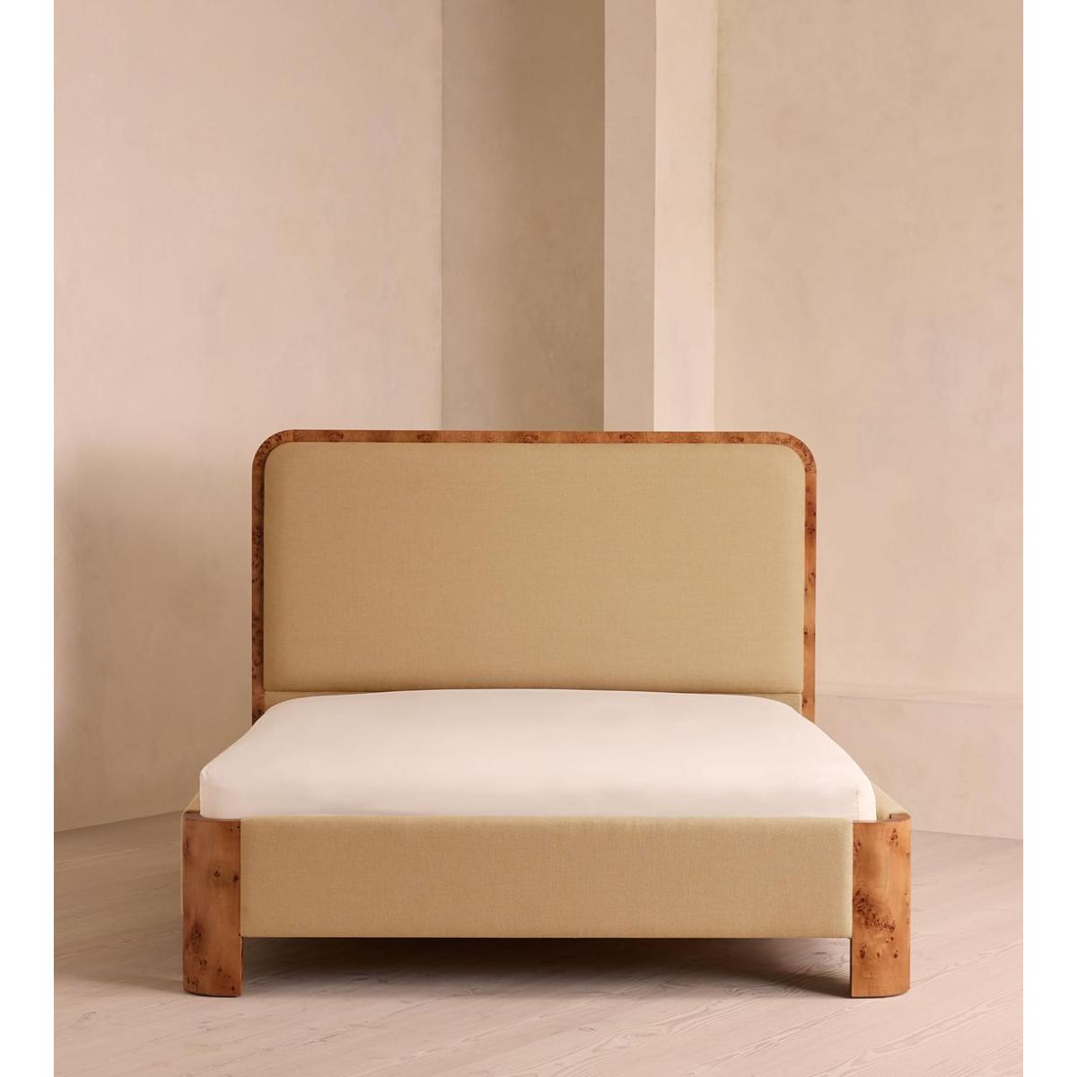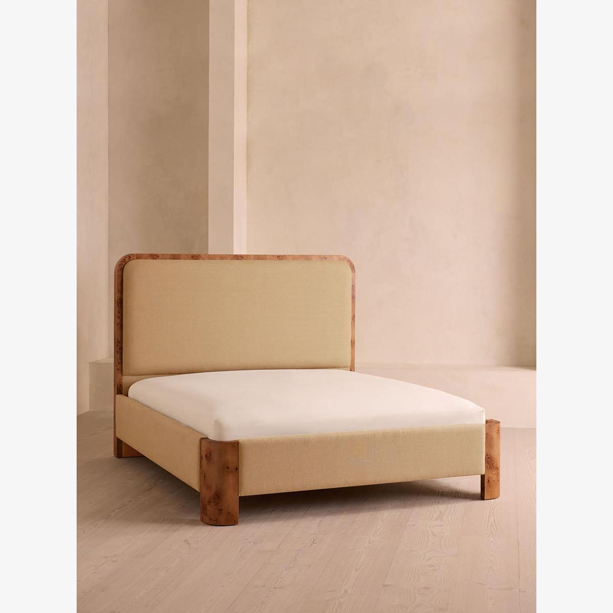 As seen in Soho House Nashville, the Tremont bed features a sculptural Mappa burl frame in a warm mid-tone finish and linen upholstery, turning the headboard into a defining design element. Burl detail to the back means this particular style can float within a space and work as a room divider.
