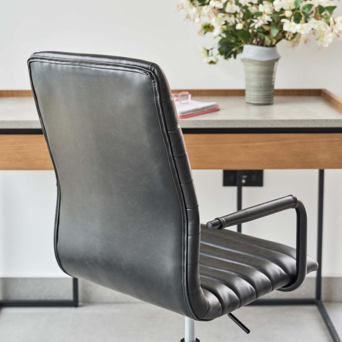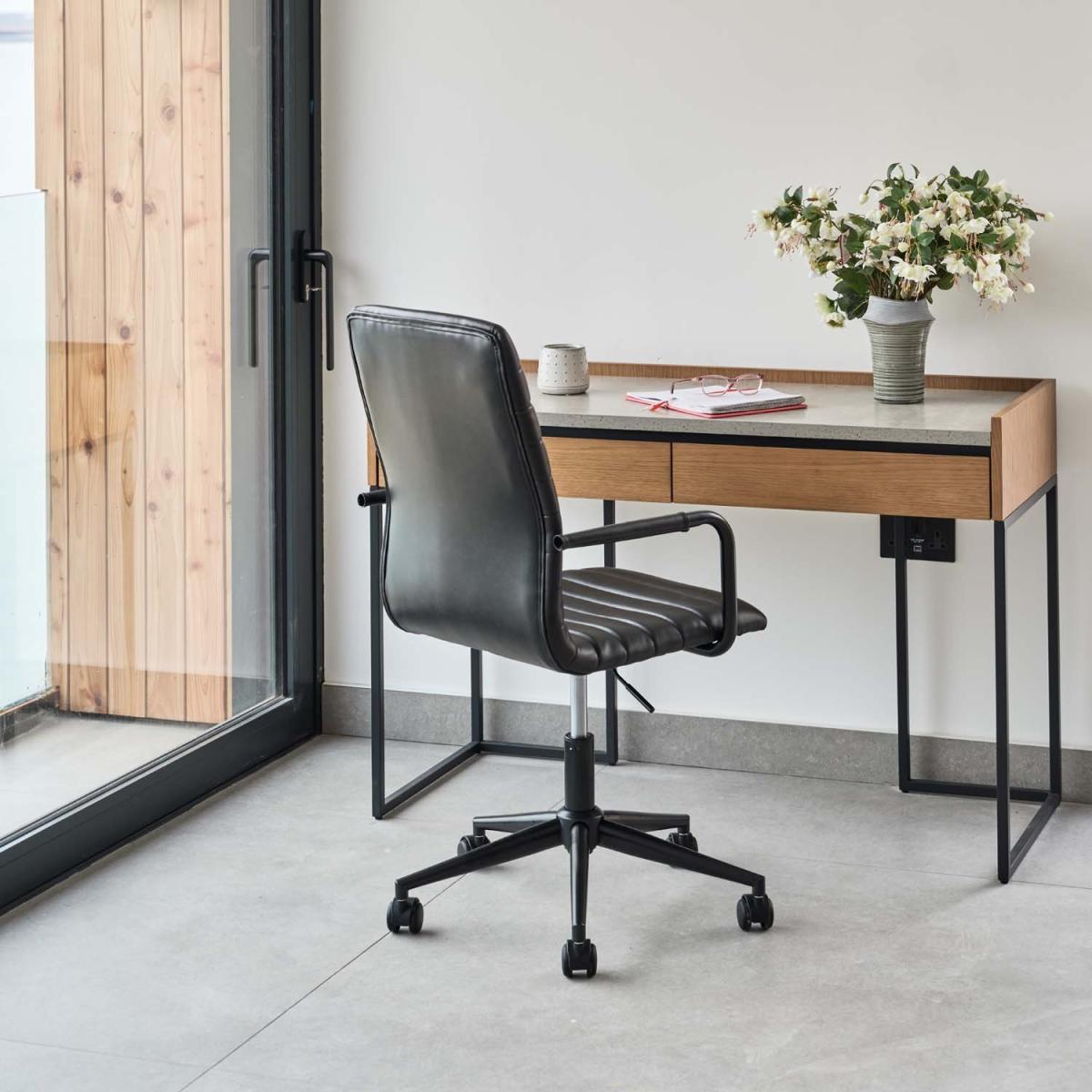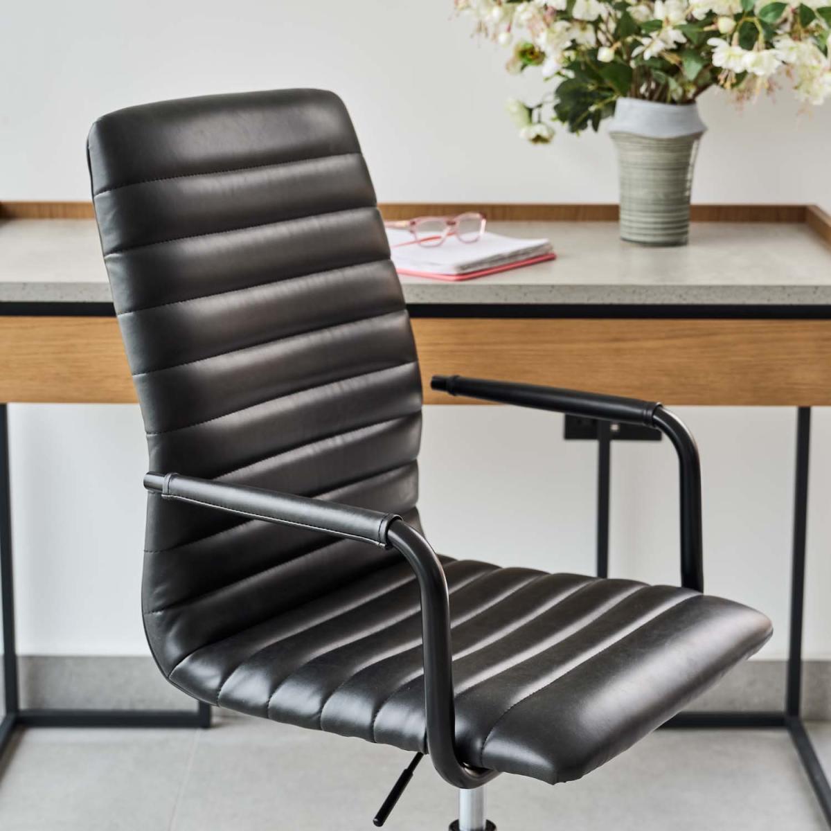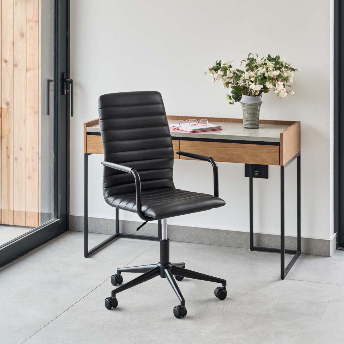 The Trend Desk Chair is the perfect seating solution for your working area. Add some comfort to your working day thanks to the soft upholstery, while still relishing a look of modern luxury with a Black PU Finish. Enjoy the added support of the two arms and the practicality of the wheeled base, bringing you sturdiness and style wrapped up in a single office chair!.