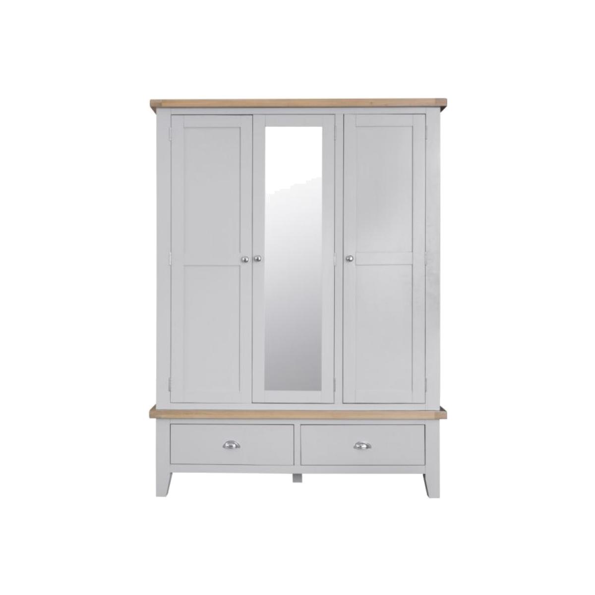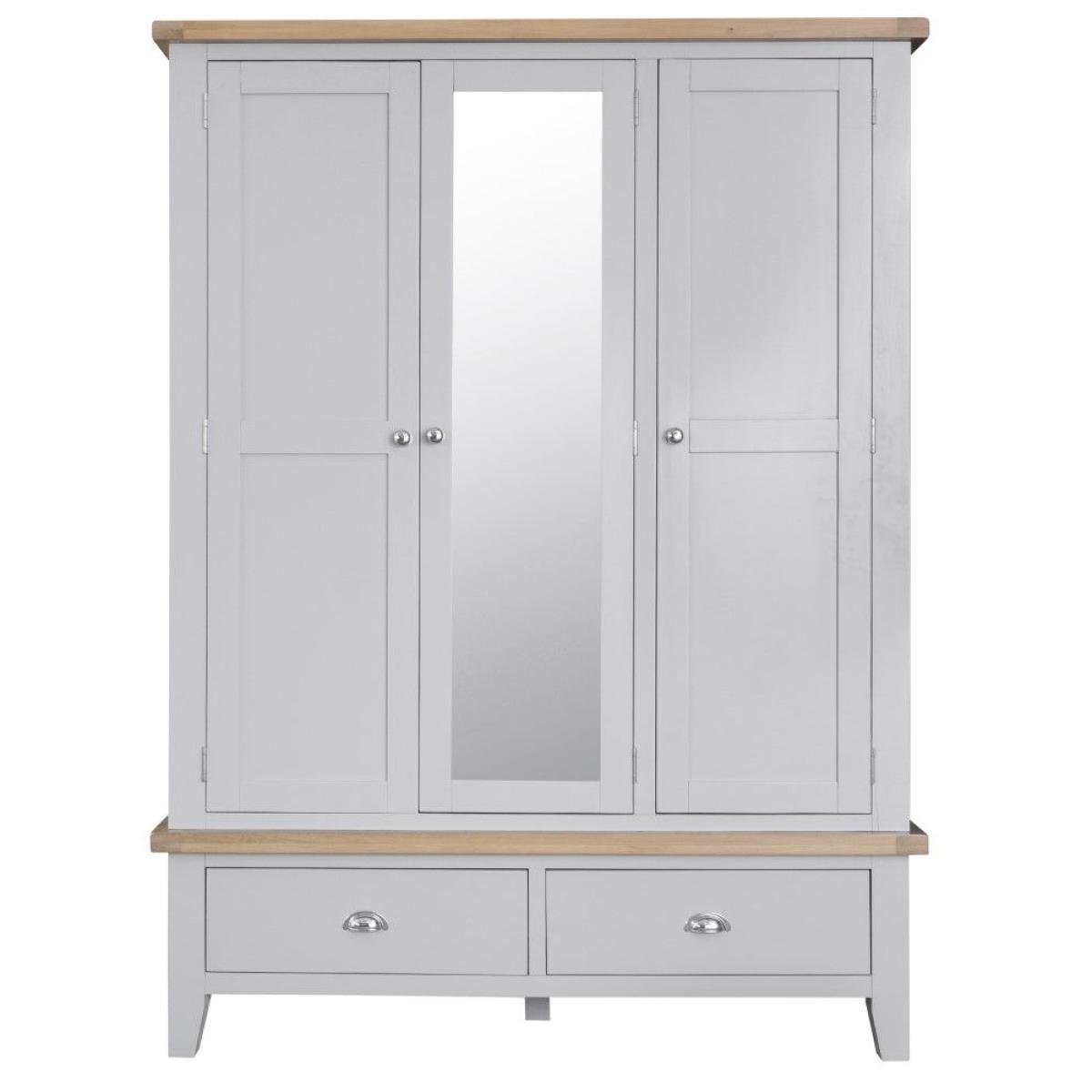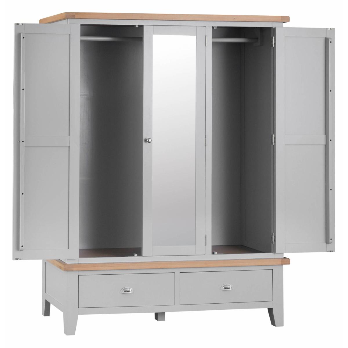 The Trentham grey large triple wardrobe is a versatile piece that works beautifully in both classic and contemporary interiors. I love its neutral grey tone, which allows it to blend seamlessly with a range of colour schemes, while the natural wood accents add warmth and character. It’s perfect for those seeking practical storage without compromising on style, especially in bedrooms that need a focal point or a piece that elevates the overall aesthetic. To style around it, consider minimal clutter to highlight its clean lines, and complement it with soft textiles or vintage accessories for a cohesive look. Remember, the wardrobe’s ample space makes it a great opportunity to organise your wardrobe essentials efficiently while maintaining a calm, organised visual.