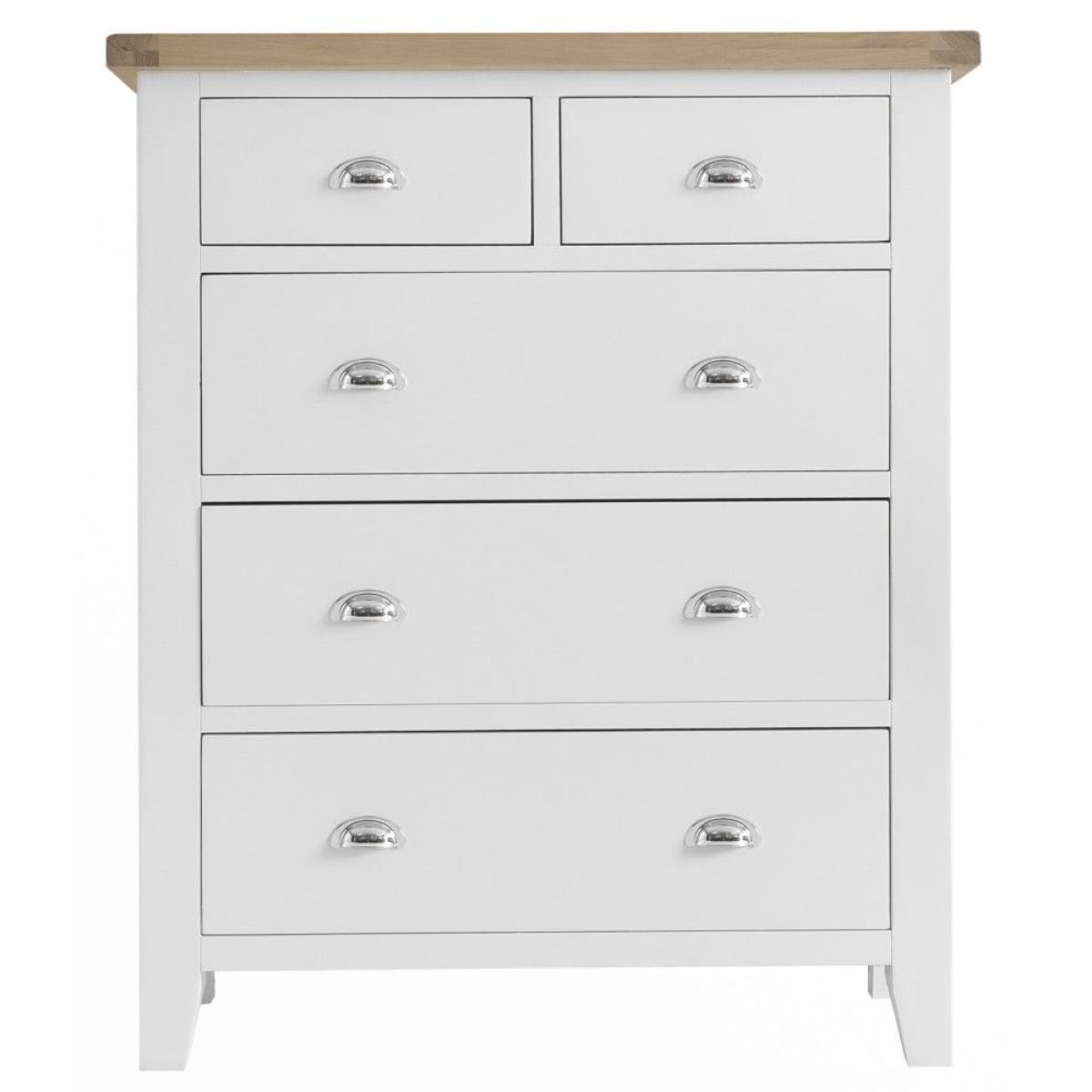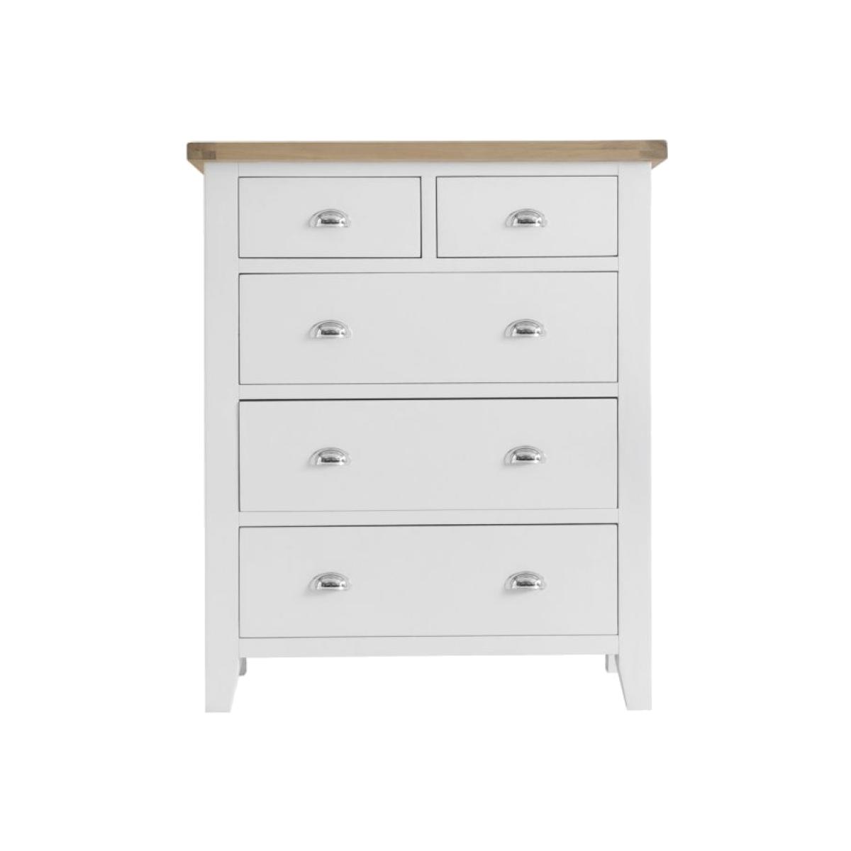 I love this chest because of its clean design and versatile colour, which makes it a great addition to both traditional and contemporary interiors. It works particularly well in bedrooms or even as a stylish storage piece in living areas. The mix of deep and shallow drawers offers practical organisation for clothes, accessories, or even office bits. To style it effectively, consider pairing it with natural textures or soft furnishings in muted tones to keep the look light and fresh. Adding a few decorative accessories on top, like a vase or a statement lamp, can also elevate its visual appeal without overwhelming the simplicity of the piece.