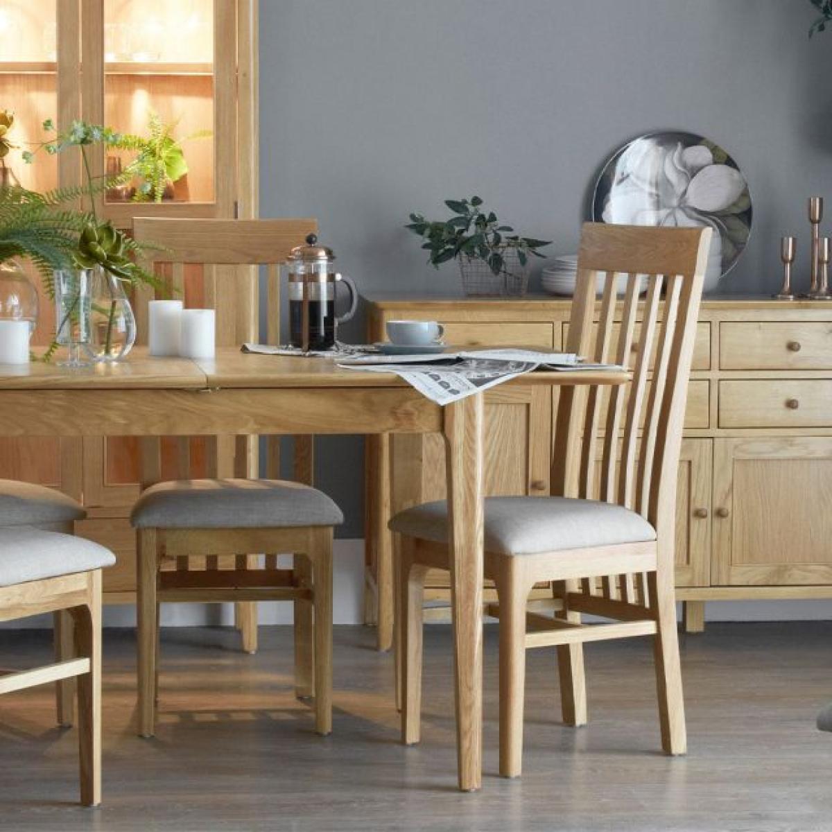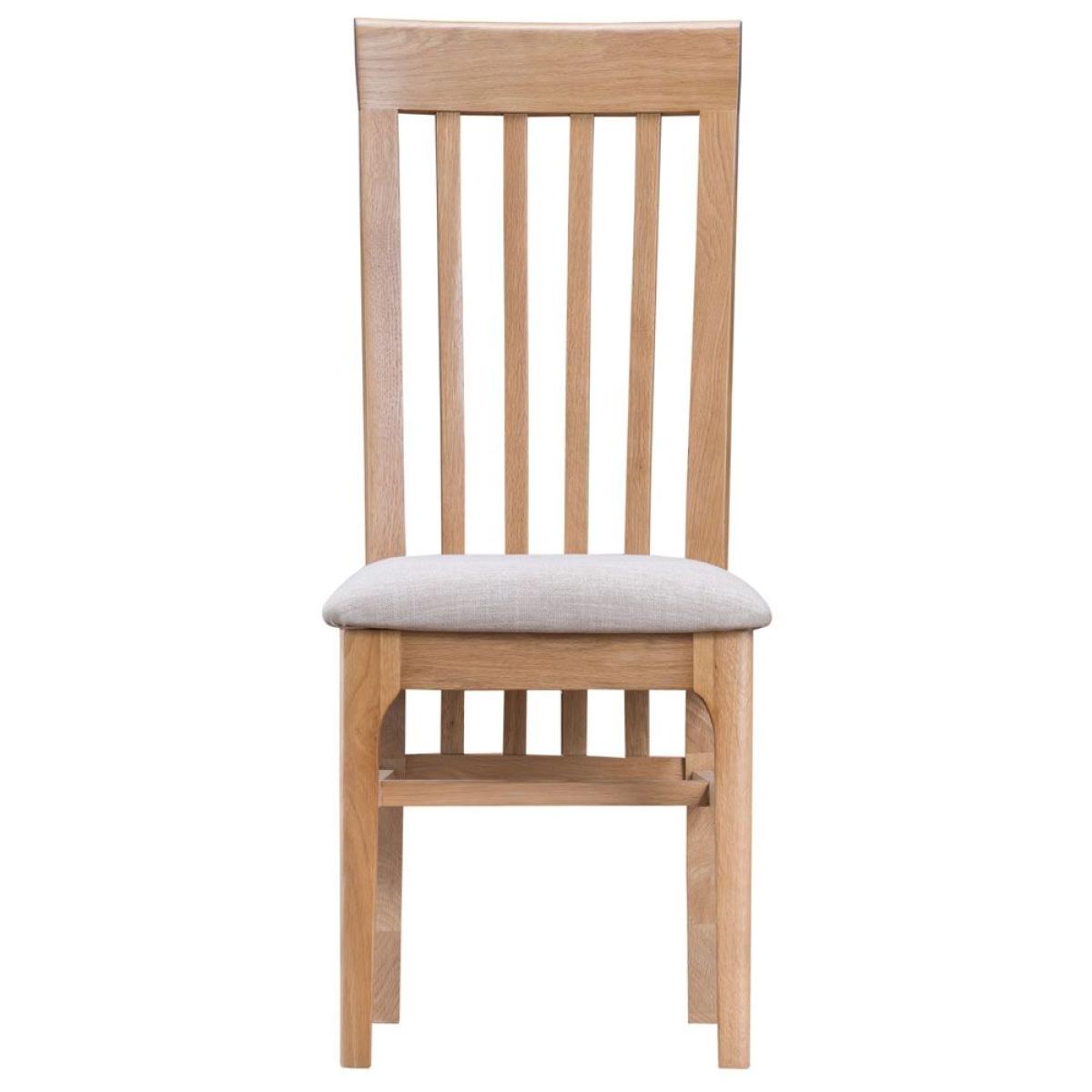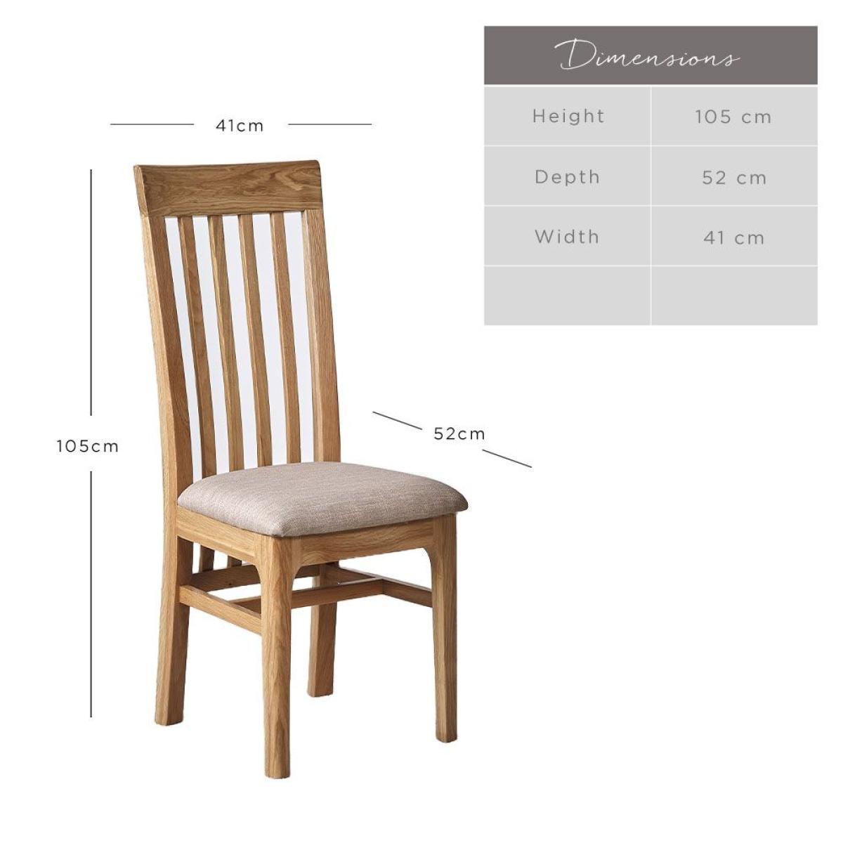 This contemporary oak dining chair will add a touch of Scandinavian style to your dining room. Beautifully crafted with a natural looking finish, the Trento oak dining chair has a superb slatted back thatll keep you supported, whilst its padded upholstered seat is a soft landing for your bottom. Set these oak dining chairs around your matching Trento dining table to complete the look. Dimensions W41cm x D52cm x H105cm. Sold as a Pair Simple self assembly