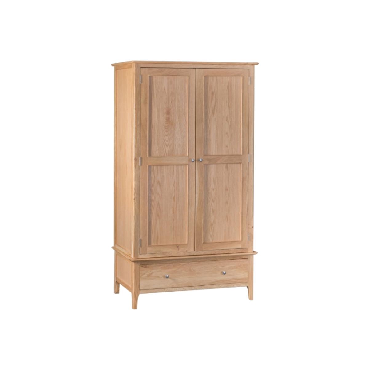 This stunning Trento. Oak wardrobe. With drawer is perfect for your home if you love Scandinavian style. The Trento 2 door wardrobe with drawer has been beautifully crafted from oak with a lovely natural finish, and comes with both oak and chrome knobs so you can choose your look. Offering plenty of space for your clothes, this 2 door oak wardrobe with drawer will add a touch of Scandinavian style to your bedroom. Team with the rest of the Trento collection to complete the look.