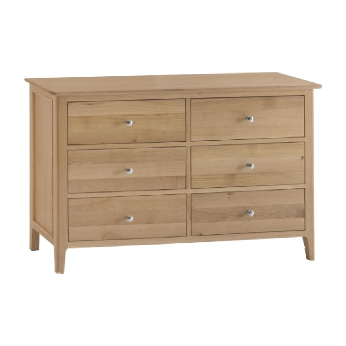 The Trento 6 drawer. Oak chest of drawers. Is the perfect storage solution for your bedroom, providing you with six large drawers to store away all of your clothes, keeping your bedroom stylish and clutter free. A stunning oak chest that is perfect for your home if you want Scandinavian style, the Trento 6 drawer oak chest of drawers has been beautifully crafted from oak with a natural finish, and comes with both oak and chrome knobs so you can choose your look. Team this oak 6 drawer chest of drawers with the rest of the Trento bedroom collection to complete the Scandinavian look. Dimensions W130cm x D42cm x H85cm.
