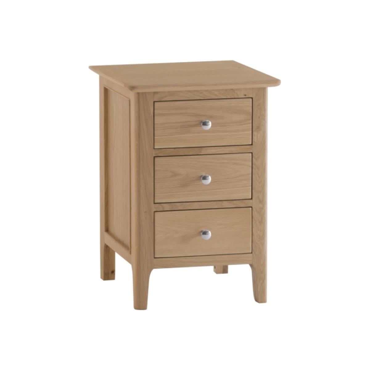 Transform your bedroom with the Trento large oak bedside cabinet, it will add a touch of Scandinavian style to your room. This large oak bedside cabinet provides you with 3 drawers to store away your books and reading glasses, as well as a space on top to place a bedside lamp. A stunning oak bedside table that is perfect for your home if you want Scandinavian style, the Trento large bedside chest has been beautifully crafted from oak with a natural finish, and comes with both oak and chrome knobs so you can choose your look. Team this oak bedside cabinet with the rest of the Trento bedroom collection to complete the Scandinavian look. Dimensions W45cm x D38cm x H65cm Simple self assembly