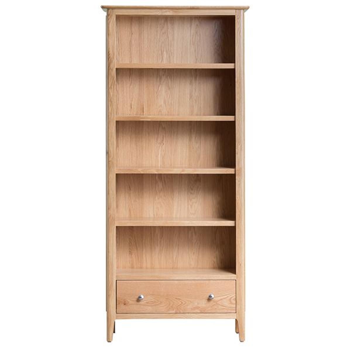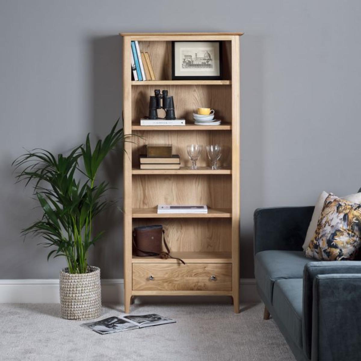 A home without a bookcase is like an unfinished novel. The Trento oak bookcase stands tall, ready to hold plenty of your favourite books and display your favourite collectibles on its sturdy shelves. This versatile Trento. Tall oak bookcase. , beautifully crafted from oak with a lovely natural finish, comprises five shelves plus a drawer. The Trento tall oak bookcase will add a touch of Scandinavian style to your home. Team with the rest of the Trento Oak Furniture Collection to complete the look. Dimensions H180cm W80cm D30cm.