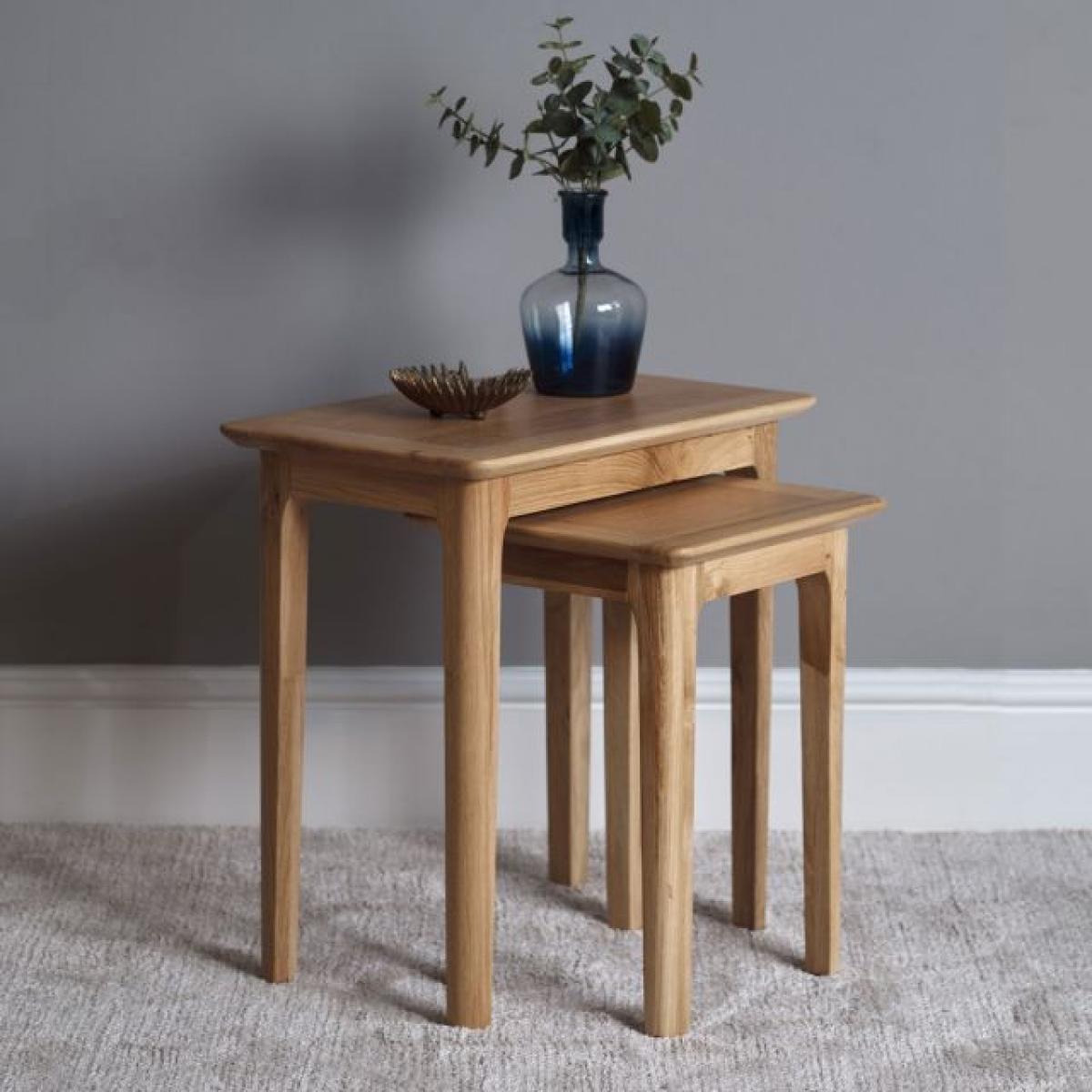The Trento. Oak nest of tables. Has been beautifully crafted with a lovely natural looking finish. This oak nest of 2 tables is so versatile, you'll wonder how you ever lived without them. If you have guests over and there's nowhere to put their cuppa, your nest is the ideal solution. Just remember to use a coaster! This oak nest of tables will add a touch of Scandinavian style to your home. Team with rest of the Trento oak furniture collection to complete the look. Dimensions when stacked H50cm x L50cm x W32cm.