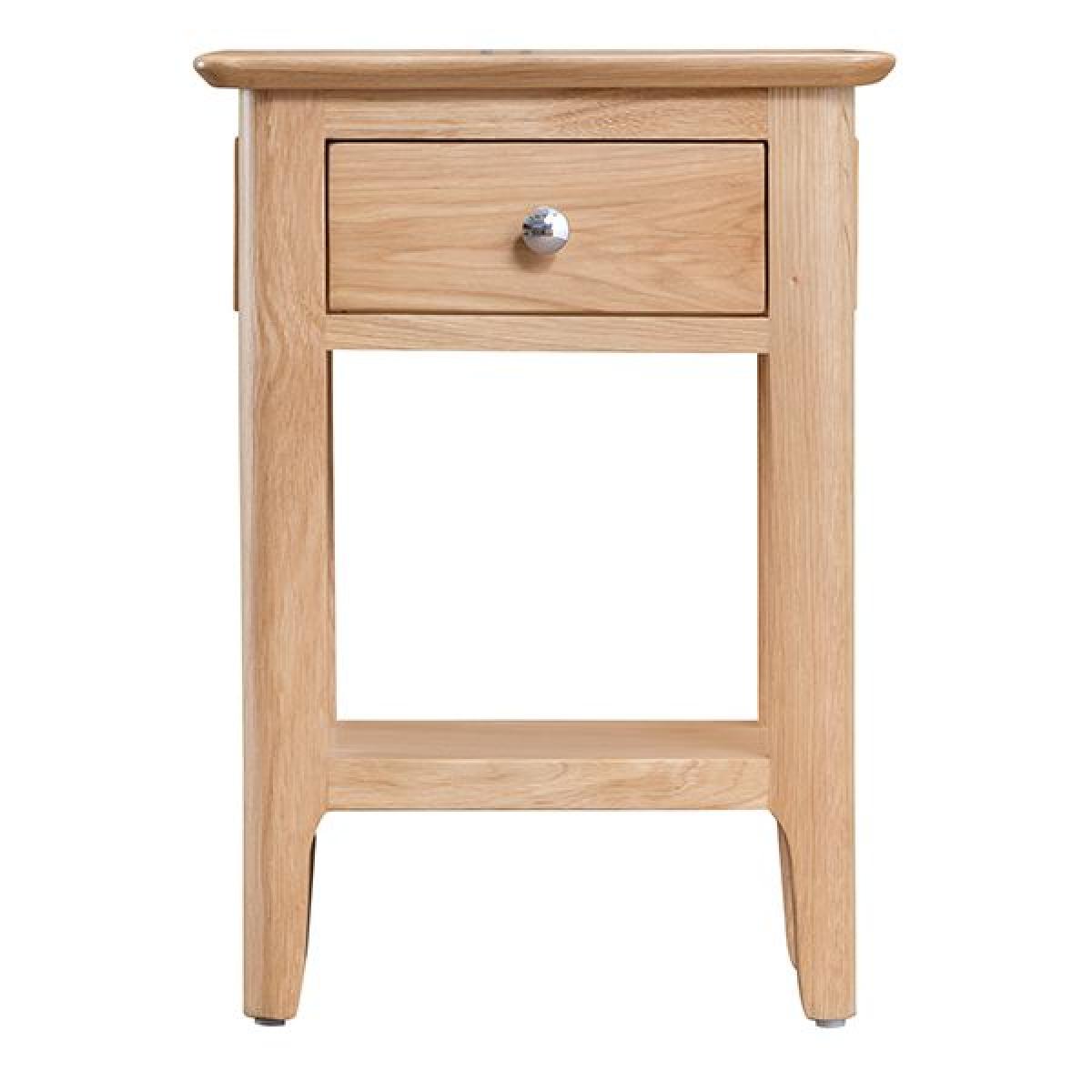 The Trento. Oak side table. With drawer has been beautifully crafted from oak with a lovely natural looking finish. Featuring a handy drawer and low shelf, this oak side table will add a touch of Scandinavian style to your home. Team it with rest of the Trento oak furniture collection to complete the look. Dimensions H55cm x W40cm x D32cm.