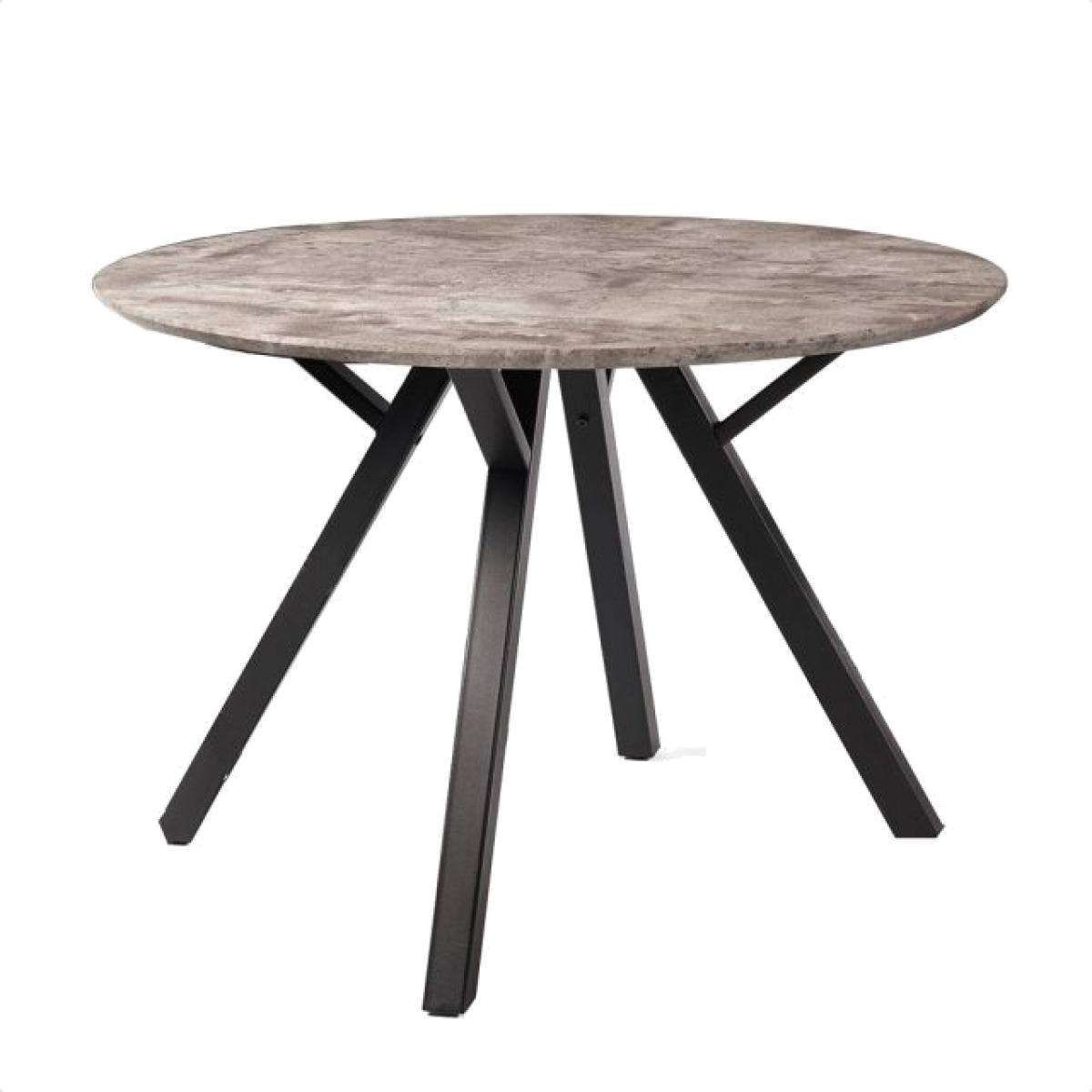 This contemporary Trento round dining table has been created with a stylish industrial look, a striking piece that will look great in any modern living space. The concrete effect table top sits upon fabulous steel powder coated legs. The Trento Grey Dining Chair is a must have to complete your new dining table and complements the dining table perfectly. Concrete effect Table top Steel powder coated legs Assembly required Dimensions: 110cm (W) x 110cm (D) x 76cm (H) All screens vary in colour reproduction and whilst every effort has been made to display the colour as accurately as possible it is for guidance only.