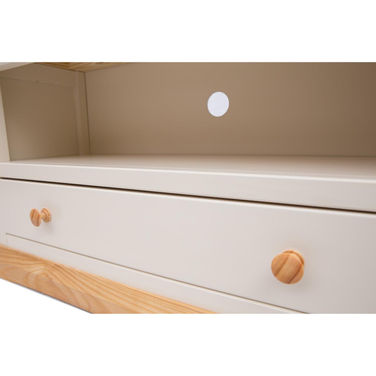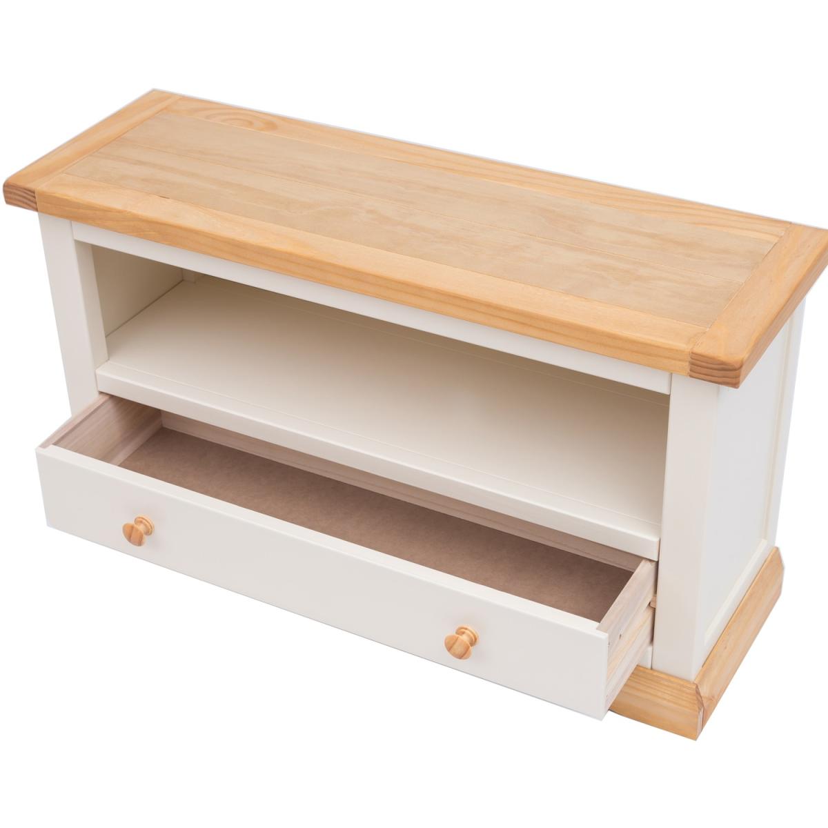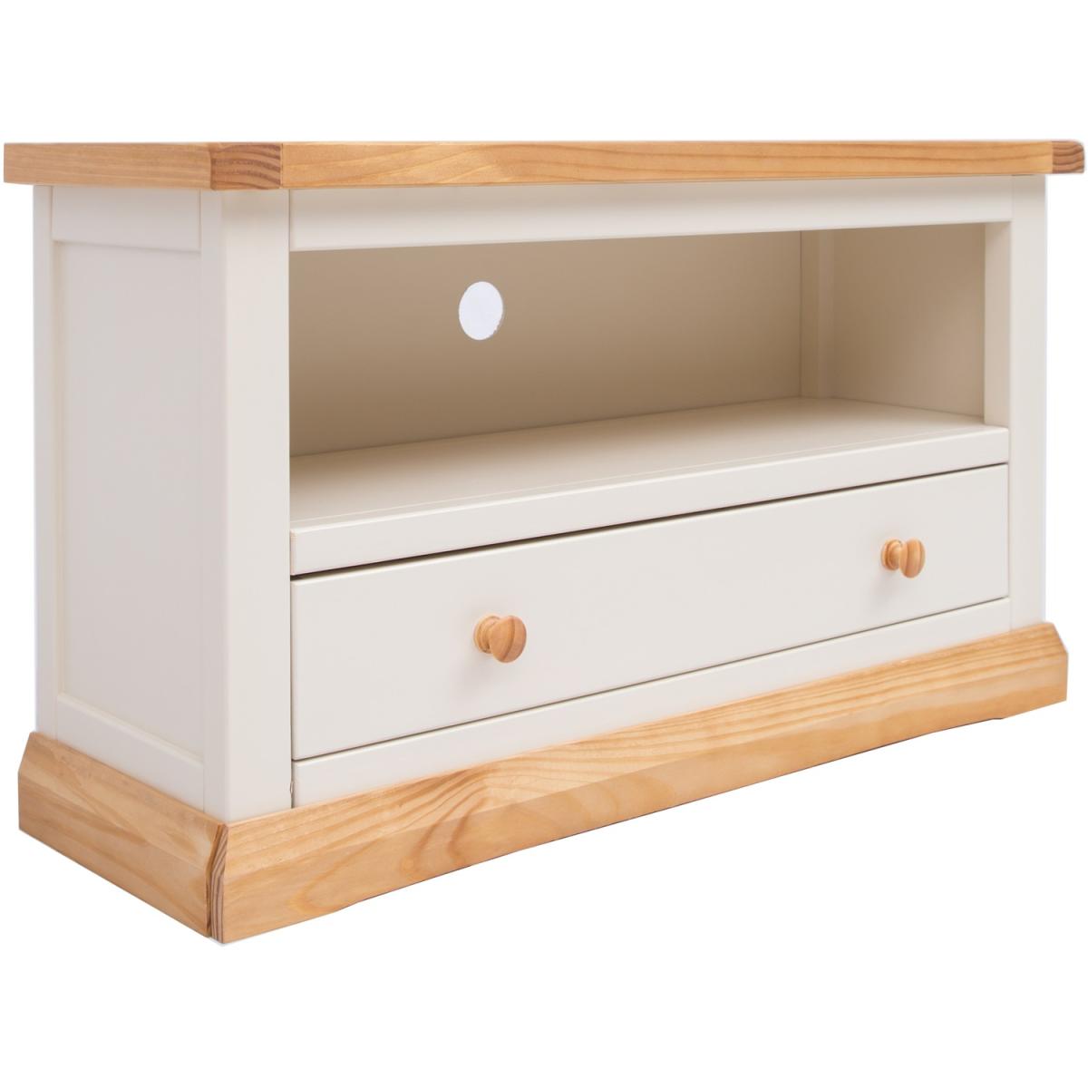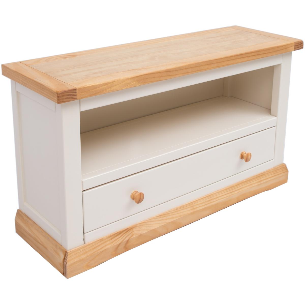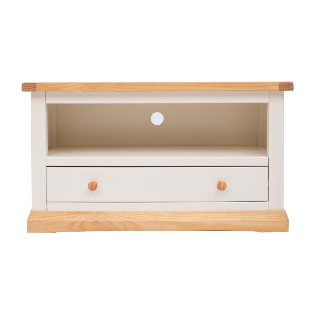 Our Trevi collection has a simple but pleasing design and is produced by our skilled craftsmen to the highest standards using responsibly sourced wood and veneers. All tops are made using a combination of solid pine wood and veneers and are carefully hand waxed giving them a great look. The body is finished with high-quality eco-friendly water-based paint in an off-white colour. A compact and stylish TV unit with a full-width drawer at the bottom to store your remote controls and games consoles out of the way. Above the drawer is an open space for digital boxes or players, access for wiring is made easy by the cable holes cut out in the back of the unit.