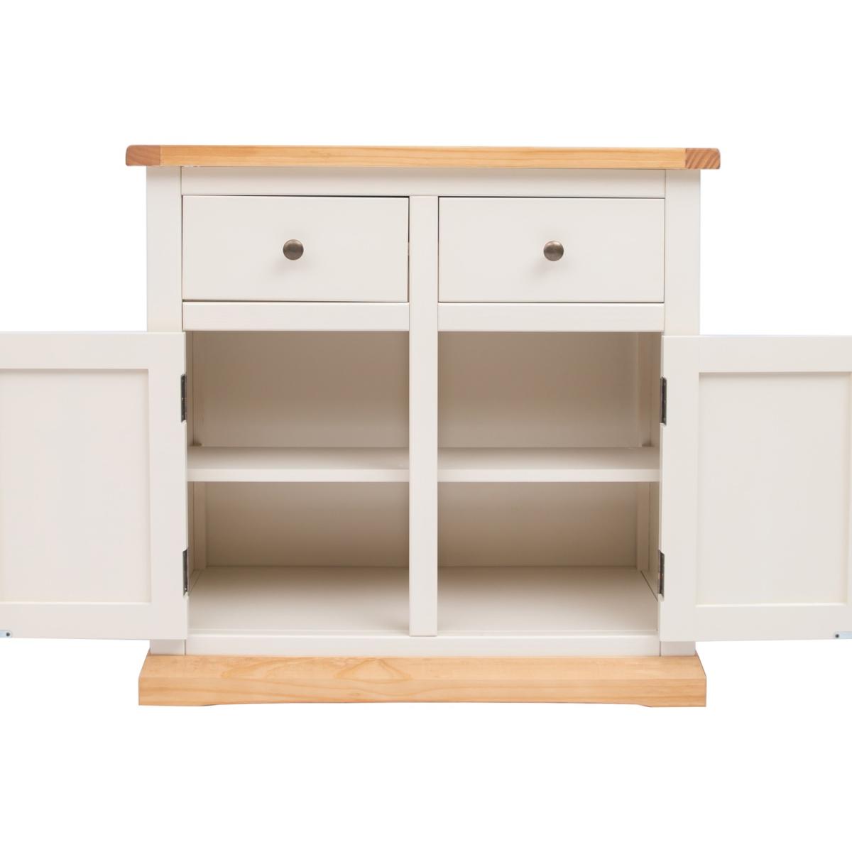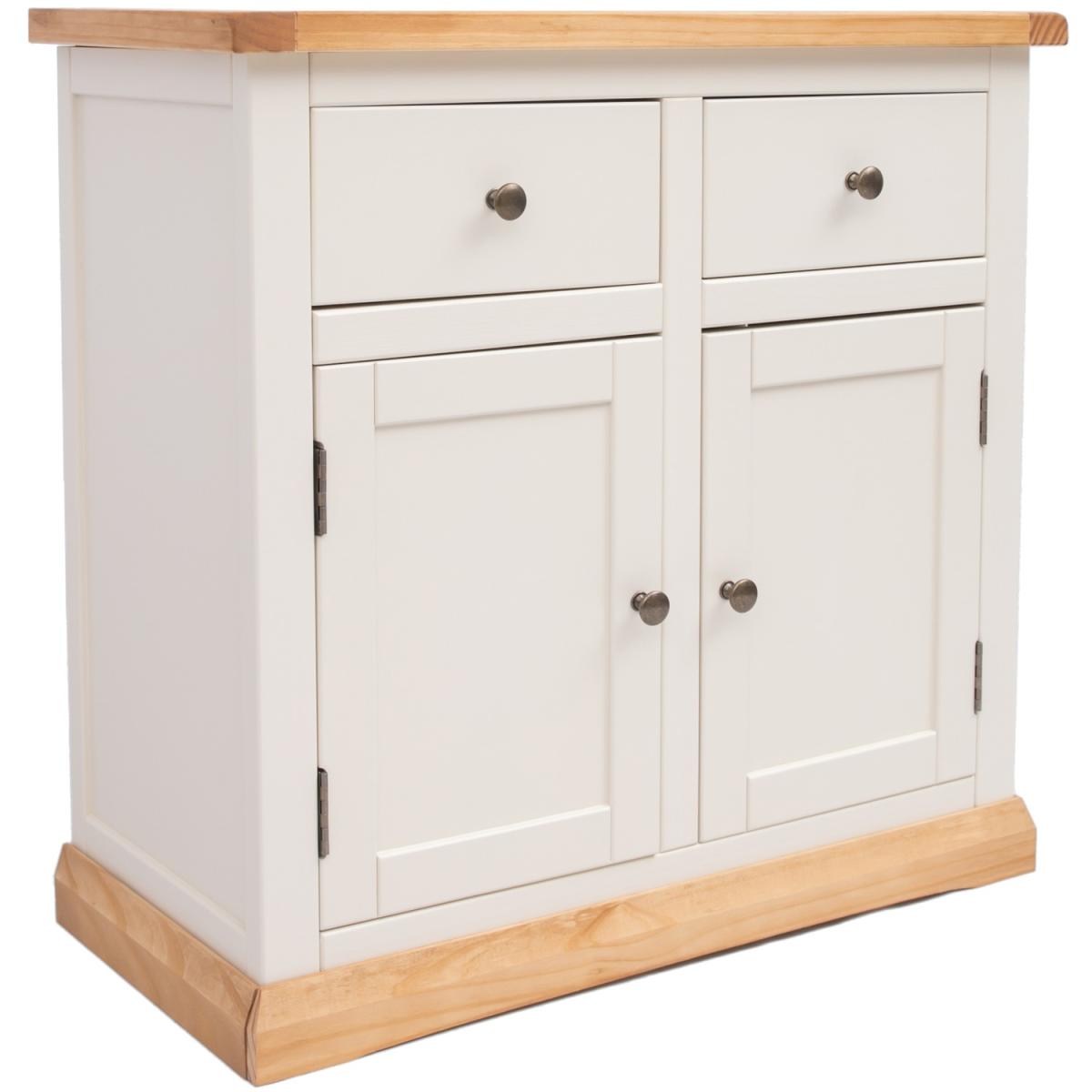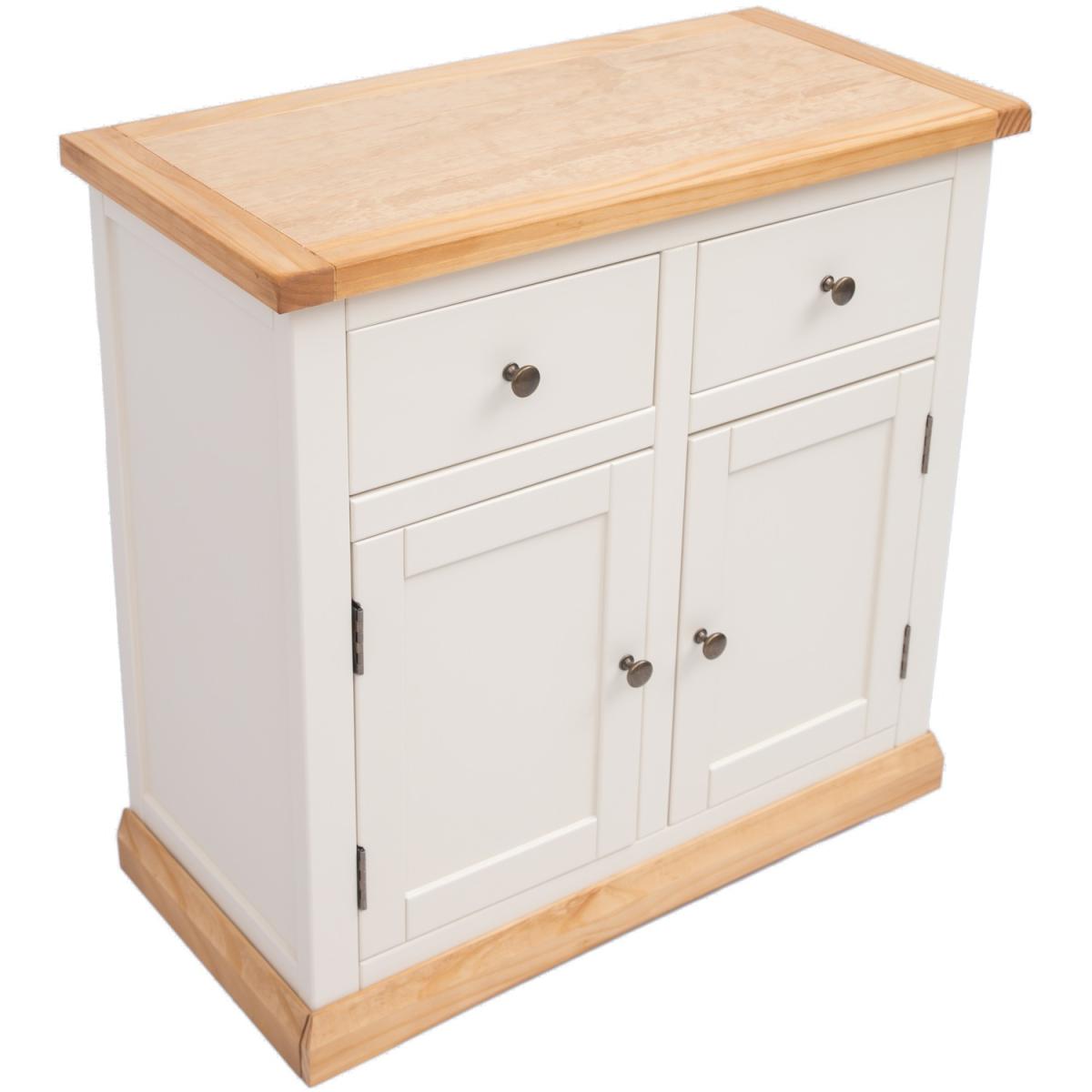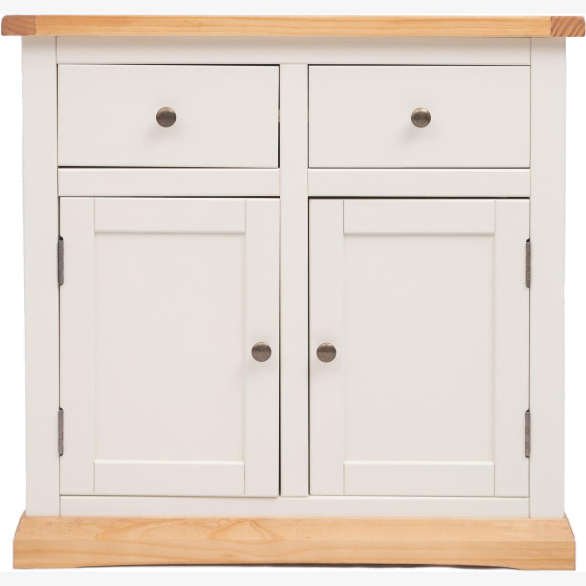 Our Trevi collection has a simple but pleasing design and is produced by our skilled craftsmen to the highest standards using responsibly sourced wood and veneers. All tops are made using a combination of solid pine wood and veneers and are carefully hand waxed giving it a great look. The body is finished with a high quality eco-friendly water base paint in an off-white colour. A compact 2 door 2 drawer sideboard ideal for your kitchen, dining room or lounge. The two doors conceal a large cupboard space for storing crockery, bottles or glassware and there is a shelf to help you organise your contents too. Above this there are two drawers for cutlery, napkins, place mats or maybe even keeping essential paperwork to hand. These attributes combined with a simple construction for easy assembly makes it a great value product to be taken home today.