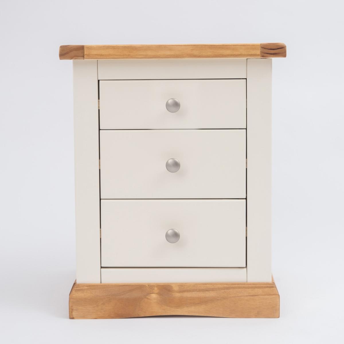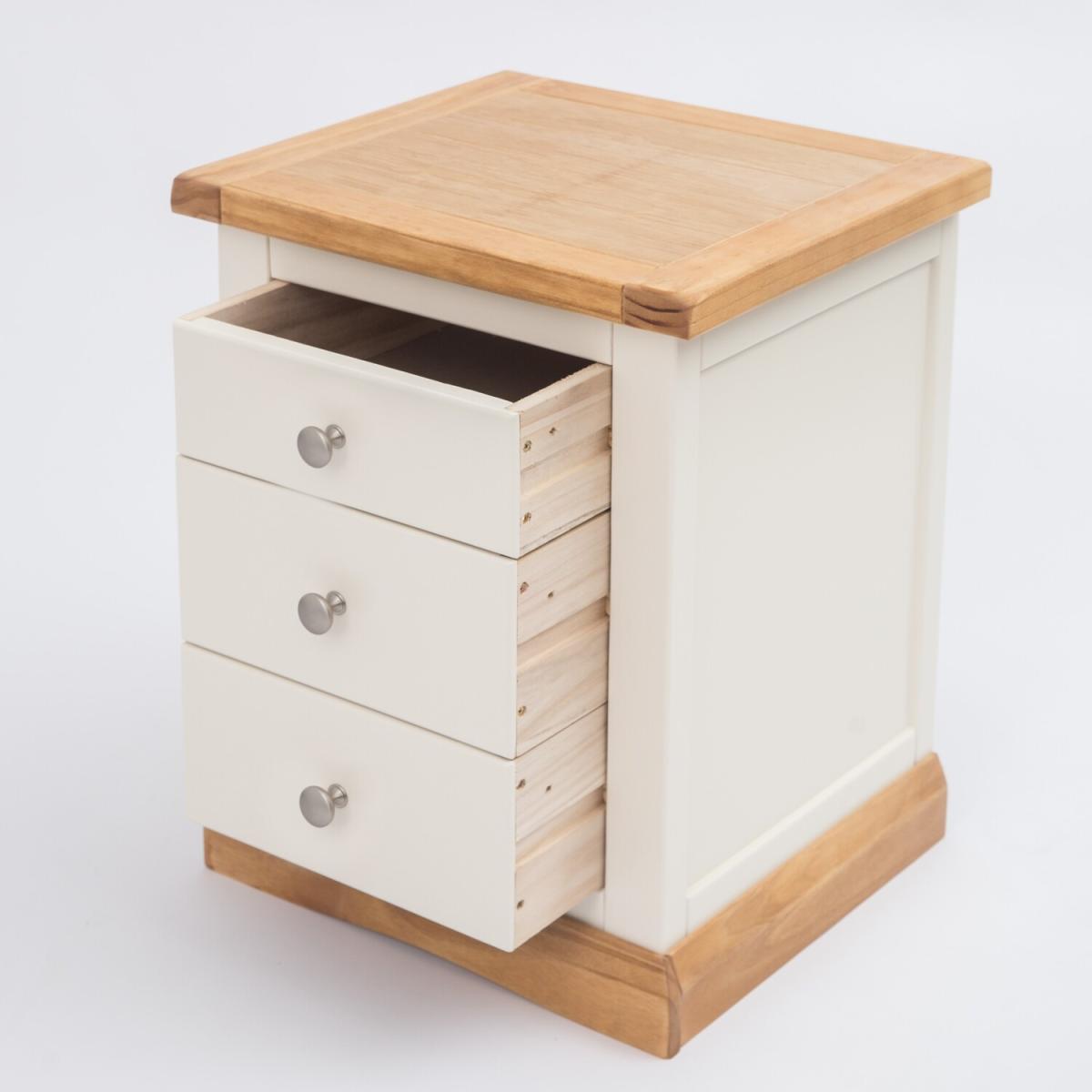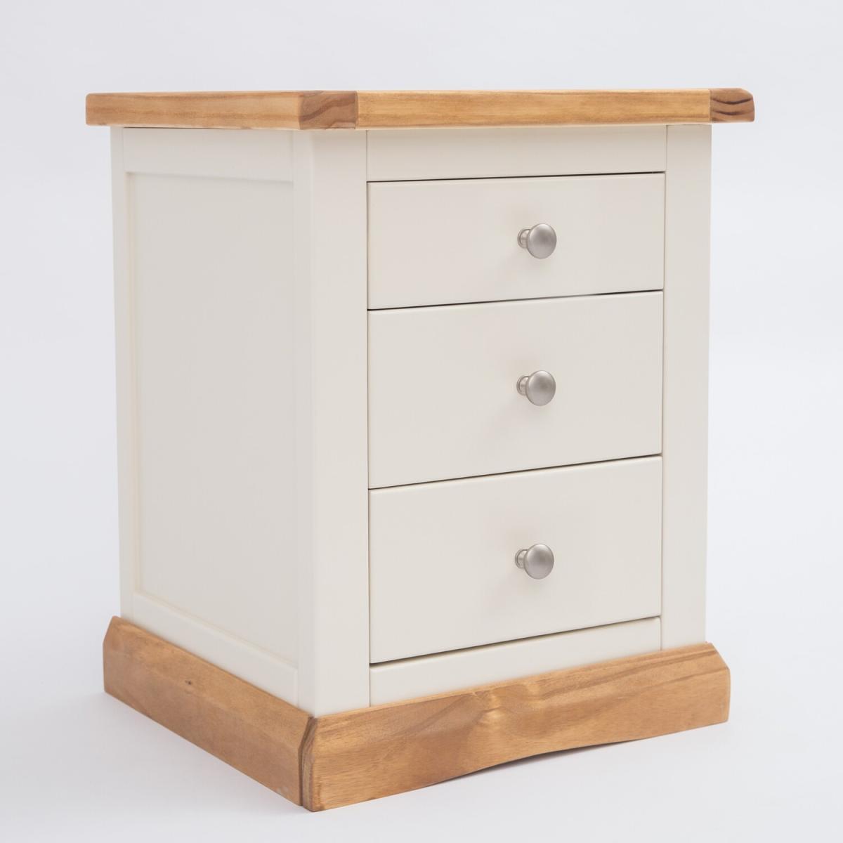 Our Trevi collection has a simple but pleasing design and is produced by our skilled craftsmen to the highest standards using responsibly sourced wood and veneers. All tops are made using a combination of solid pine wood and veneers and are carefully hand-waxed giving them a great look. The body is finished with high-quality eco-friendly water-based paint in an off-white colour. A combination of drawer sizes means this 3-drawer bedside allows for flexible storage. The top drawer is shallow and perfect to house your reading material, medication or jewellery. The two drawers below are deeper and ideal for storing underwear or accessories. These attributes combined with a simple construction for easy assembly make it a great value product to be taken home today.