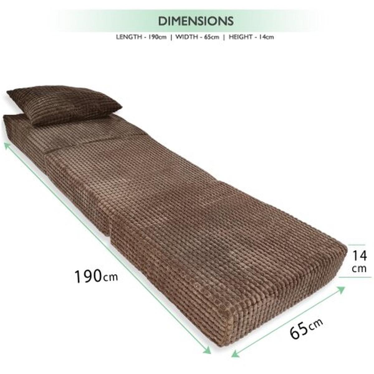 Replace your airbed with the 3 way folding futon mattress, for a no fuss solution to an extra place to sleep. The luxury Z Bed is perfect for camping, travelling and sleepovers. Its lightweight and foldable qualities mean it is easily transported and great for storage when not in use. The soft, removable, jumbo cord cover provides additional comfort to the firm foam mattress. The Z bed is 14cm thick, a great depth to prevent you from feeling any of the ground's lumps and bumps upon laying or sitting on this item. Dimensions unfolded - 63x190x14 cm, suitable to adults and children. IDEAL FOR SLEEP-OVERS, UNEXPECTED GUESTS OR CAMPING - The folding mattress pad offers a quick solution for guests, sleepovers or when you're the road. It is space-saving when folded up and ideal for camping or traveling. FOLDABLE AND EASY TO STORE OR TRANSPORT - Dimensions unfolded: 65x190x14 cm. This futon can be folded and stored just about anywhere. In a wardrobe, mobile traveler or simply under the bed. Dimensions folded: 63x65x45cm. The 3-way foldable mattress for adults and children is lightweight for easy transport. MEDIUM HARD FOAM CORE - Weight: 5kg. The spare guest z-bed has high-quality air foam padding with comfort foam which provides good support, thus ensuring restful sleep. This medium firm mattress has a good air and moisture exchange. SOFT, REMOVABLE COVER - The foldable matress has a plush, soft, jumbo cord cover for extra comfort. It is also removable making it easy to clean and maintain. The deluxe Z-Bed is available in 3 colours: Light Brown, Dark Brown and Grey. MANUFACTURED IN THE UK - Made in the UK and conforms to all British Fire Safety Regulations. Comes ready filled with fast delivery.