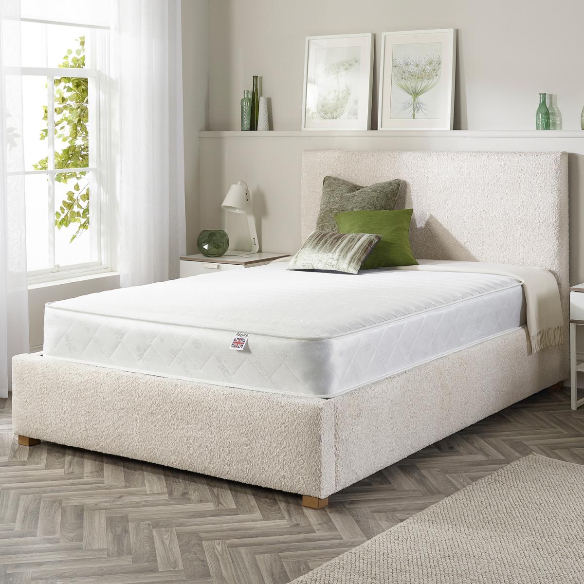 Looking for a budget mattress that doesn't sacrifice on comfort and quality Look no further than the Triple Layer 900 Pro Hybrid Rolled Mattress from Aspire Essentials. This mattress has been carefully designed with superior features to provide the best possible sleep experience at a value price point. At the heart of the Triple Layer 900 Pro Hybrid Rolled Mattress lies a premium Bonnell spring system. This provides excellent support for your back, neck and shoulders, ensuring that you wake up feeling refreshed and revitalized. The unique 3-layer Eco Foam construction, including eco foam fillings made from 100 recycled materials, adds an extra level of comfort and support to the mattress. The result is a medium-firm mattress that is both comfortable and eco-friendly. But what sets the Triple Layer 900 Pro Hybrid Rolled Mattress apart from other budget mattresses is its Aspire Cool Touch sleep surface. This innovative technology ensures that you stay cool and comfortable throughout the night, even on the warmest of evenings. The breathable fabric helps to regulate your body temperature, so you can wake up feeling refreshed and ready to tackle the day ahead. The Triple Layer 900 Pro Hybrid Rolled Mattress has been manufactured in the UK to the highest standards, ensuring that you get the best possible quality. We've also taken care to minimize our environmental impact by vacuum packing and rolling the mattress, making it easy to transport and reducing its carbon footprint. Upgrade your sleeping experience with the Triple Layer 900 Pro Hybrid Rolled Mattress from Aspire Essentials, the budget mattress that doesn't compromise on quality or comfort.