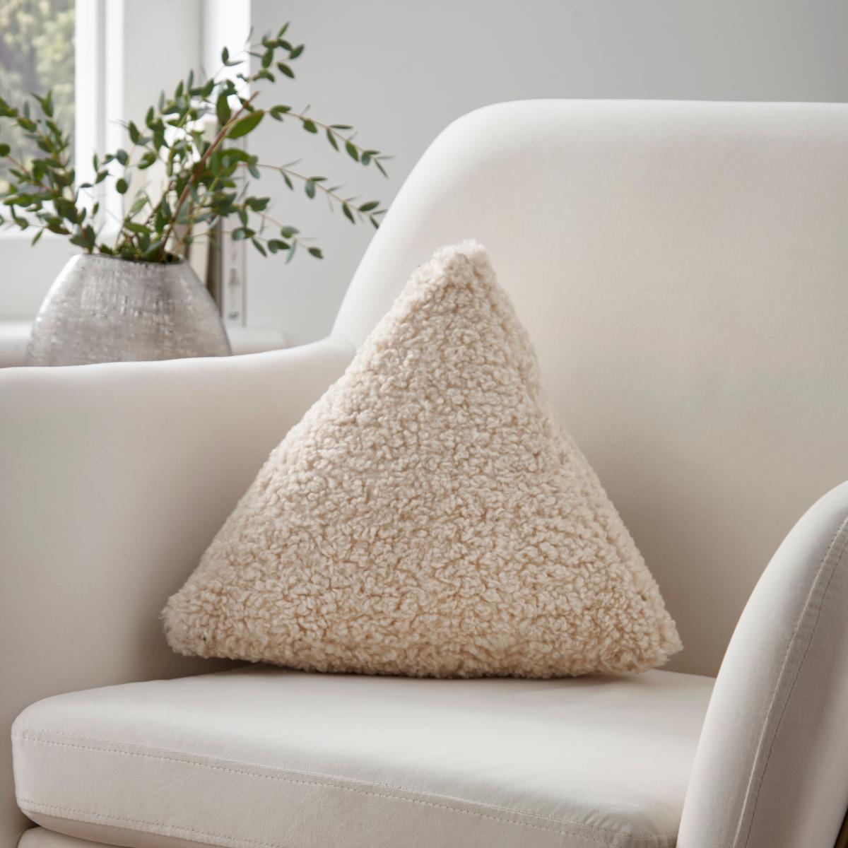 I love this little triangle cushion for its modern yet cosy look. Its boucle texture adds a contemporary twist to softer interiors, making it a versatile piece for both relaxed living rooms and cozy bedrooms. It works particularly well styled on neutral-toned sofas or armchairs to add a tactile layer of interest. For practical styling, try pairing it with other textured cushions in complementary shades to create a layered, inviting feel, or use it as a statement piece on a bed or chaise longue. Its compact shape makes it an ideal accent that can easily be moved around to refresh your space without overwhelming the overall aesthetic.