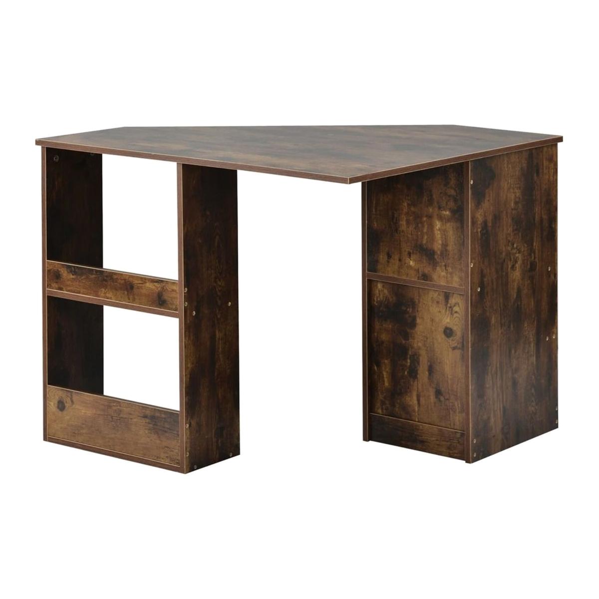 I’m a fan of this brown corner desk because its triangular shape makes the most of awkward nooks while offering both open shelving and a drawer for tidy storage. The warm wood finish works equally well in a relaxed Scandinavian scheme, an industrial loft or a cosy farmhouse study. Styling-wise, keep the desktop clear except for a slim lamp, a neat pen pot and one or two books to avoid visual clutter. Position a trailing plant on an upper shelf to soften the lines, and pair the desk with a simple upholstered chair in neutral fabric. For extra impact, add a slim rug beneath and hang a small pinboard or artwork above to frame your workspace.