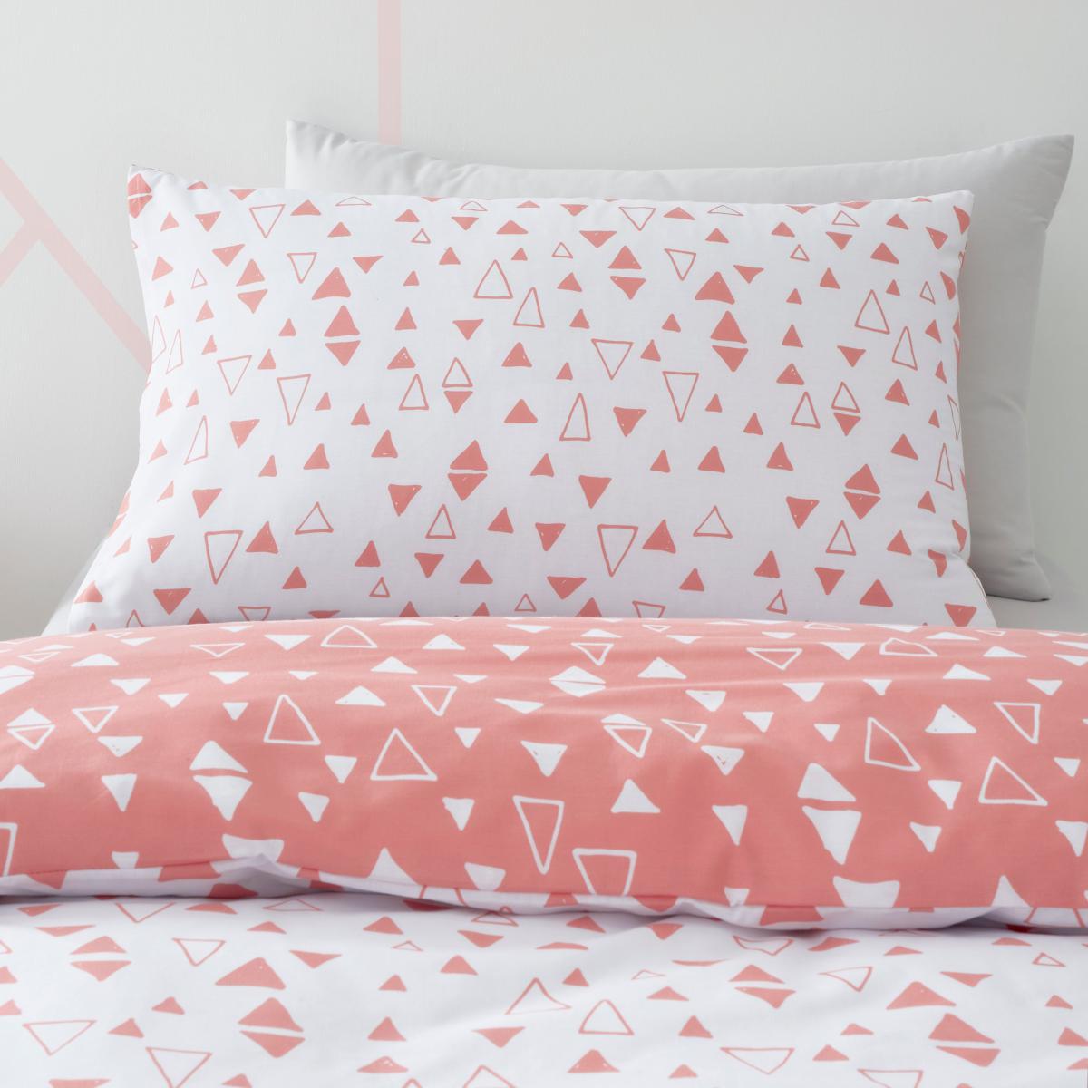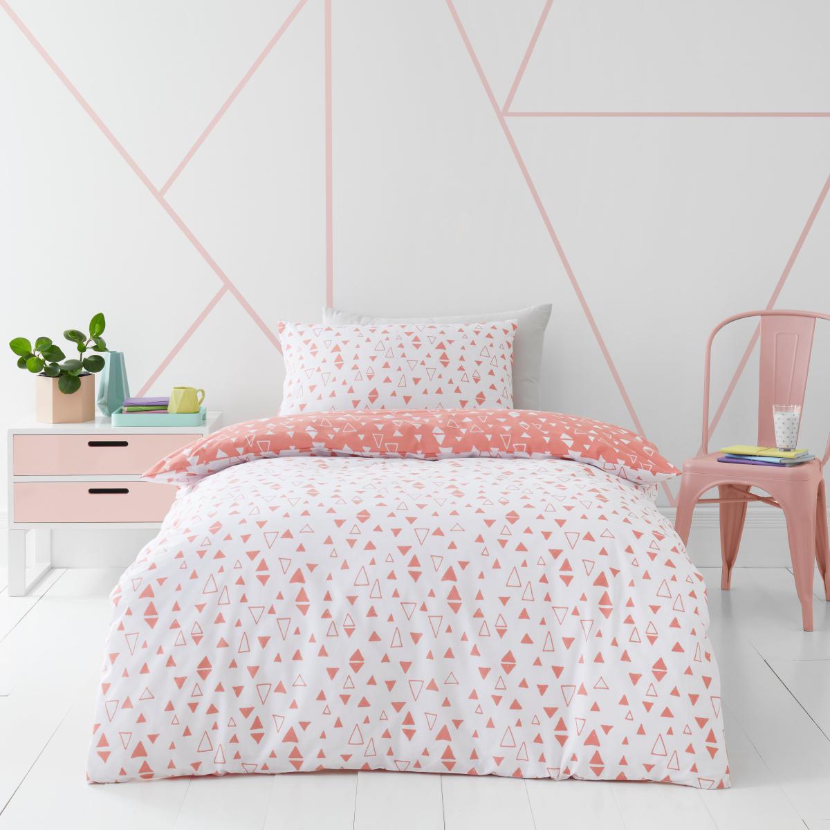 Boasting a stylish geometric triangles design, this coral colour duvet cover and pillowcase set is perfect for your teenager. The design is fully reversible with a contrasting colourway which provides the opportunity for a quick style swap. A polycotton material boasts easycare qualities and can be fully machine washed. This collection is verified by OEKO-TEX® and independently tested for harmful substances as well as manufactured using sustainable processes under socially responsible working conditions. MADE IN GREEN by OEKO-TEX® is a unique product label to trace the countries and production facilities - search the product label for more information.