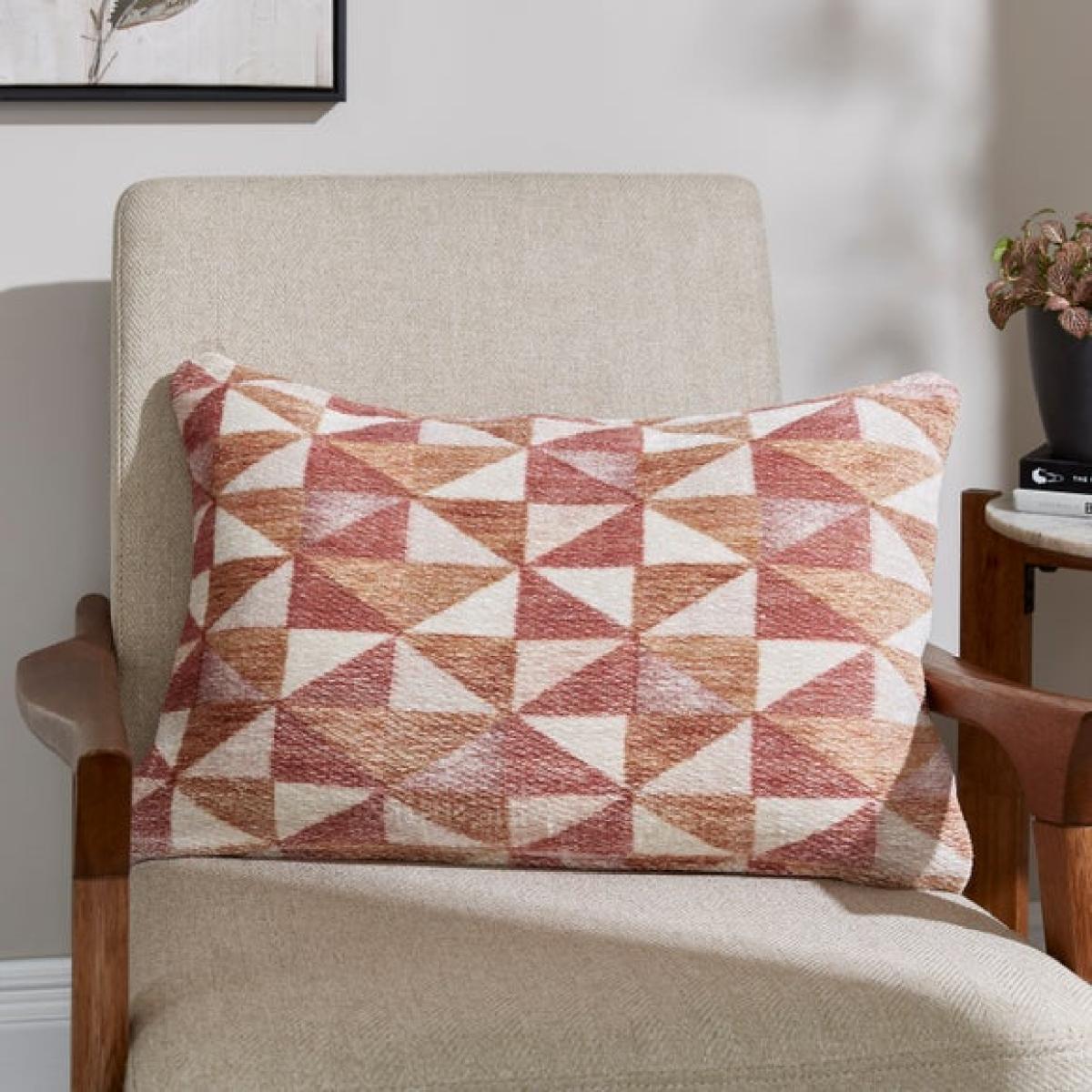* Geomertic pattern * Zip fastening * Unique design * 100% Cotton Angles never looked so good! This Printed Rectangle Cushion Cover brings unique geometric vibes to your space with a bold triangle print that makes even your throw pillows feel intellectual. Zip fastening included for easy stuffing and fluffing.