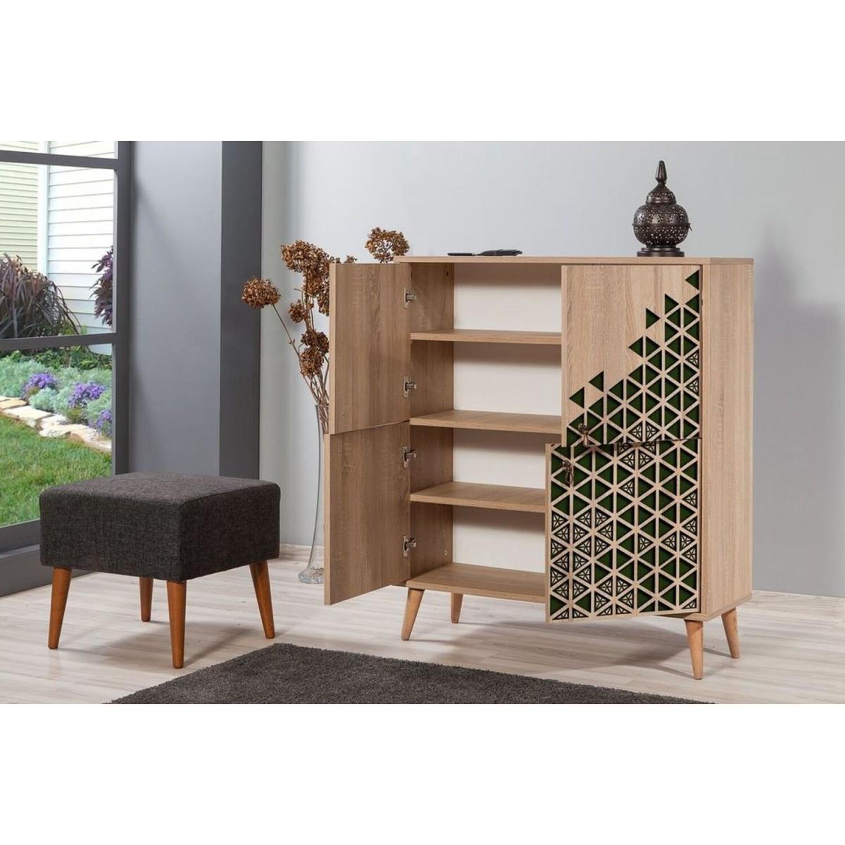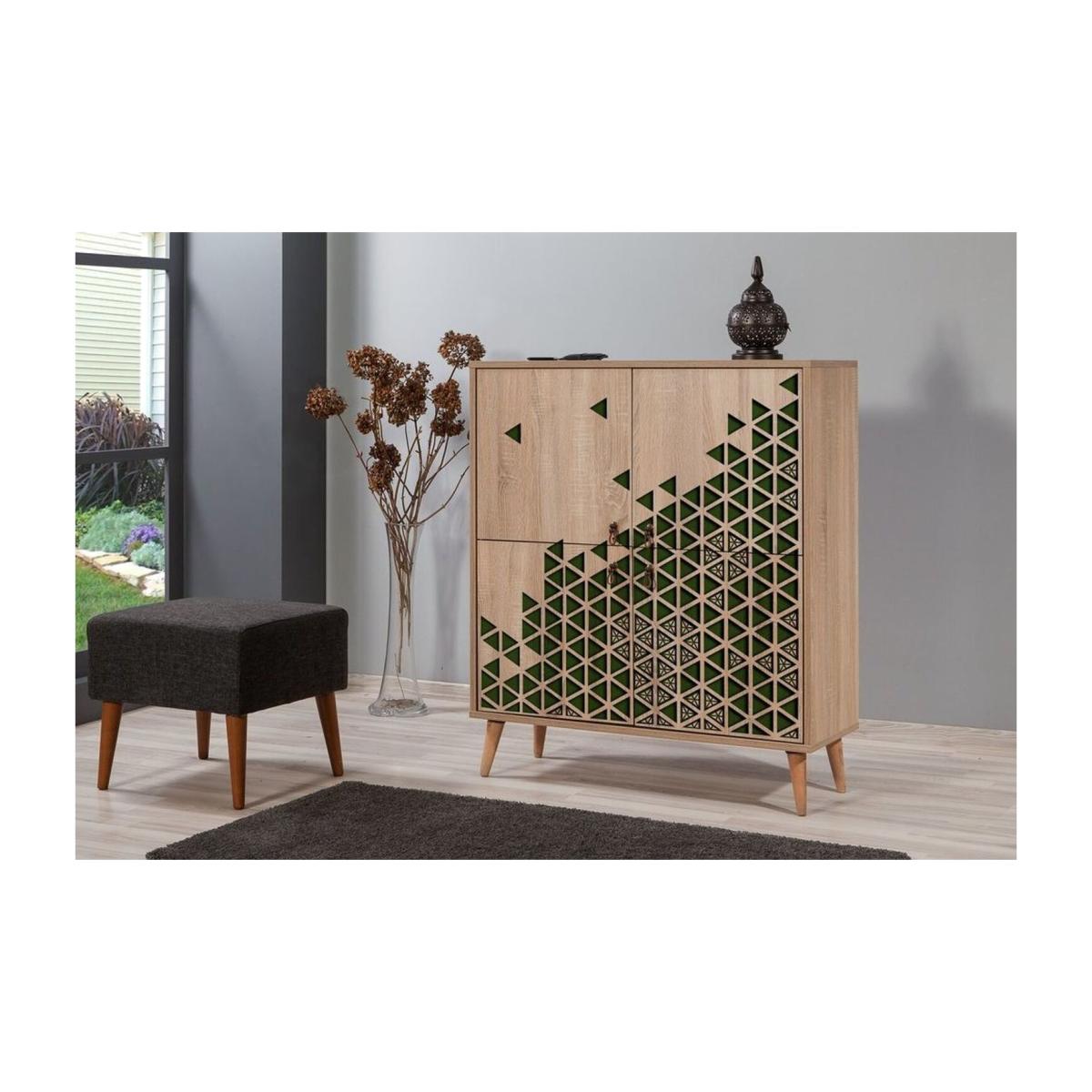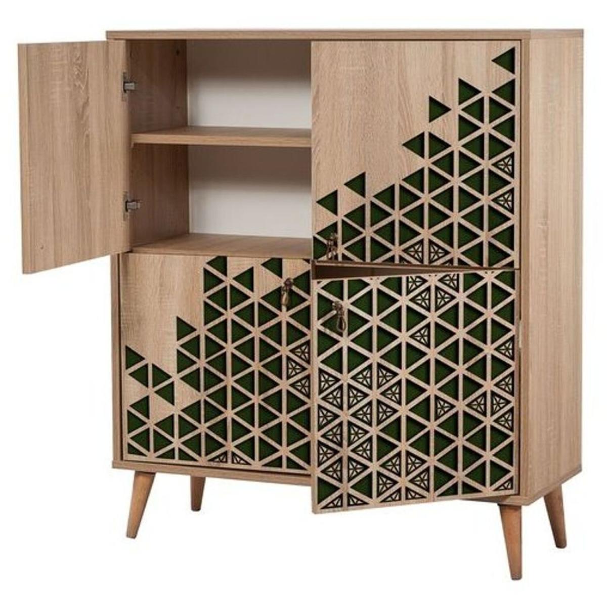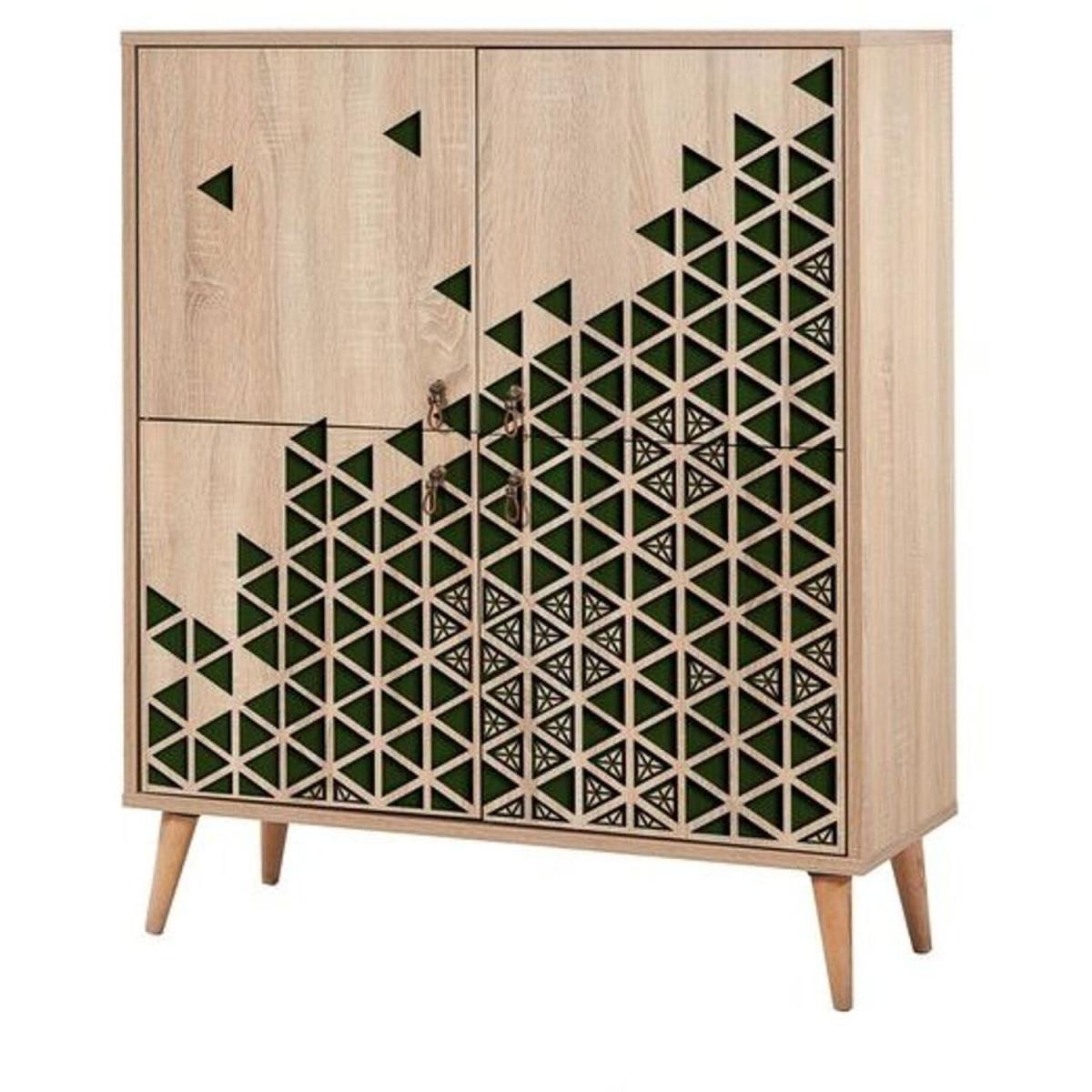 The Triangle Green 121 sideboard is a sleek, modern piece that adds a pop of colour and geometric interest to contemporary interiors. I love how the Atlantic Pine finish gives it a warm, natural feel, while the solid wooden legs add stability and a touch of Scandinavian charm. This sideboard works particularly well in open-plan living spaces, dining rooms, or even as a stylish storage solution in a hallway. For styling, consider layering with minimalist decorative objects, such as ceramics or small plants, to highlight its geometric design without overwhelming the space. It's equally versatile paired with neutral tones or contrasted with barker colours for a more vibrant look.