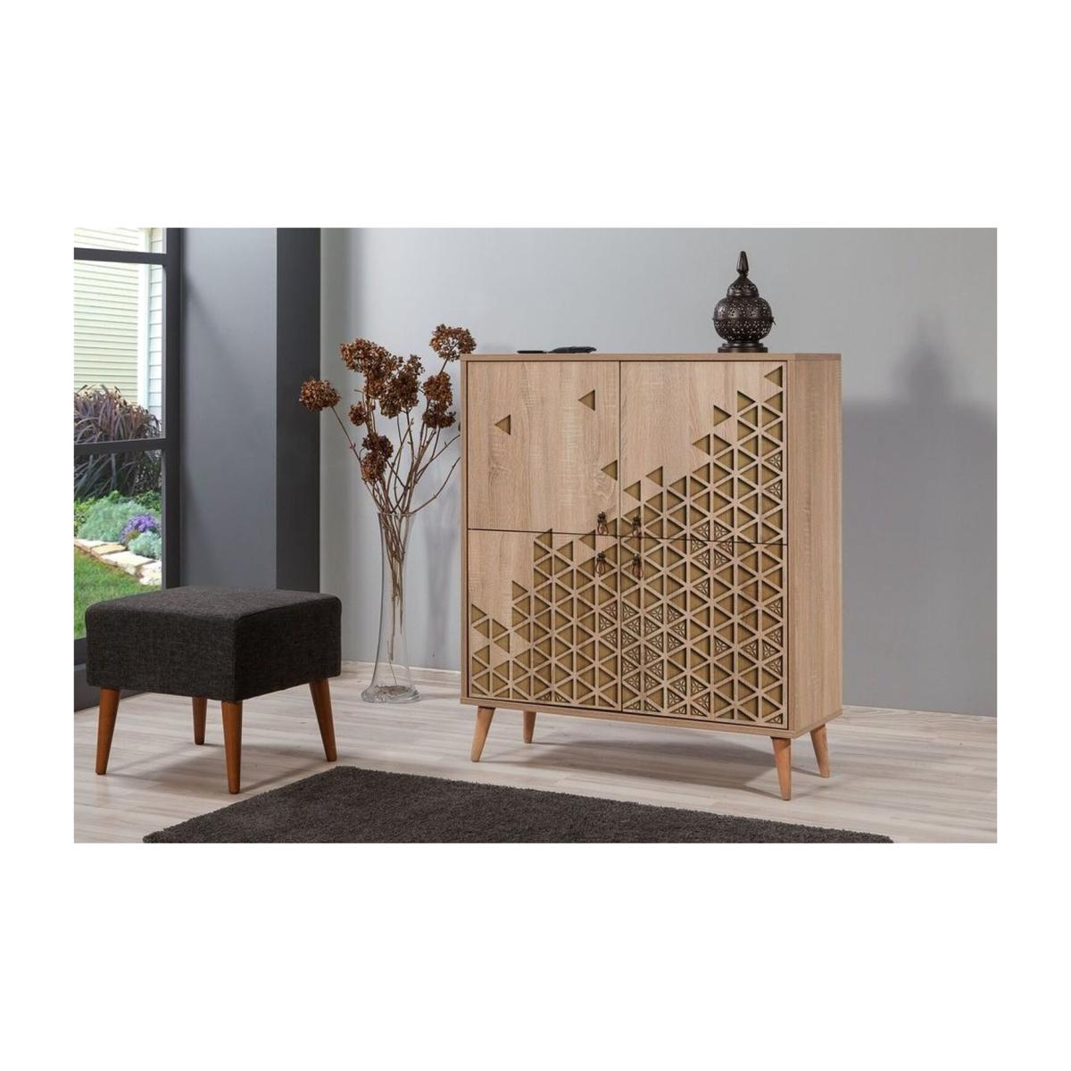 I love this sideboard’s clean lines and natural timber finish; it adds warmth and texture to both modern and Scandinavian-inspired interiors. Its solid wooden legs elevate the piece, giving it a light, breezy feel that works well in open-plan living spaces or dining areas. The unique triangle design on the doors provides subtle visual interest without overwhelming the room, making it versatile enough to pair with minimalist or more eclectic decor. Practical styling tips include using the top for decorative accents like vases or lamps, while the internal storage can hide away essentials, keeping the space tidy. It’s perfect for adding a touch of understated sophistication and functionality in contemporary homes.