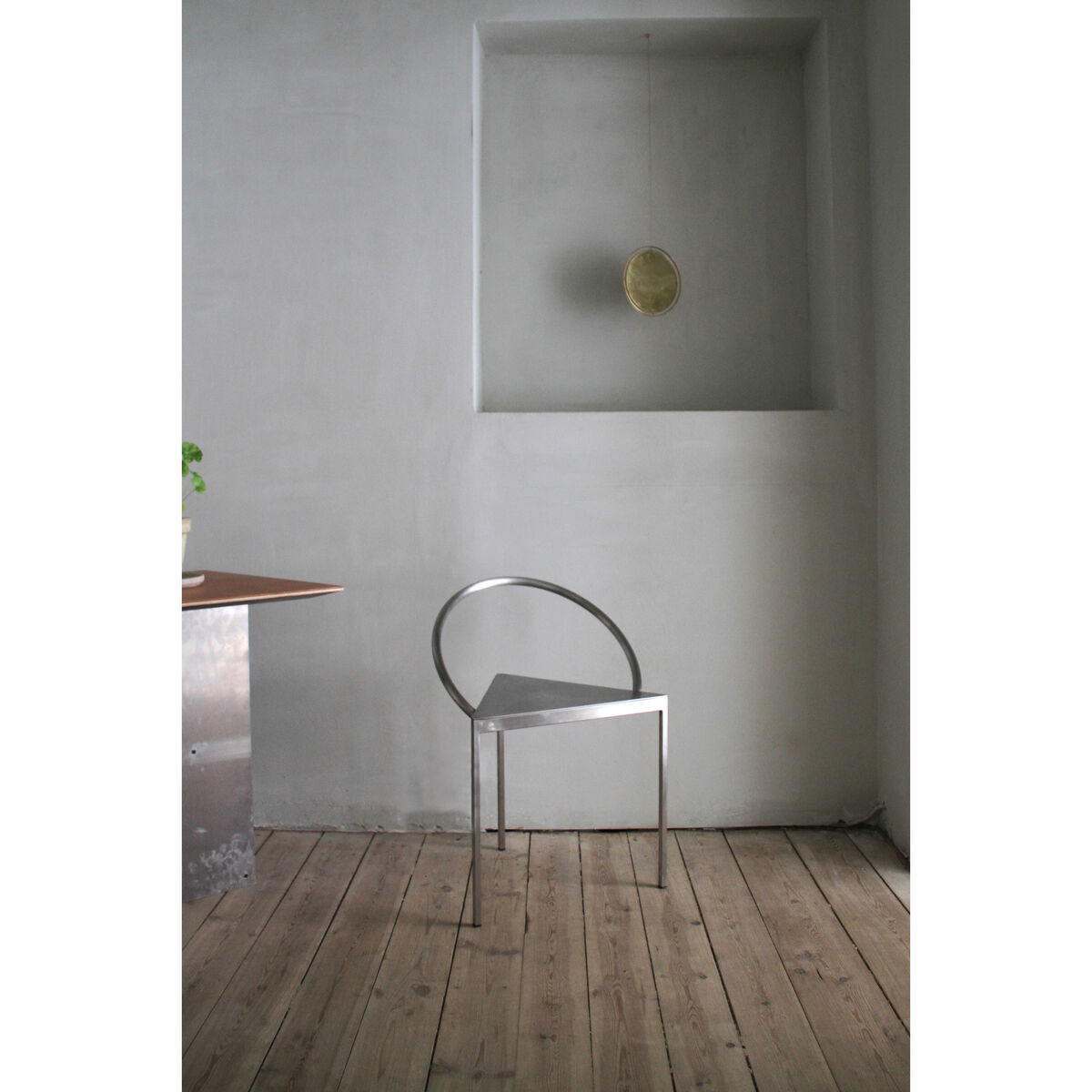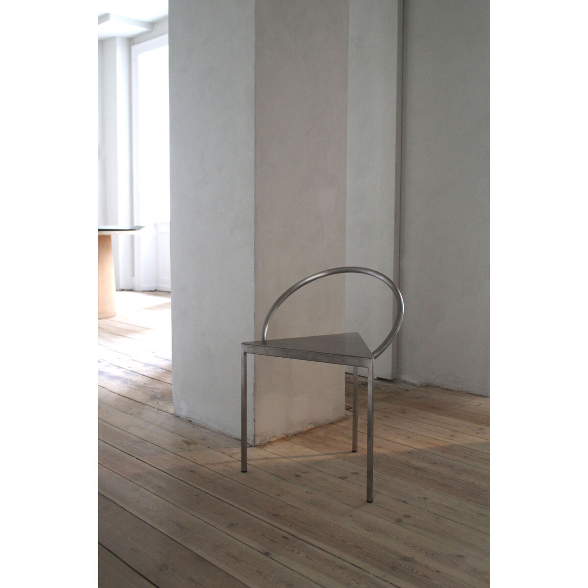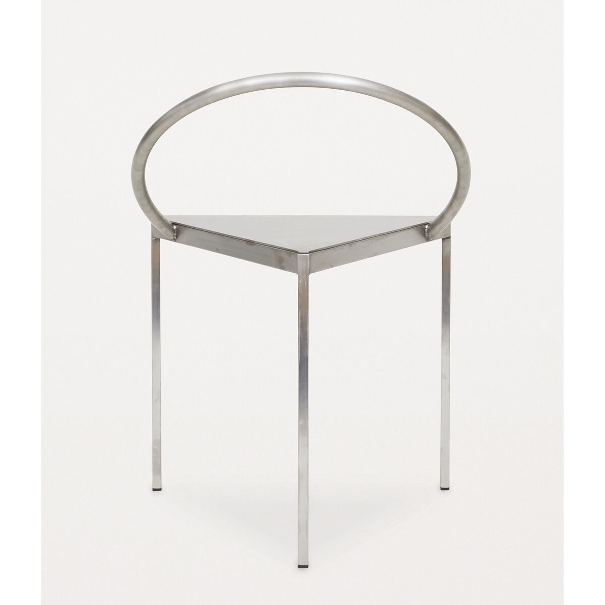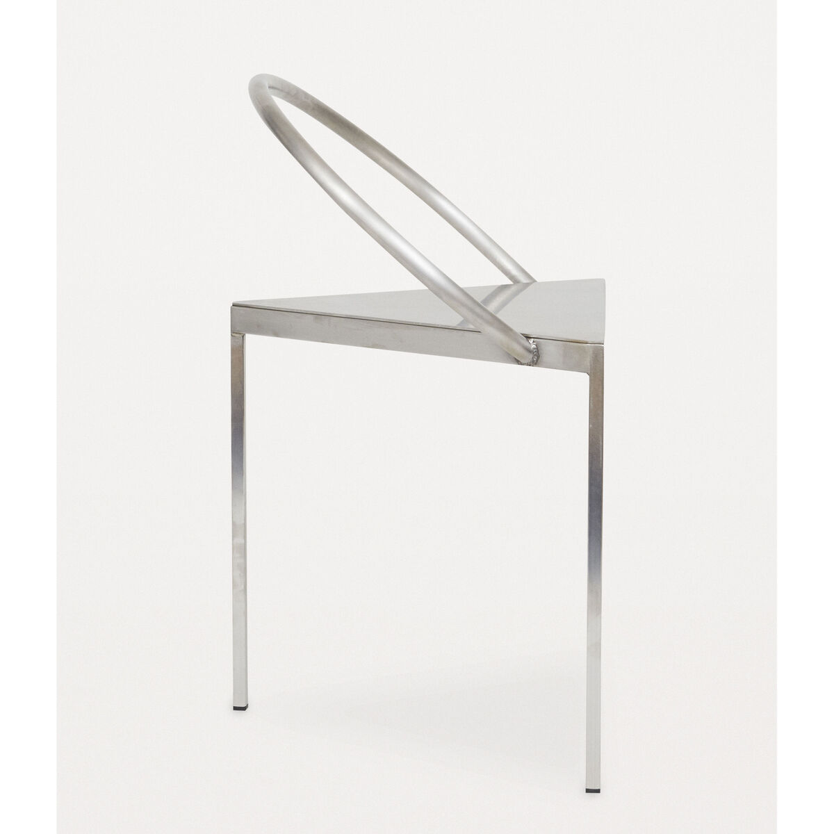 A totally stripped-back, ethereal structure for this incredible steel chair that's akin to a modern sculpture. The Triangolo chair was created in 1989 by Danish designer Per Holland Bastrup. Featuring a tripod base, it stands out for its triangular seat, topped off with a truncated inclined ring that serves as a backrest. An interlocking triangle and circle: these two essential, elementary geometrical forms give rise to a simple, expressive composition with perfect proportions. This sculptural, refined construction explores the notion of balance. Despite its apparent imbalance, this chair is perfectly stable. It can be used around a table, in a living room, an entrance, a bedroom... It captures the eye like a contemporary work of art.