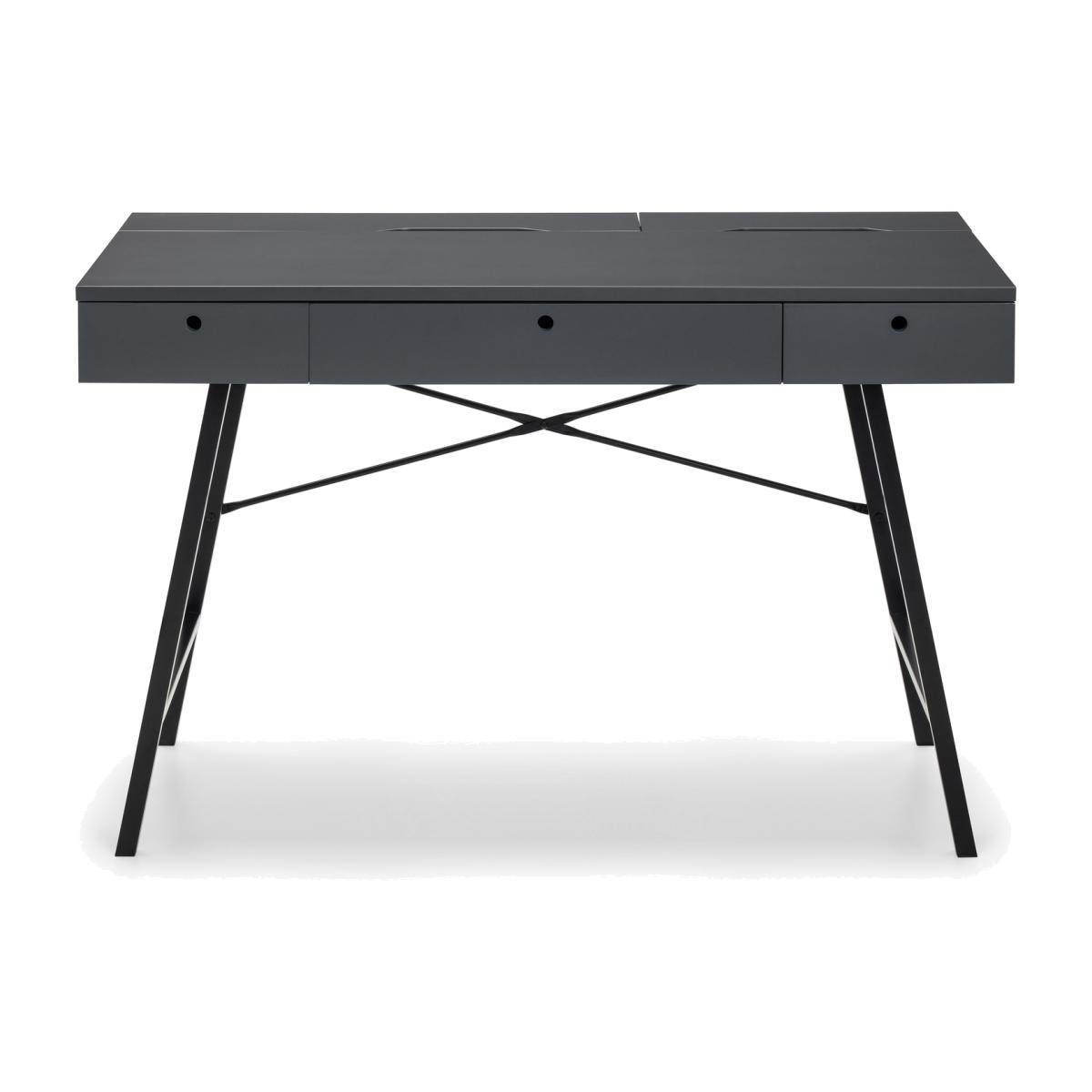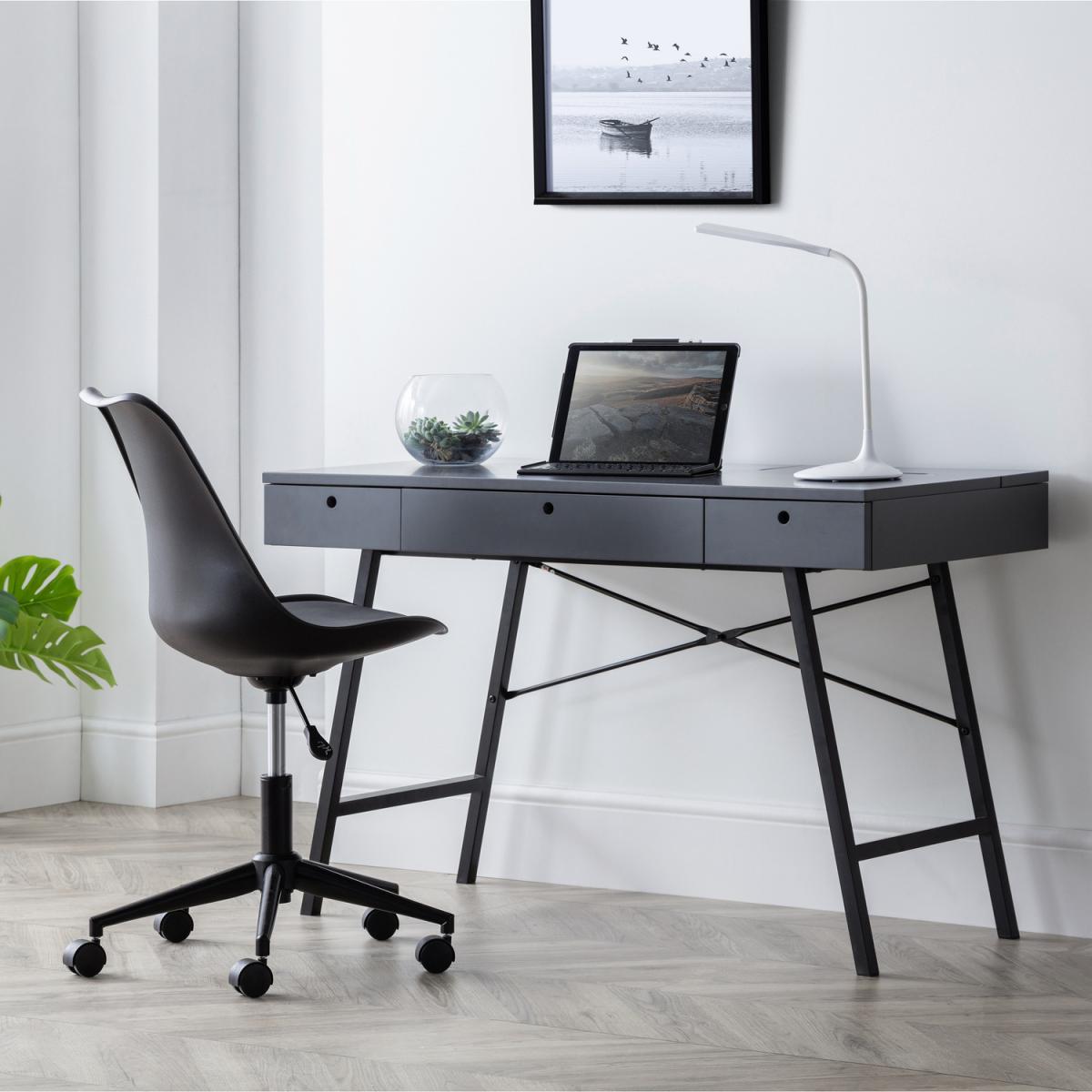 I’m a fan of this grey desk for its neat silhouette and discreet cable port - it keeps your workspace looking uncluttered without fuss. The slim drawers are perfect for stashing stationery or chargers, while the cross-brace legs add a touch of industrial edge. Styling tip: pair it with a black metal lamp and a simple ceramic pot plant for a contemporary Scandi feel, or dress it up with a leather desk pad and brass accessories in a more traditional study. Tuck a slim basket underneath for extra storage and position it against a pale wall with a frameless print above to make the desk the centrepiece of your room.