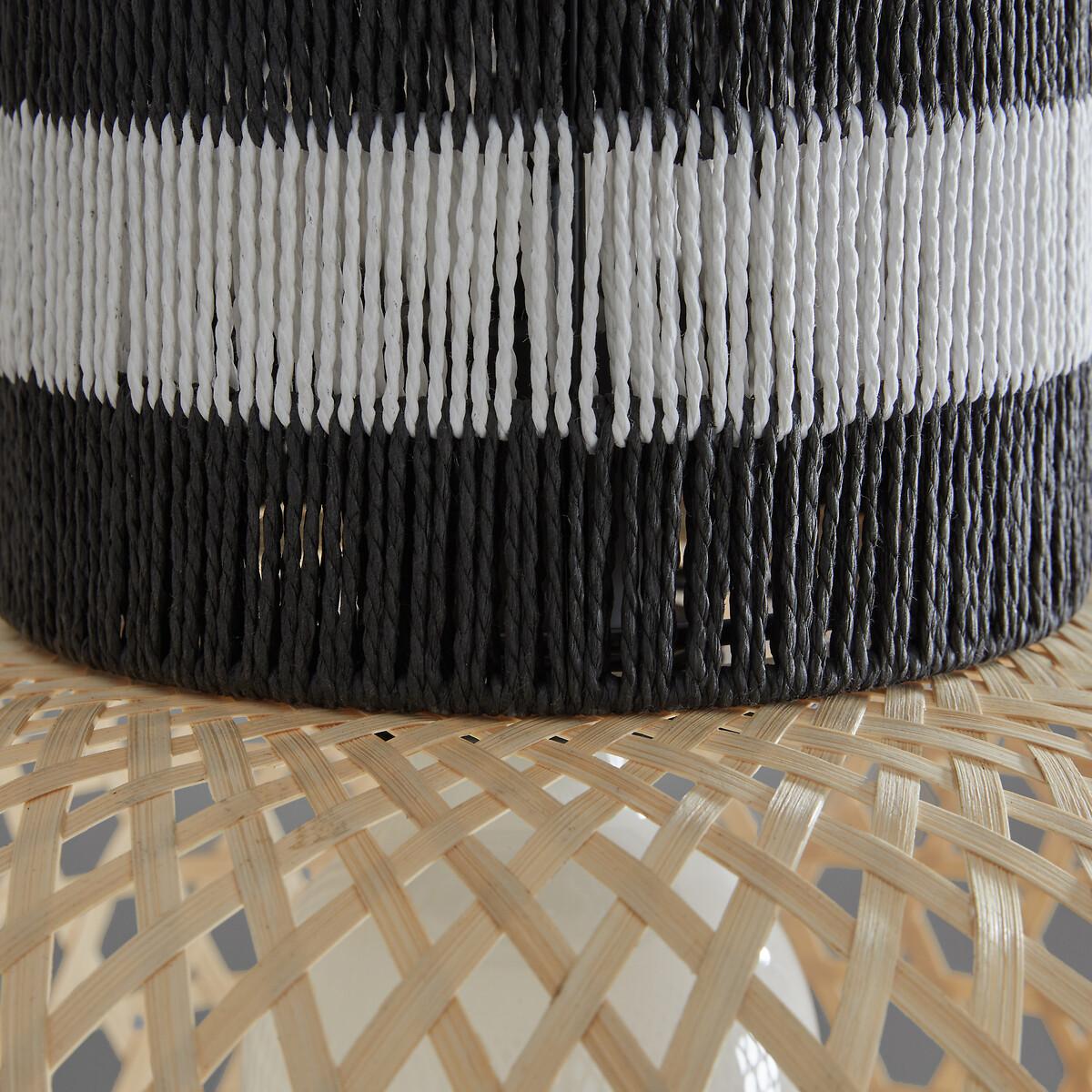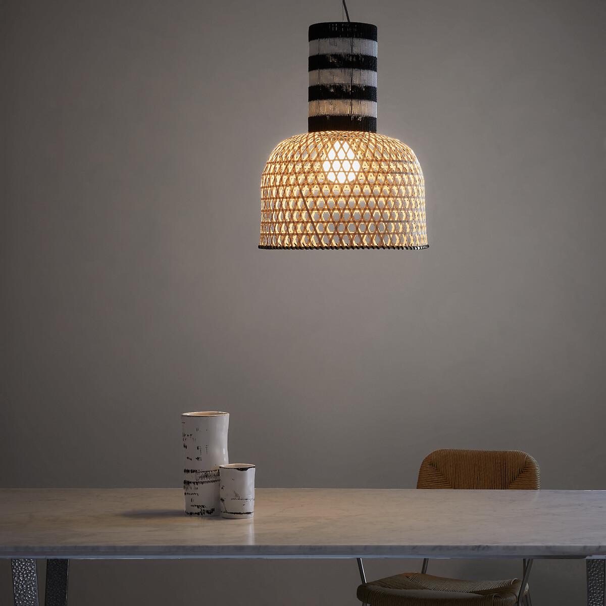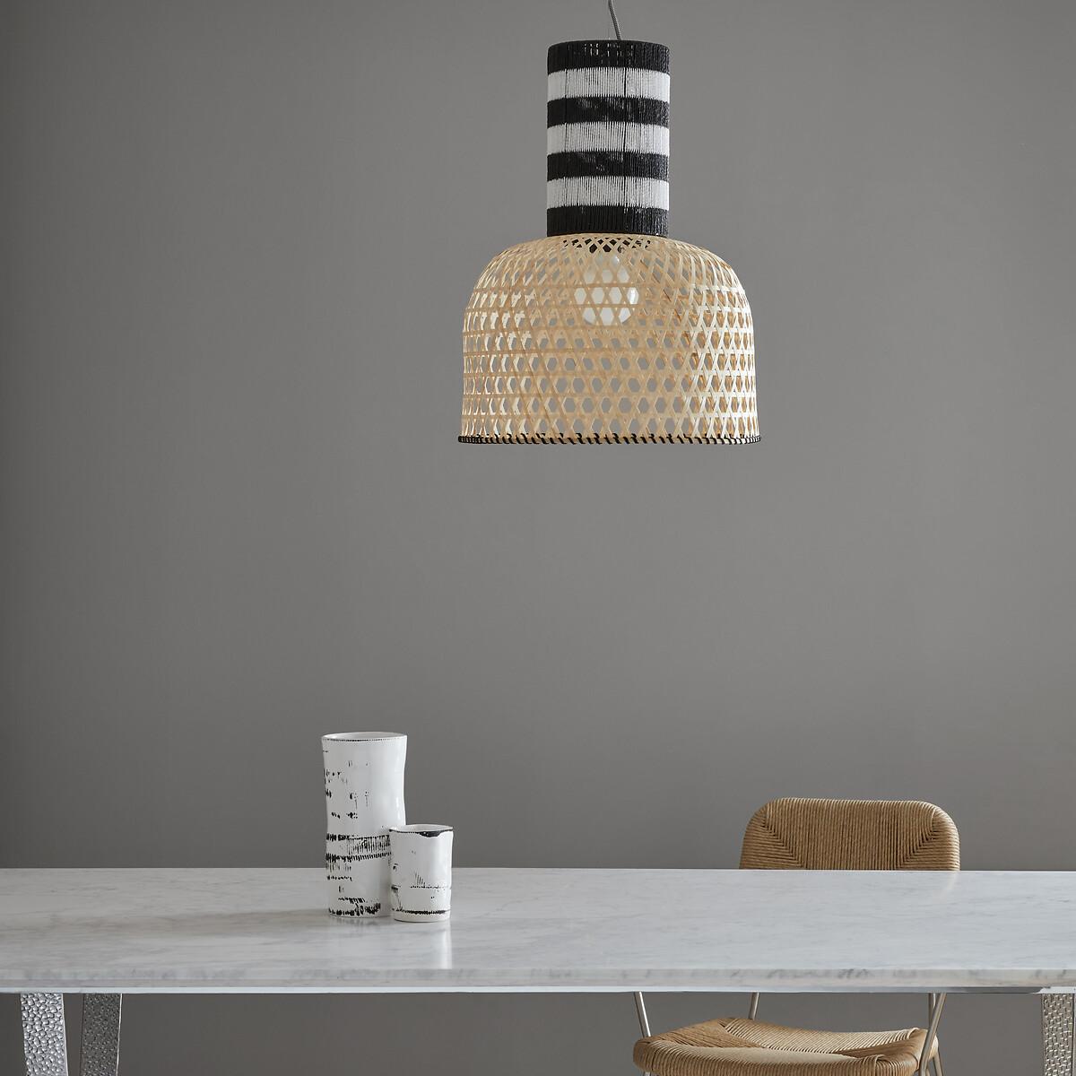 An original tribe of three lamps with bold, funky accents. Woven baskets in different sizes stack up to form unique creations, with lampshades in rattan, natural bamboo or black and white woven paper. The Tribe pendant lamp is part of the "Nomad Escape" collection designed by Otto, an agency founded by architect and designer Paola Navone. Led by Cristina Pettenuzzo and Domenico Diego, this collection has a bold and unique identity, transforming the home into an bright and positive oasis of well-being for all seasons. Product Details • Lampshade made from hand-woven natural bamboo stems • Tubular lamp head in hand-woven black and white paper • Black and white textile-sheathed power cable • Supports E27 bulb (not supplied) • For bulb (not included): LED 10W max. Dimensions • Overall diameter : 44cm • Total Height: 56.5cm • Diameter of the tubular lamp head: 17.5cm • Height of the tubular lamp head: 27.5cm • Cable length: 200cm • Weight: 1.1kg. Dimensions and weight of parcel • 1 parcel • L35 x H48 x D48cm. 2.7kg