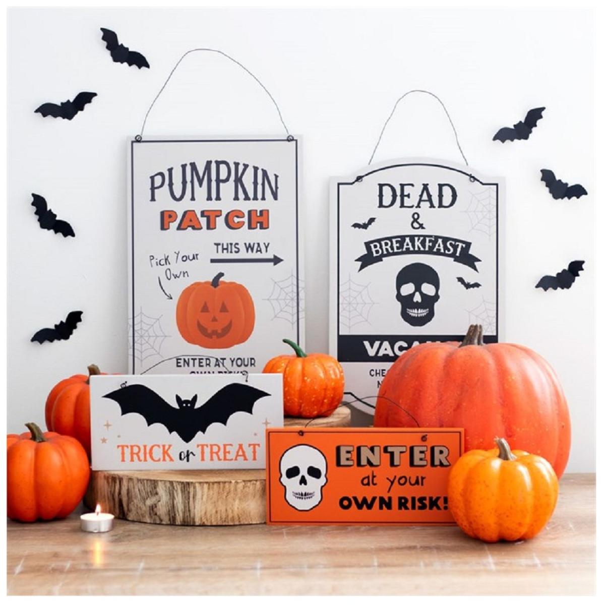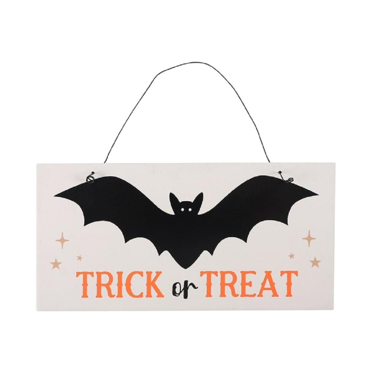 Hanging bat 'trick or treat' sign perfect for decorating at Halloween. Hang by itself on a door or make a feature wall with a selection of other Halloween signs and decorations.