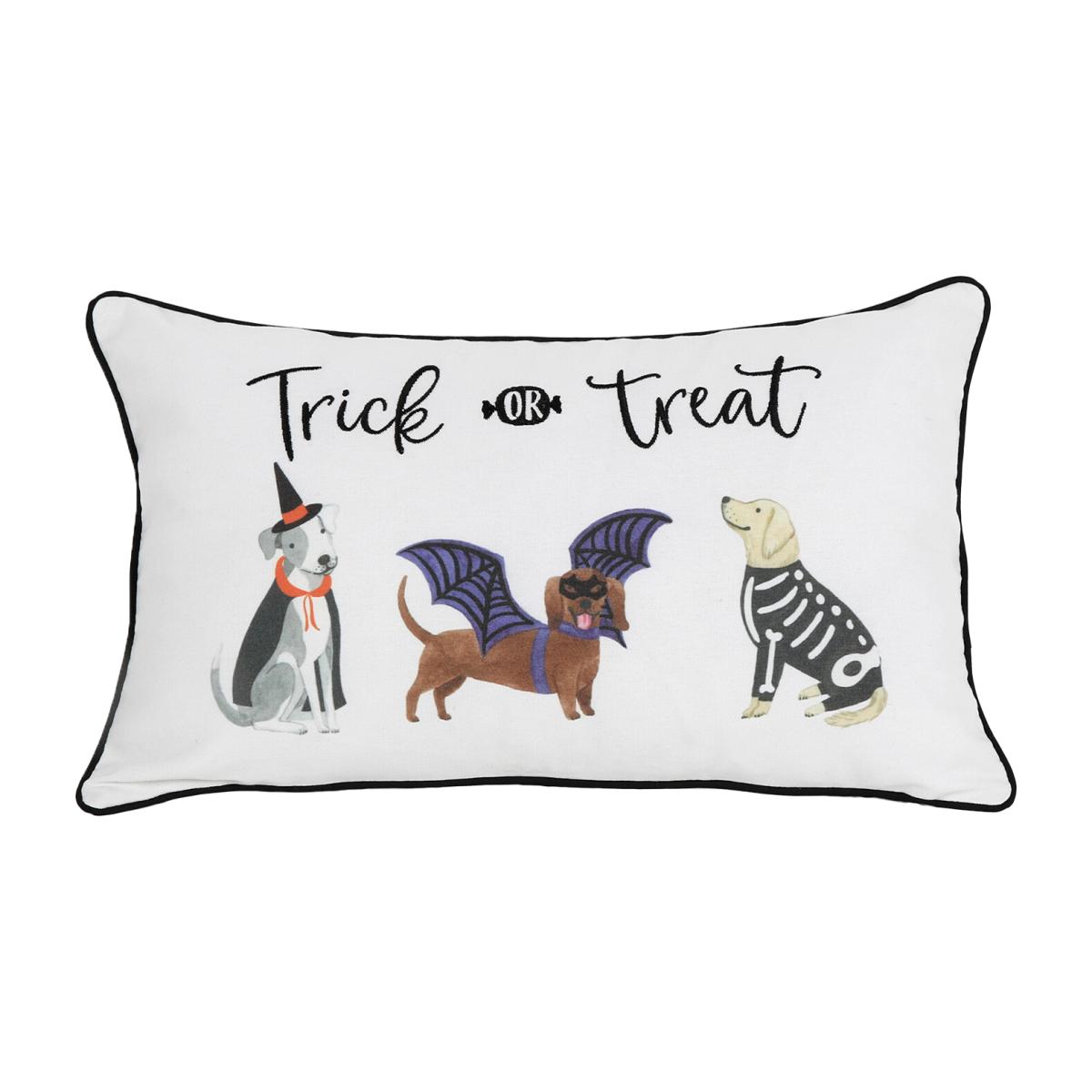 This Trick or Treat Cushion is perfect for any dog lovers or fans of the spooky season! With cursive calligraphy reading 'trick or treat', this comfy cushion also features three adorable pups in Halloween costumes! Finished with black piping to bring the whole look together, this cushion would look great on a chair in your living room for some seasonal decor.