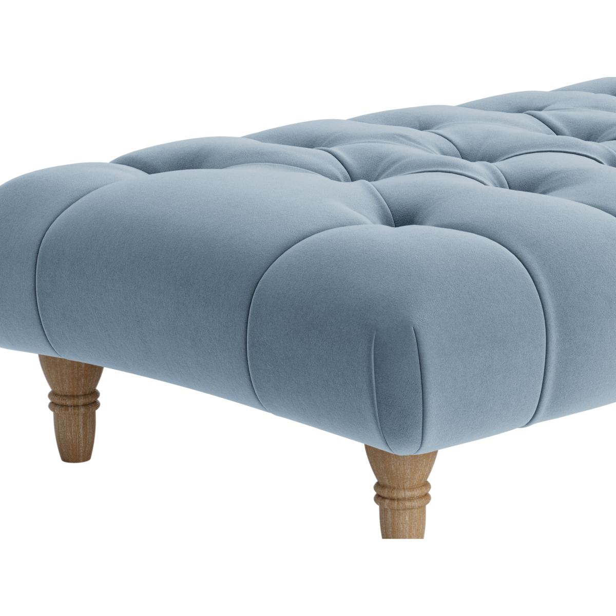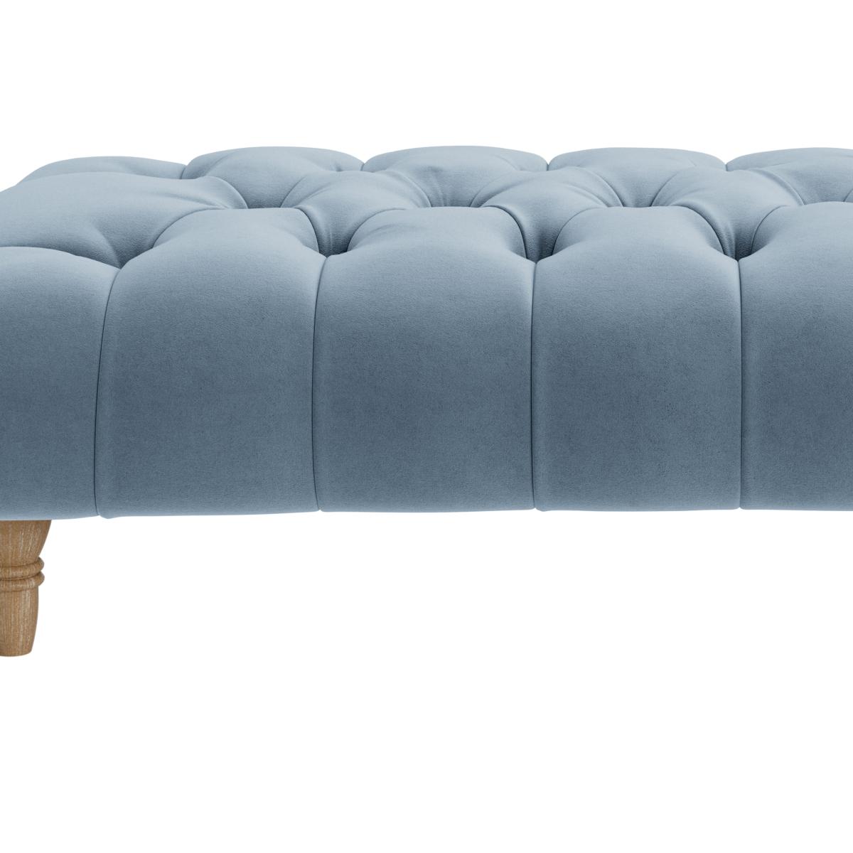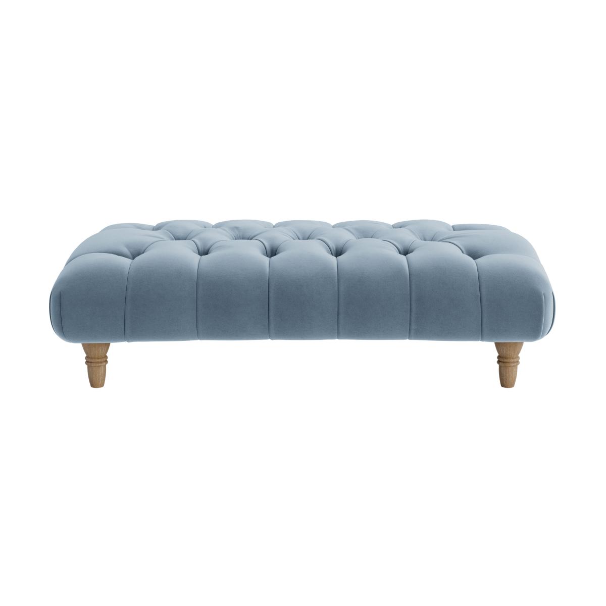 I love this footstool because of its versatile, timeless design and the plush, tufted upholstery that adds a touch of elegance. It works particularly well in relaxed, contemporary, or classic interiors where it can serve as extra seating or as a stylish footrest. The soft blue hue makes it an ideal accent piece for neutral palettes or light-coloured rooms, bringing a subtle pop of colour without overpowering the space. For styling, try pairing it with a cosy sofa or a statement armchair, and consider layering with textured cushions or throws nearby to create a welcoming, lived-in vibe. Its compact size also means it’s easy to move around, making it practical for multi-use spaces such as living rooms, bedrooms or even dressing areas.