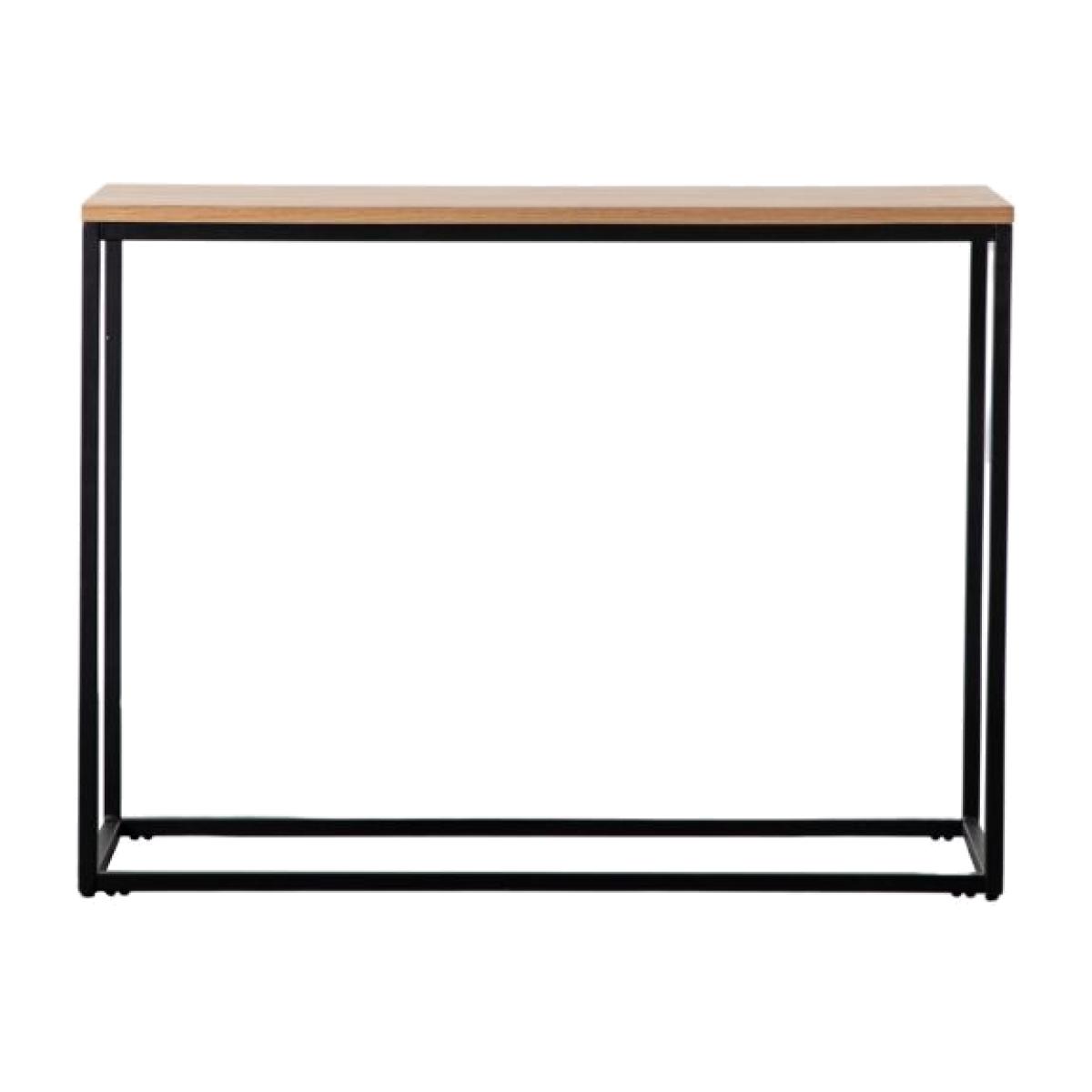 This stunning console table combines clean sharp lines with a natural oak veneer top and a matt black metal base to offer crisp contemporary style. It is part of a collection which offers a range of tables plus a display unit. The collection is part of our Packed-Flat Design Project, offering easy delivery to any room in any property, whilst reducing the packaging needed. Easy assembly is required, but all the tools needed are supplied. Material:Oak Veneer. Colour/Finish: Brown. Table Shape: Rectangle.
