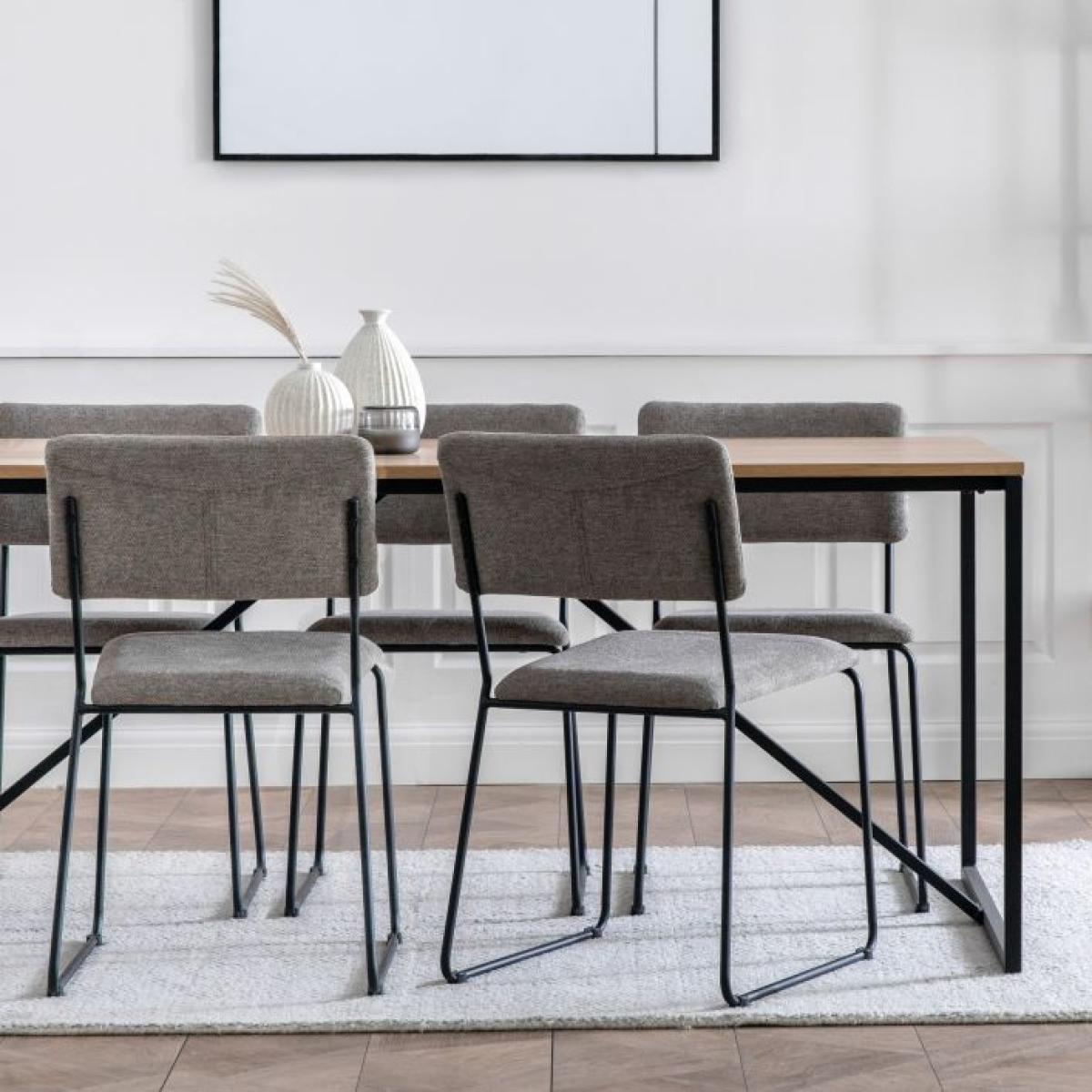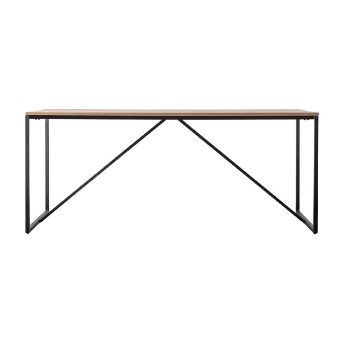 This stunning dining table combines clean sharp lines with a natural oak veneer top and a matt black metal base to offer crisp contemporary style. It is part of a collection which offers a range of tables plus a display unit. The collection is part of our Packed-Flat Design Project, offering easy delivery to any room in any property, whilst reducing the packaging needed. Easy assembly is required, but all the tools needed are supplied. Material:Oak Veneer. Colour/Finish: Natural. Table Shape: Rectangle.