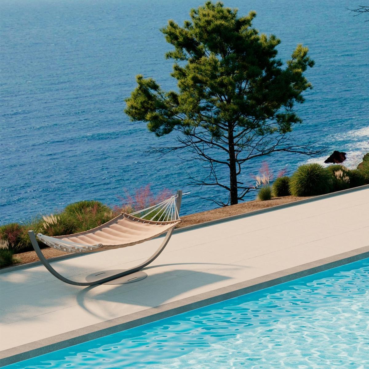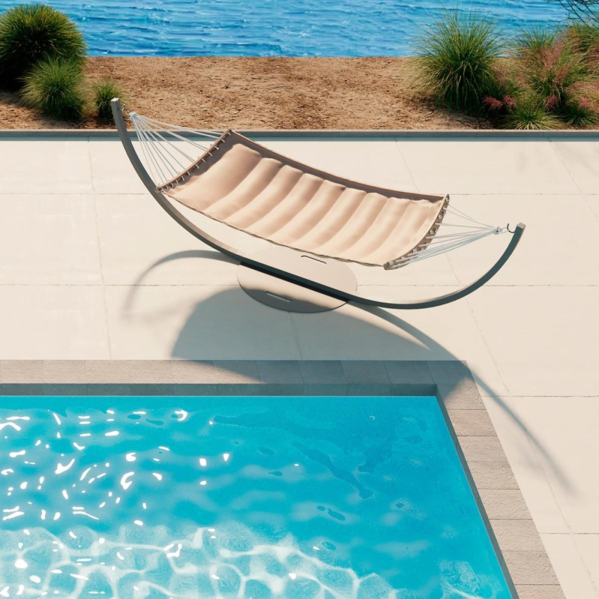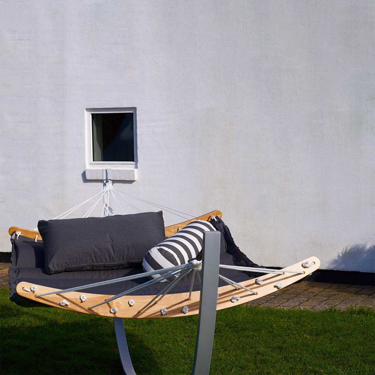 Hang out in style with the Outdoor Double Hammock from TRIMM Copenhagen. Hook up just about anywhere, in between a few trees to hibernate away in shade or stand-alone with the matching hammock frame out in the garden to catch the sunshine during that sizzling summer. Integrated moulded cushion, filled with foam for extra comfort, an afternoon siesta may be on the agenda. Perfection! Room for 2. Chill out with your partner; summer or winter and watch the world pass by. As the fabric is water repellent, this also makes a great option for the poolside. With multiple colours available, you'll be swaying between which is your favourite!.