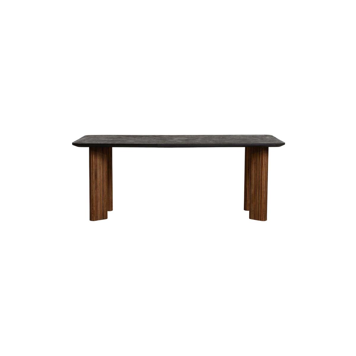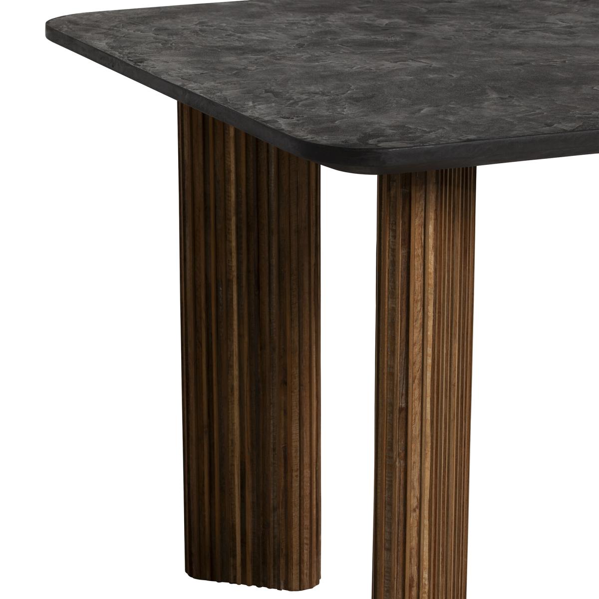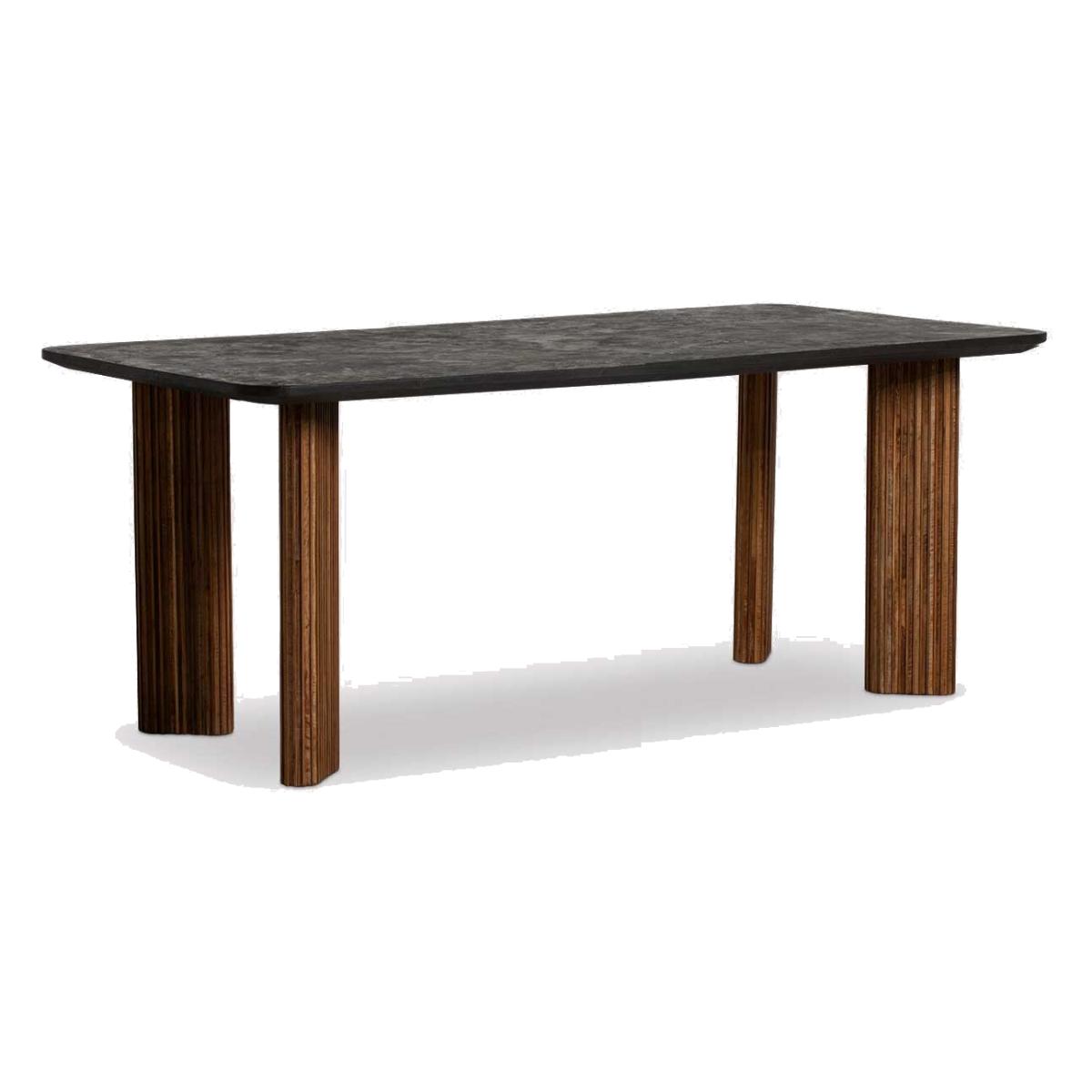 Introducing the Trinidad Reclaimed Teak Wood Rectangular Dining Table ndash; a testament to rustic elegance. Crafted from reclaimed teak wood, it embodies eco-conscious craftsmanship. The striking black tabletop exudes sophistication, perfectly complementing the fluted wood legs. Elevate your dining experience with the natural beauty and timeless charm of this exquisite table, adding a touch of rustic refinement to every meal.